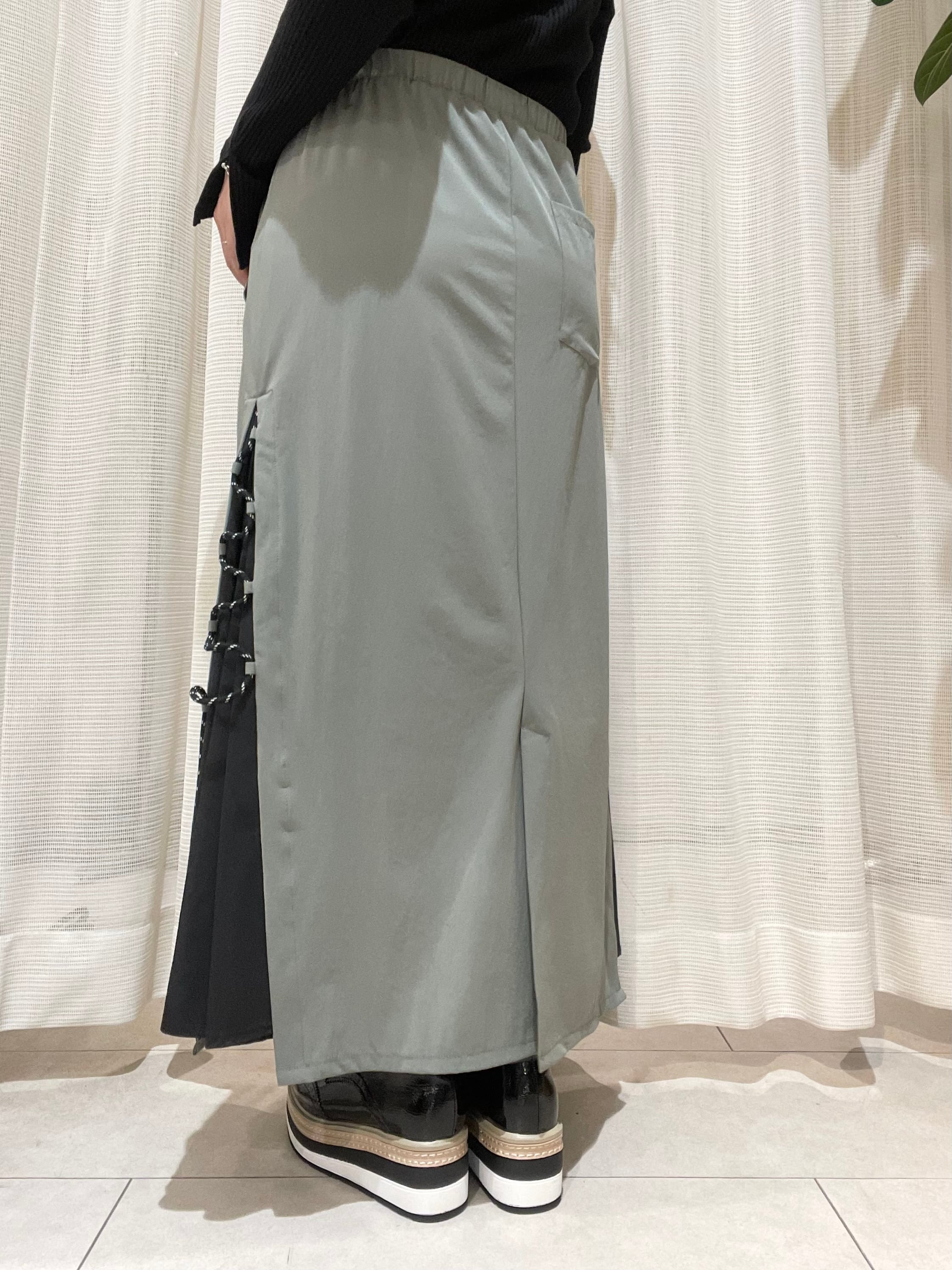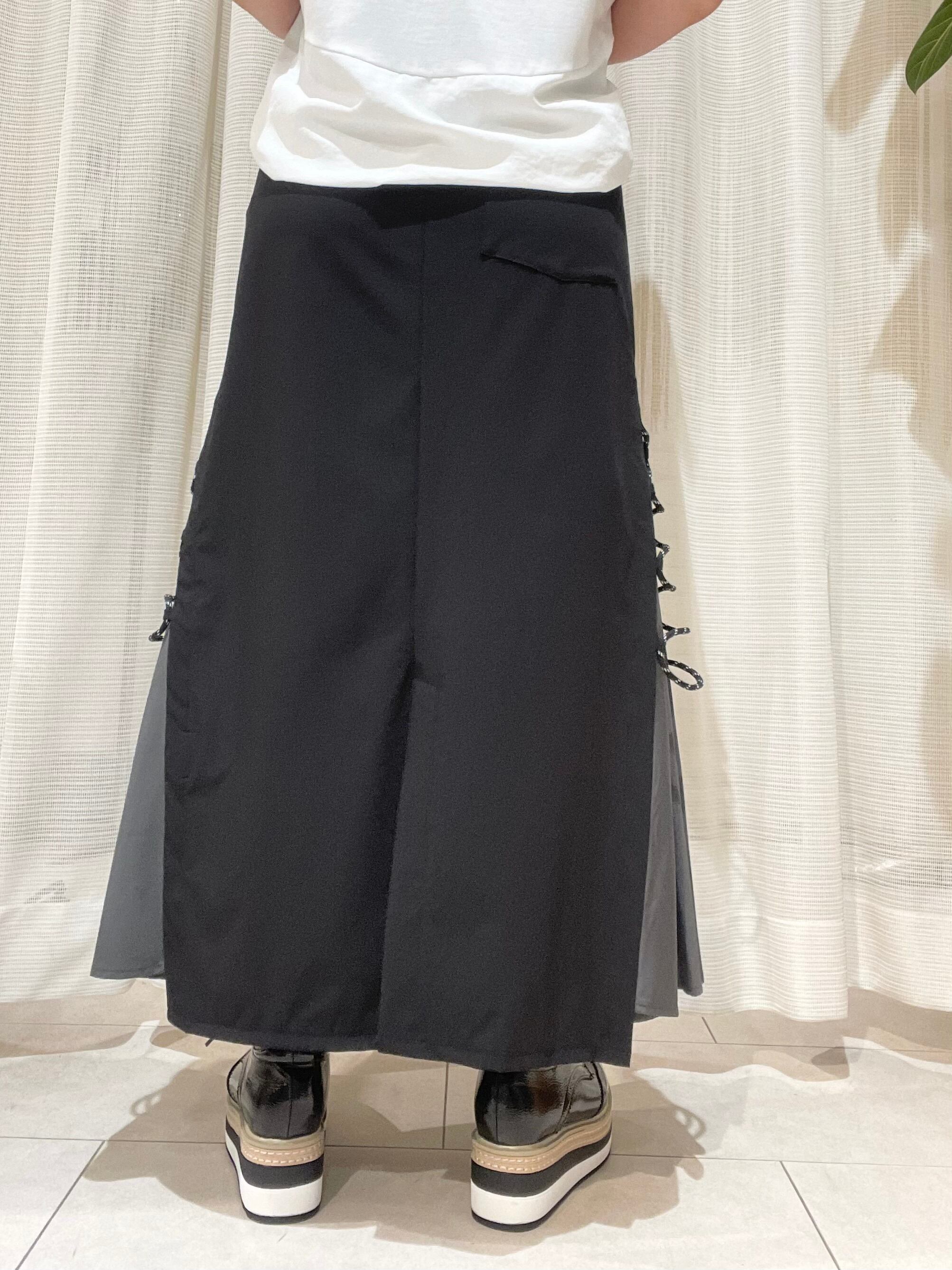 ナイロン素材で軽量の履きやすいスカート。カーブデザインになったコードの紐がオシャレで、紐部分を広げていただくと配色部分のカラーがはっきりと見えて雰囲気を変えていただけます。