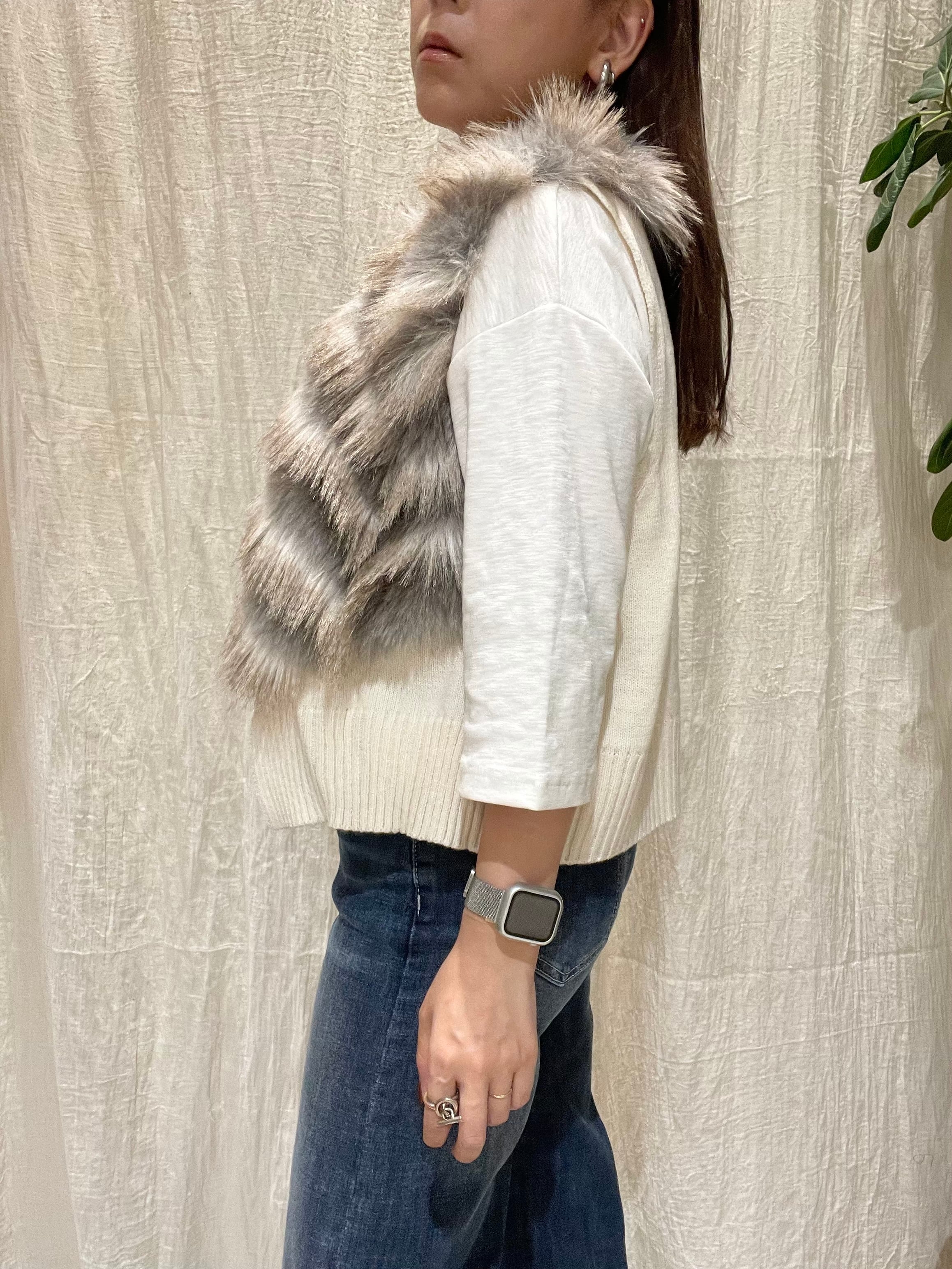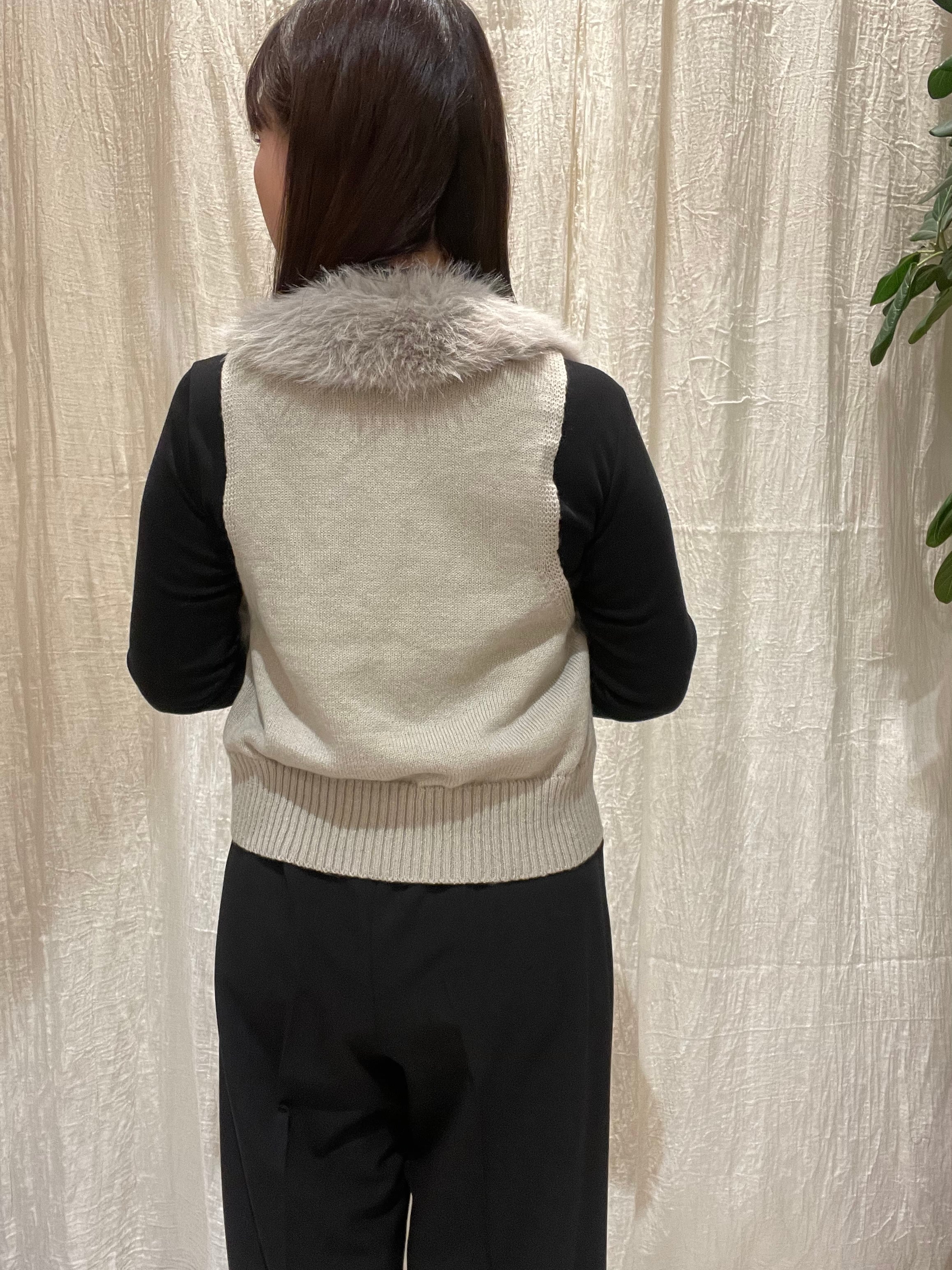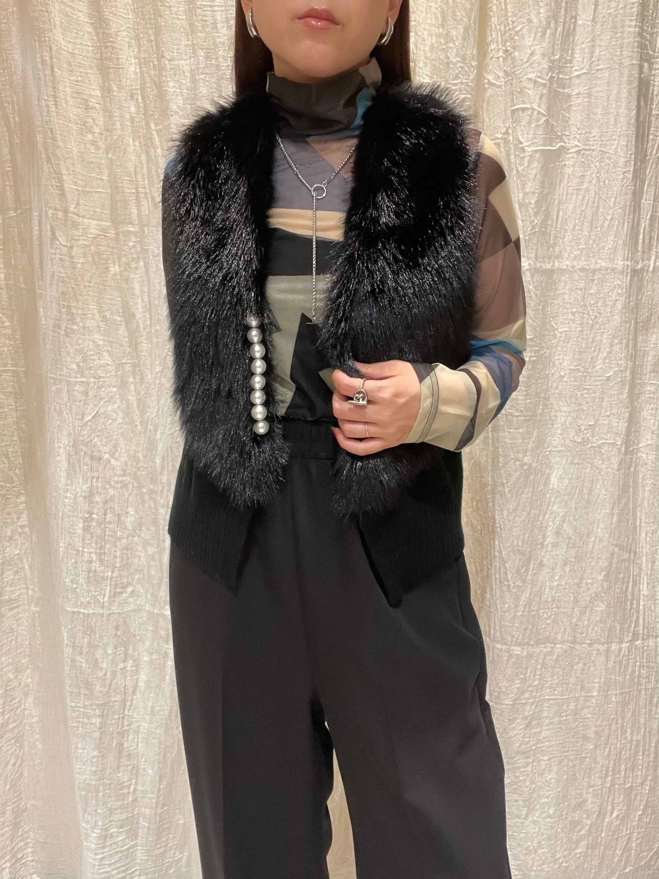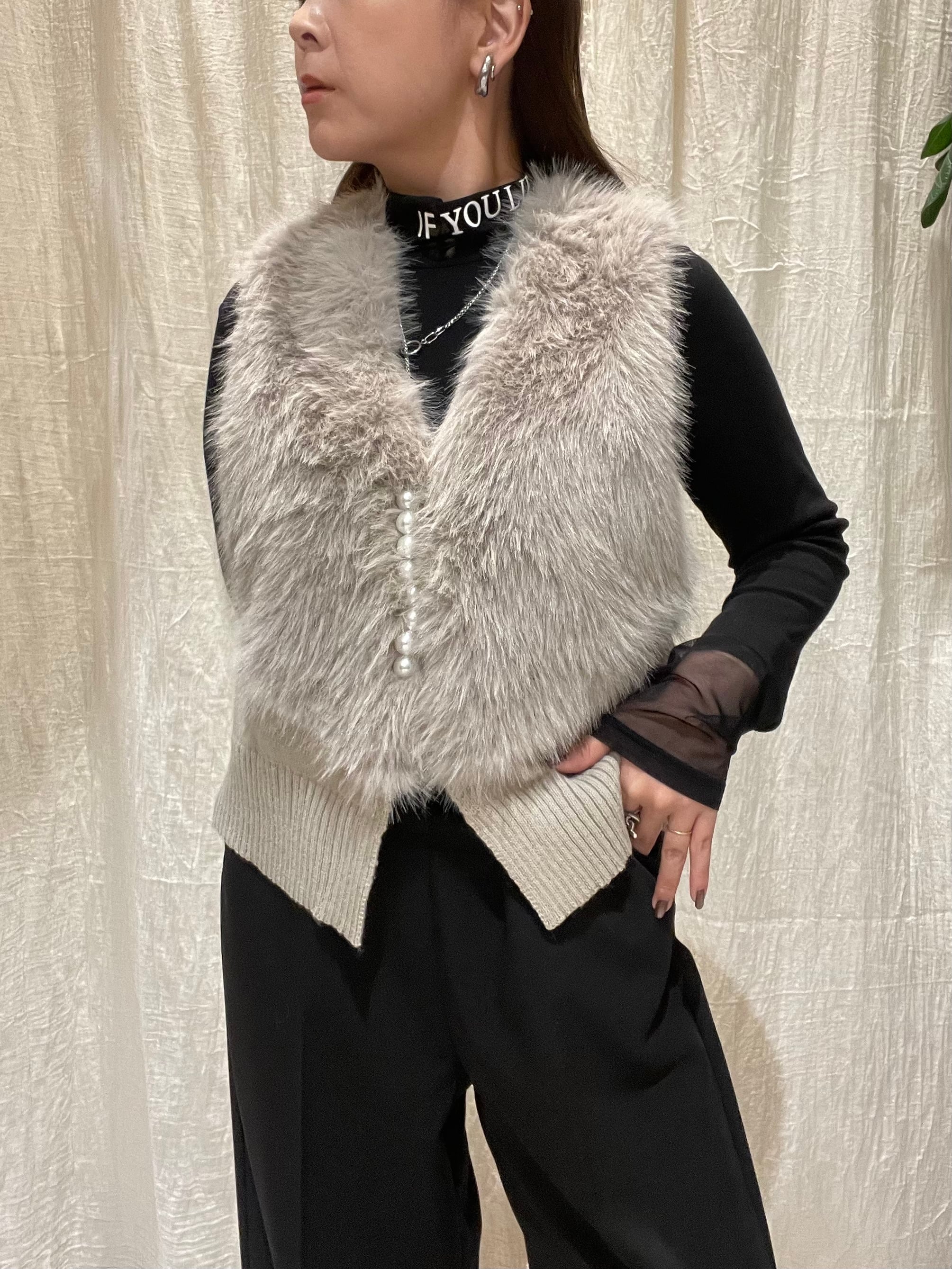 フロントにパールボタンをあしらったファーベスト。背中部分はニットになっている為、すっきりとしたシルエットで着られます。