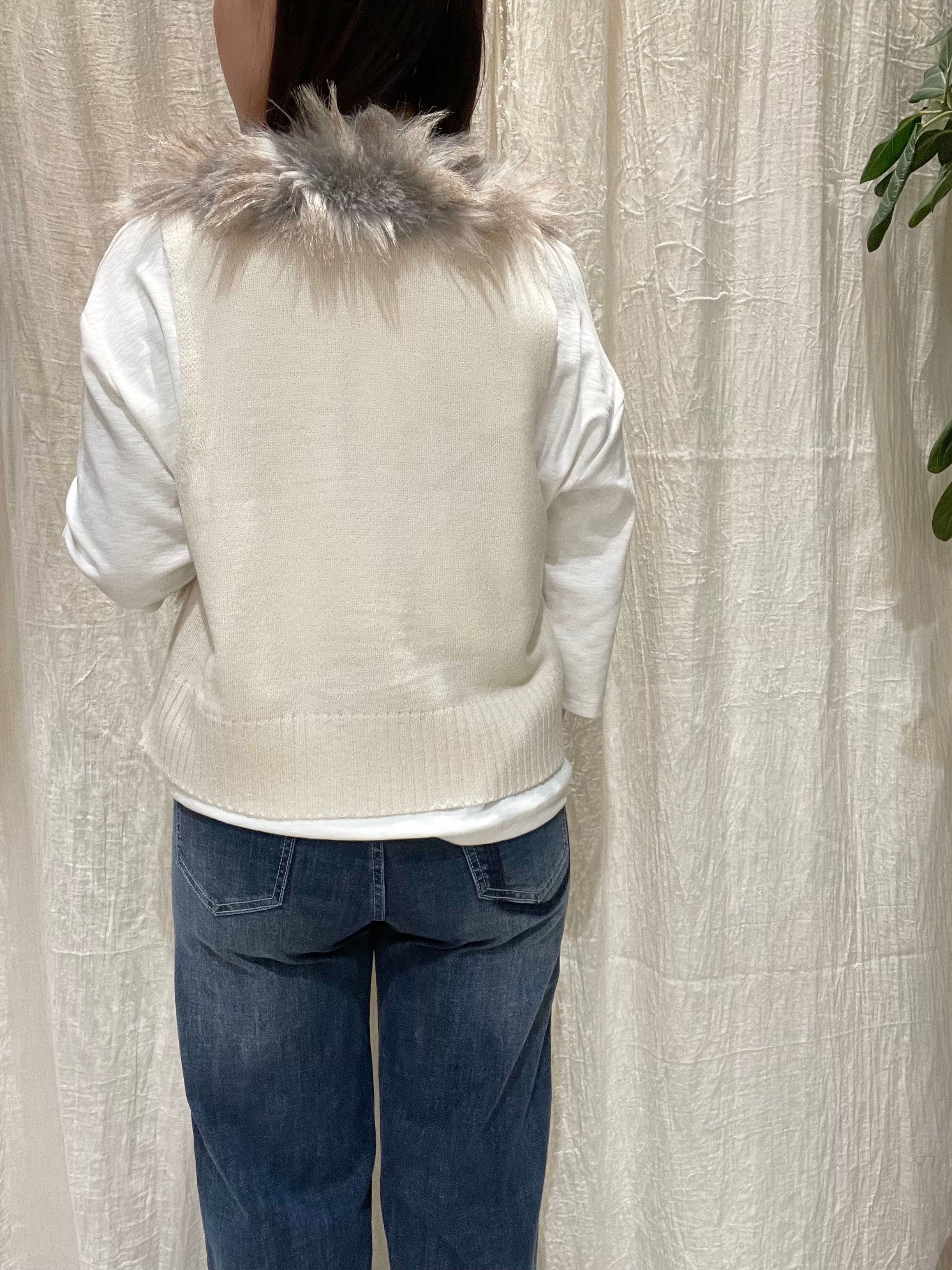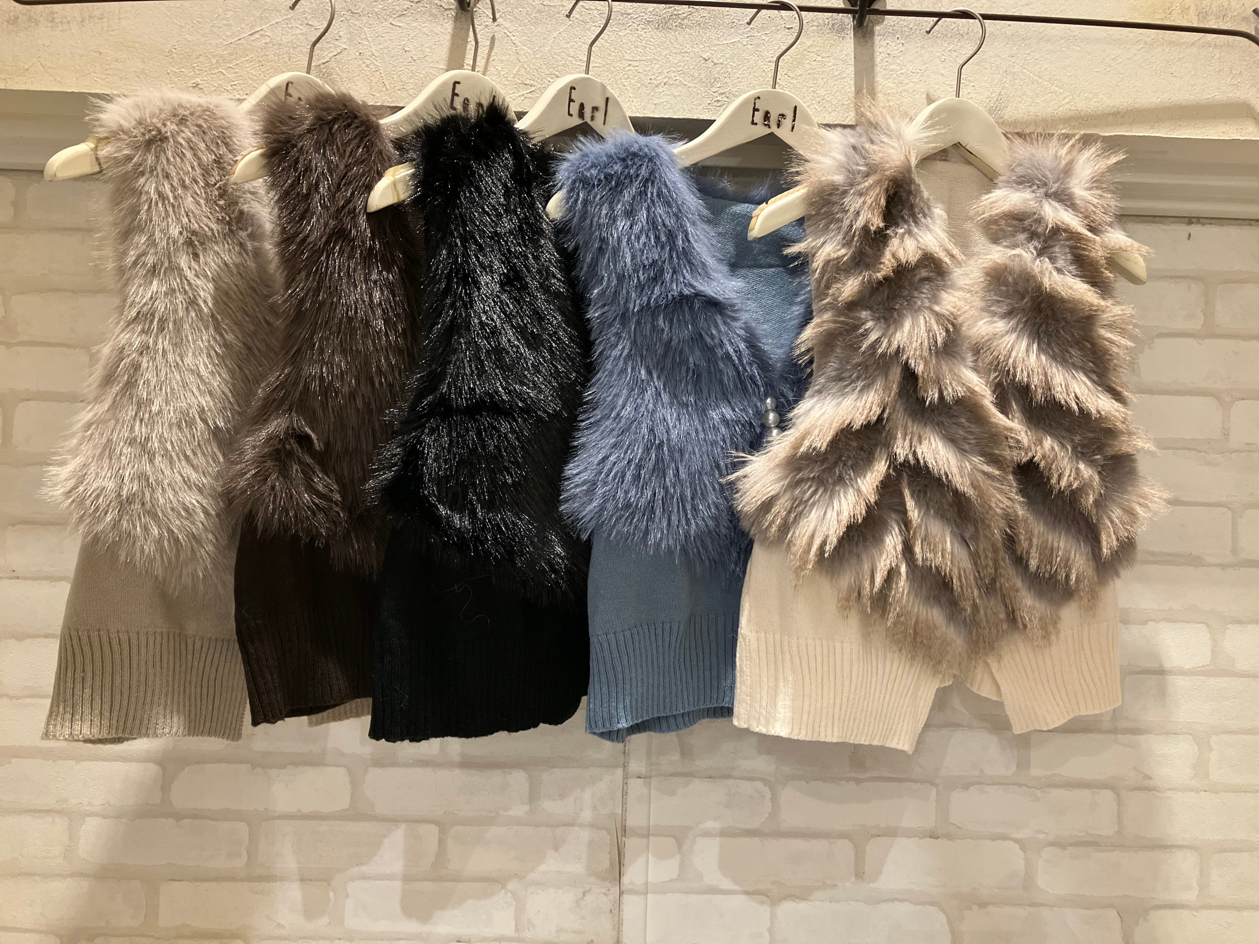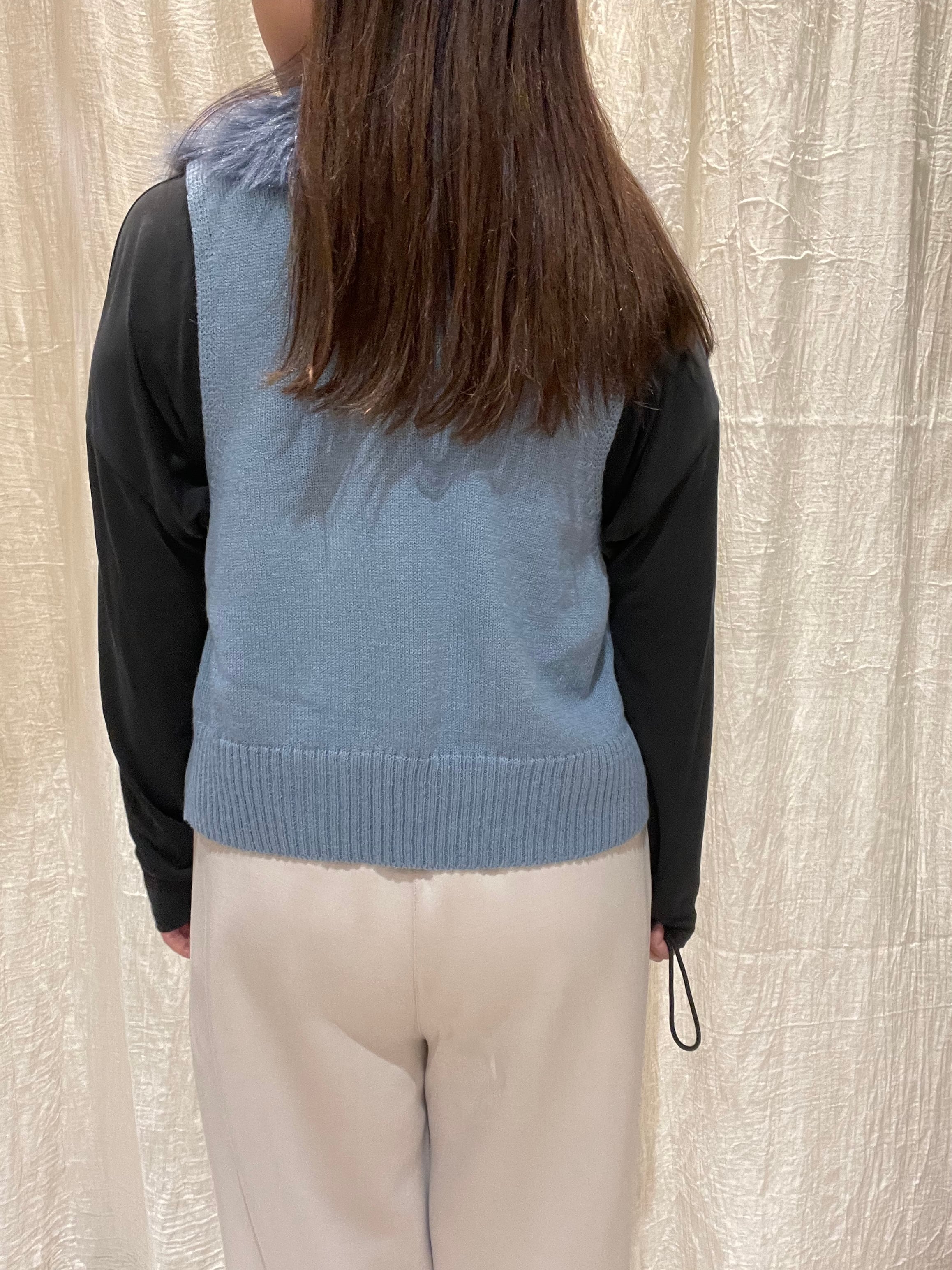 フロントにパールボタンをあしらったファーベスト。背中部分はニットになっている為、すっきりとしたシルエットで着られます。