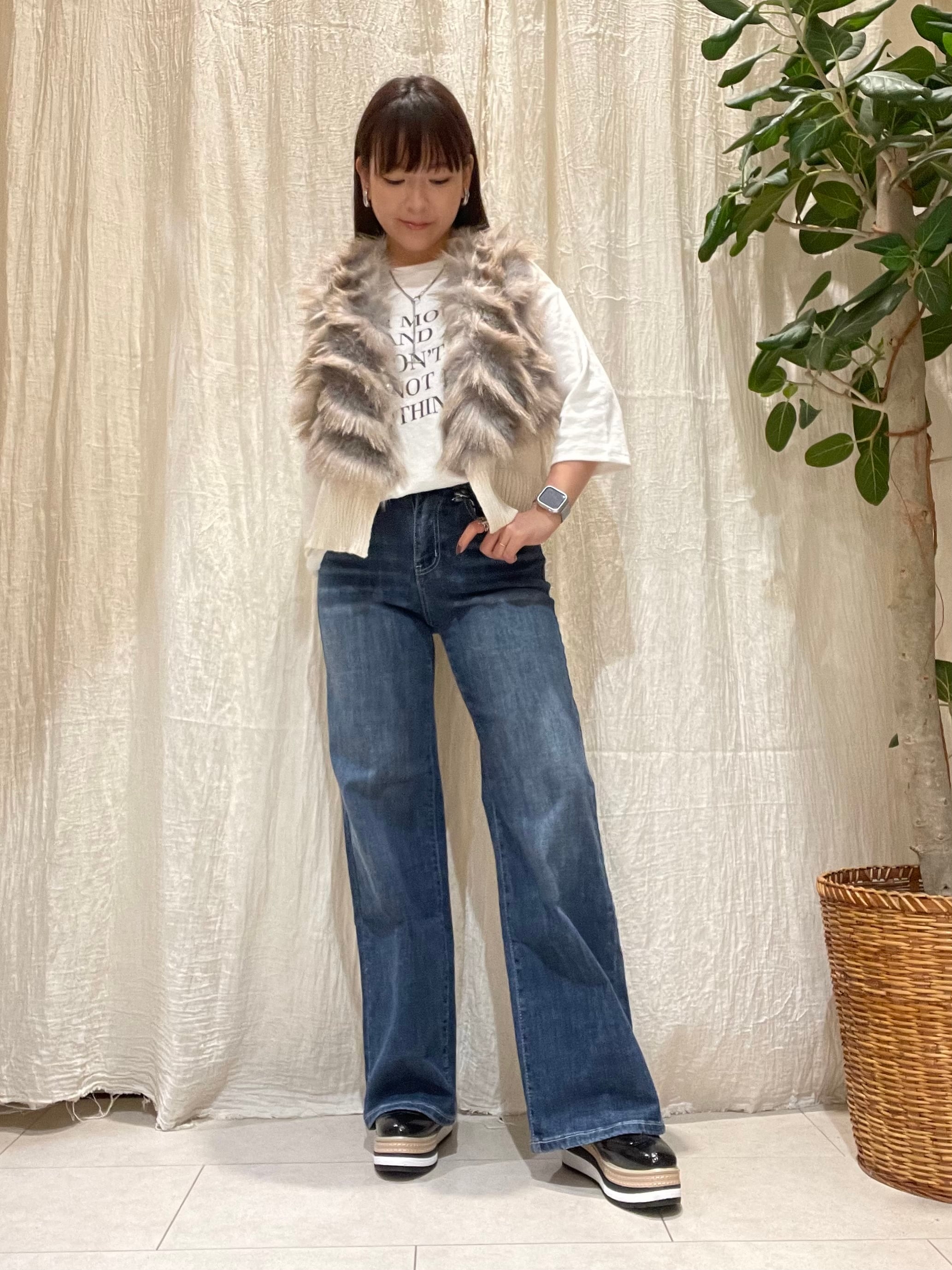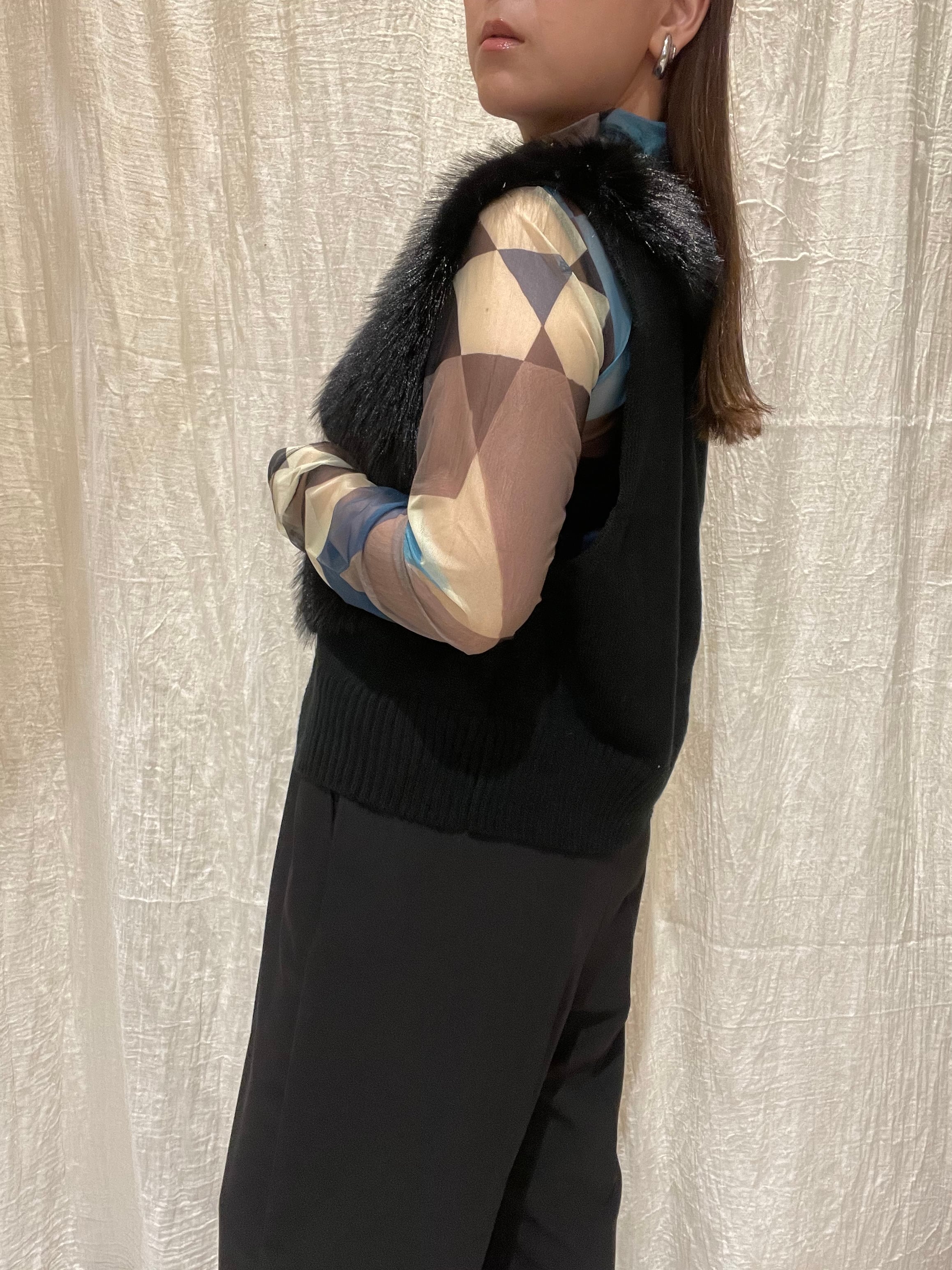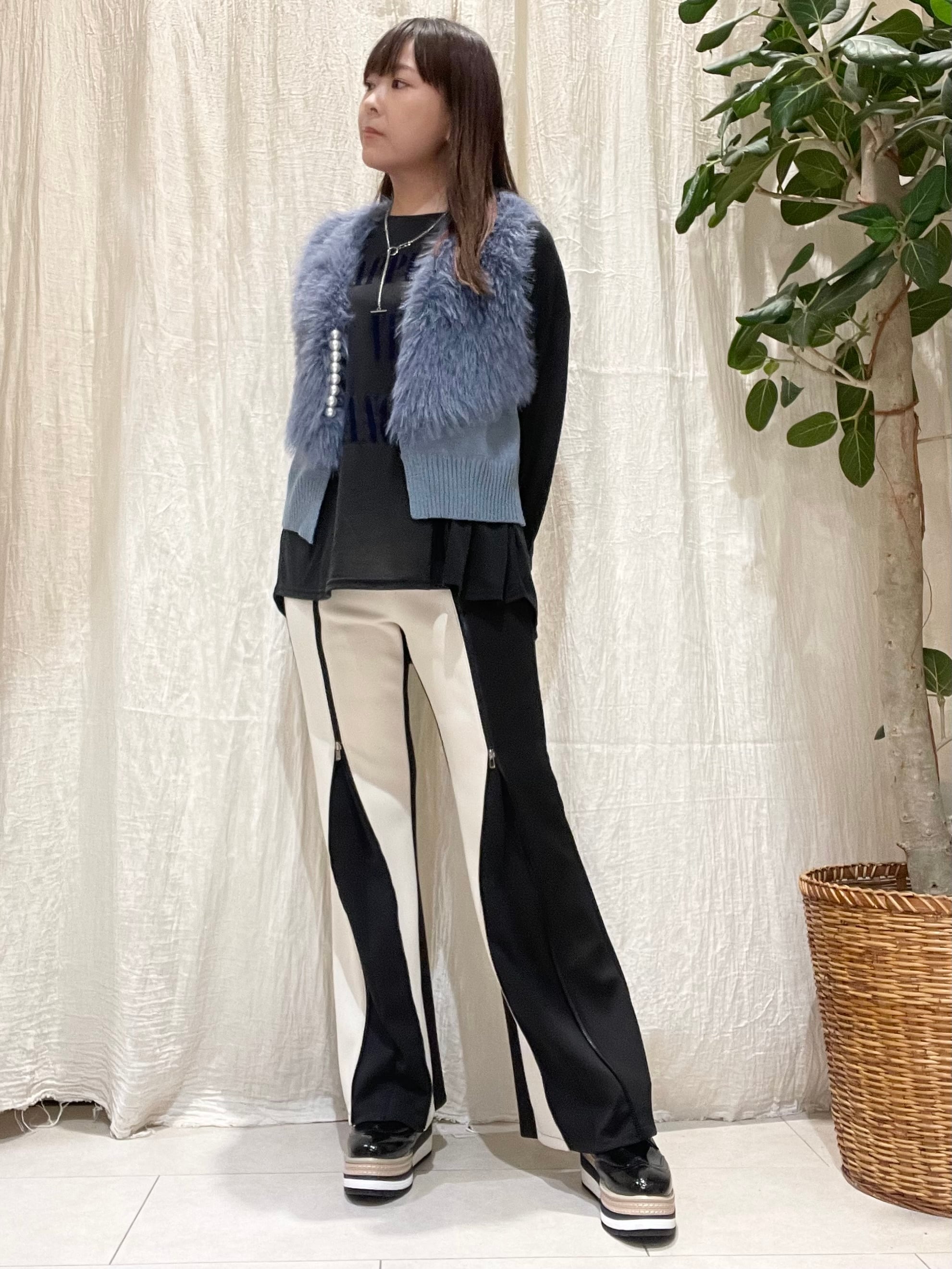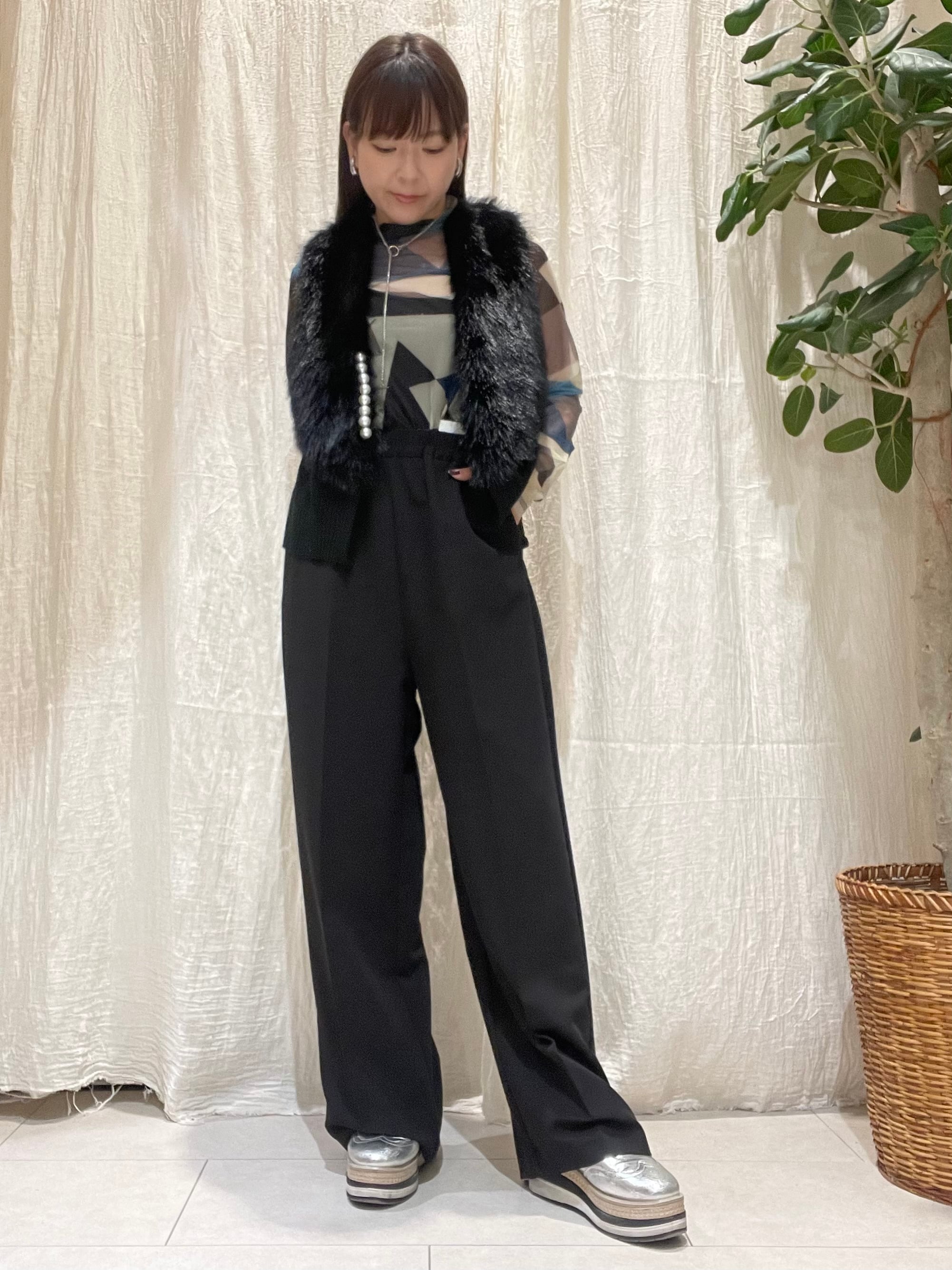フロントにパールボタンをあしらったファーベスト。背中部分はニットになっている為、すっきりとしたシルエットで着られます。