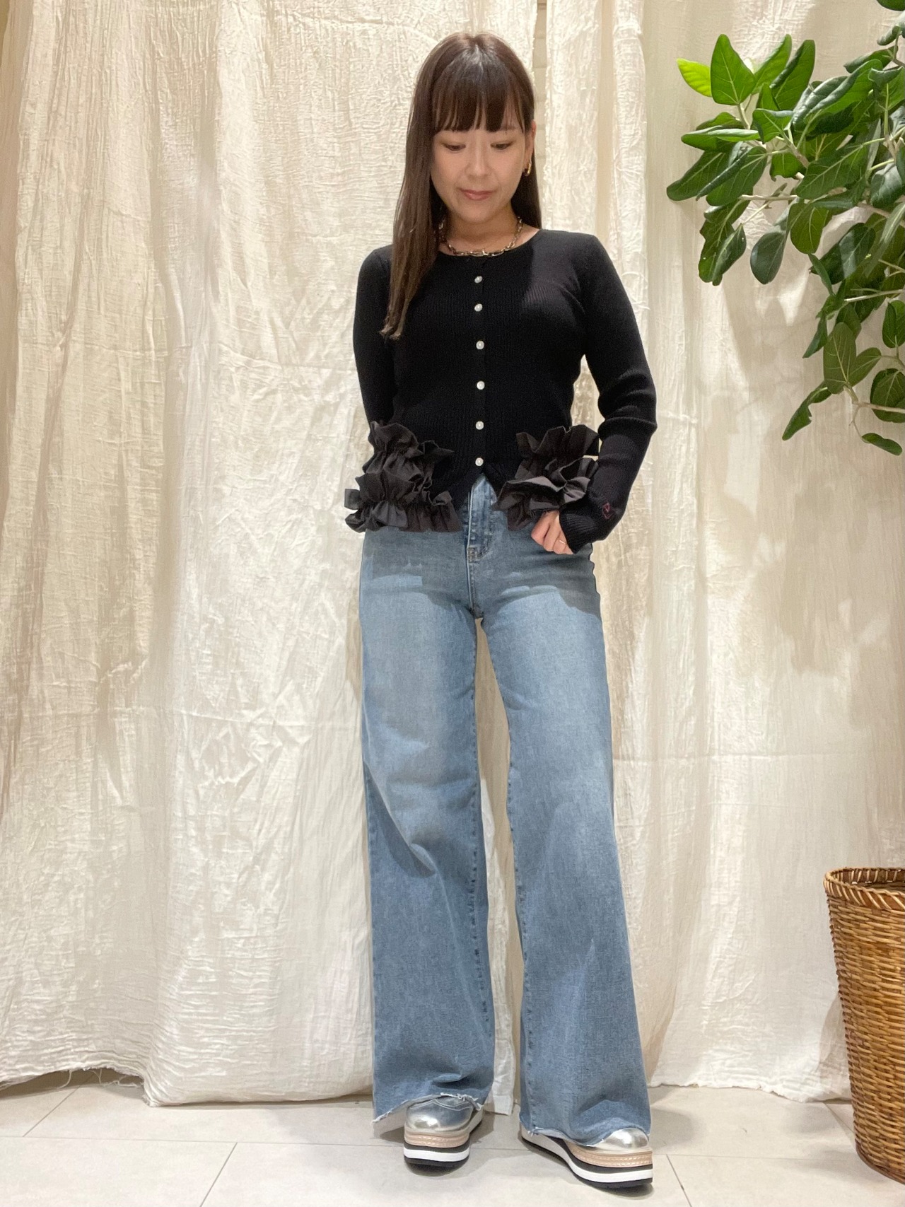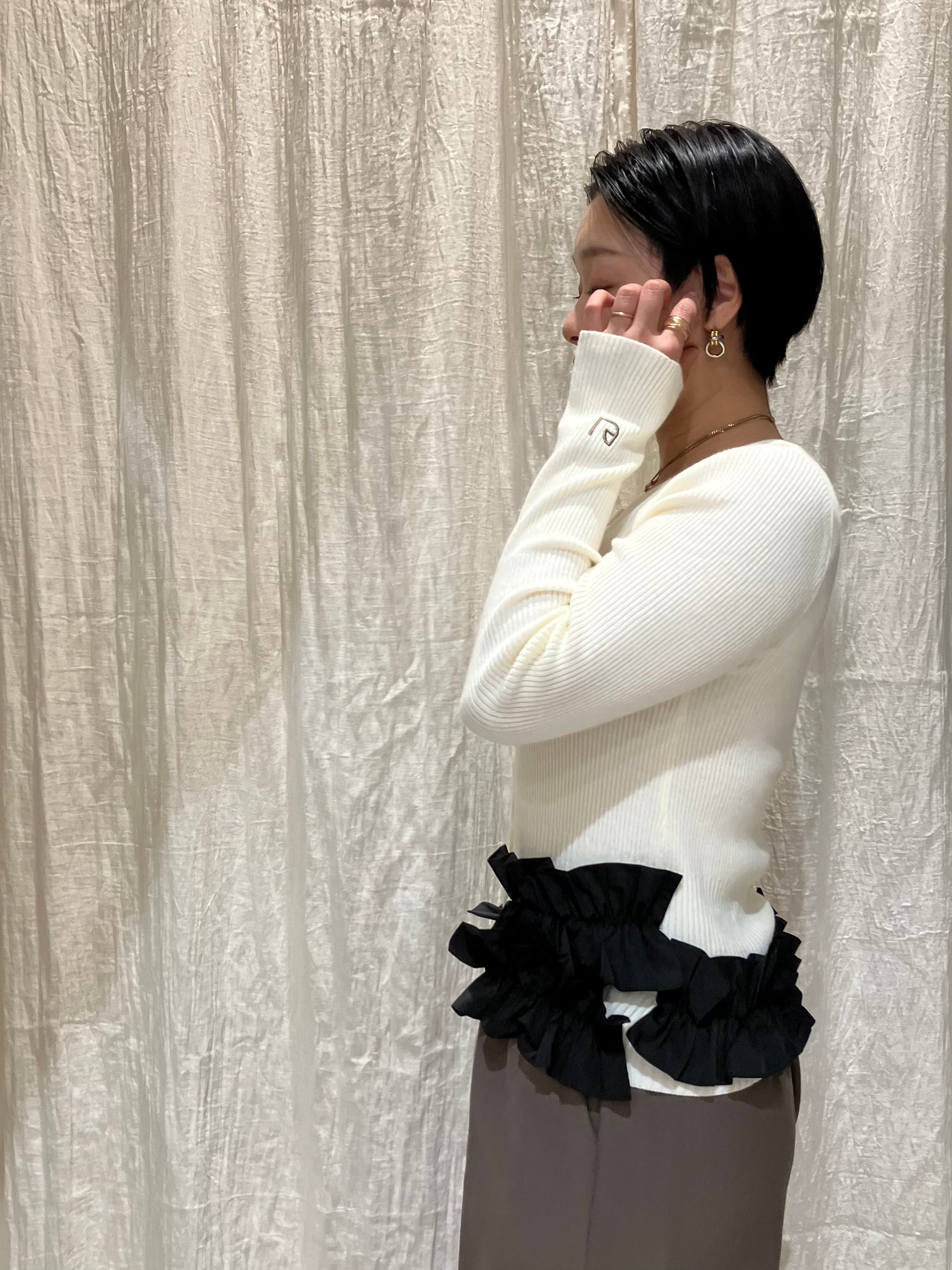 フリルはランダムウエーブなデザインでモードな印象。腰回りをカバーしたメリハリのあるシルエットで、カジュアル~フェミニンなスタイルまで着こなしを楽しめます。