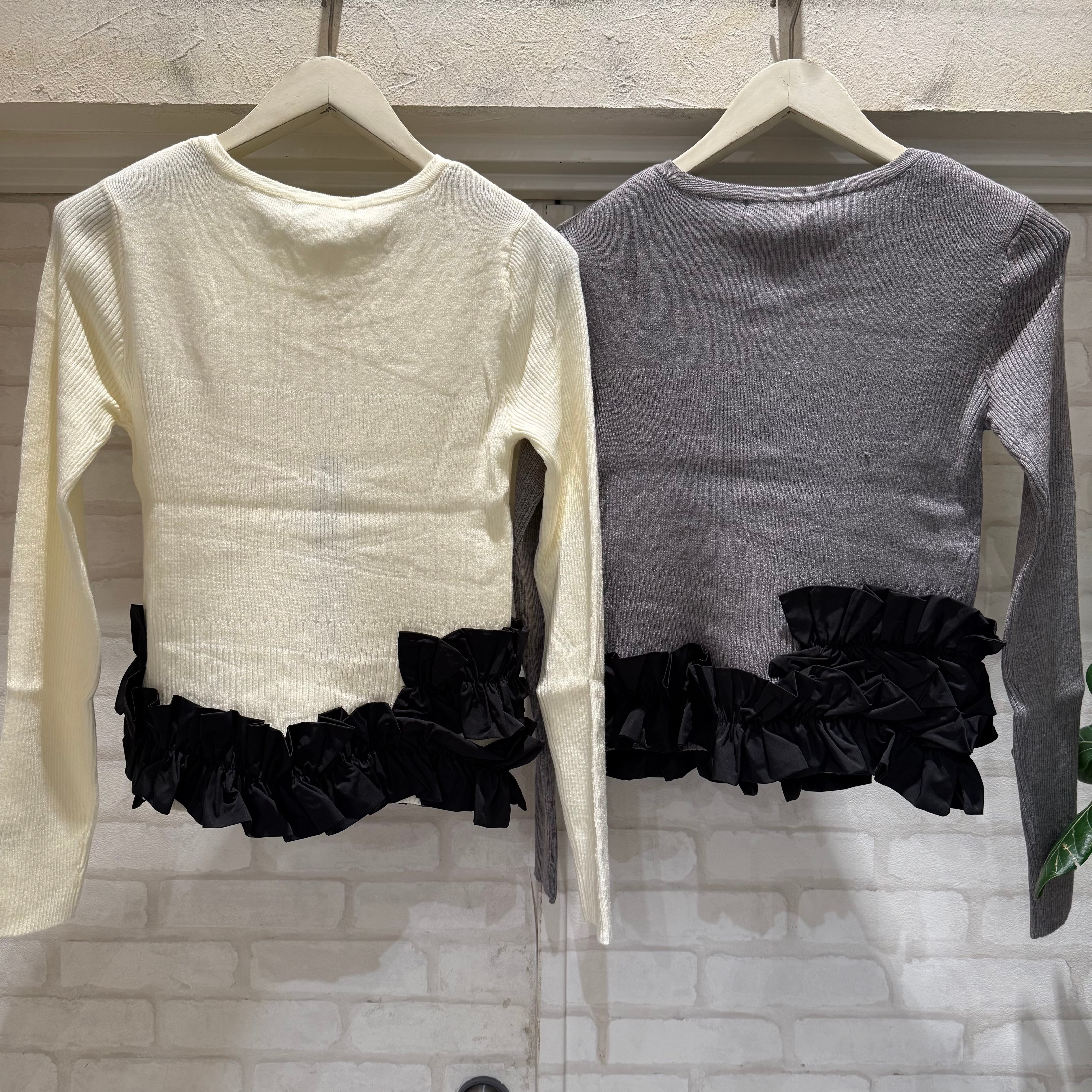 もちっとした肌触りが心地よいリブニットにデコラティブなフリルデザインが映えるニットカーディガン。