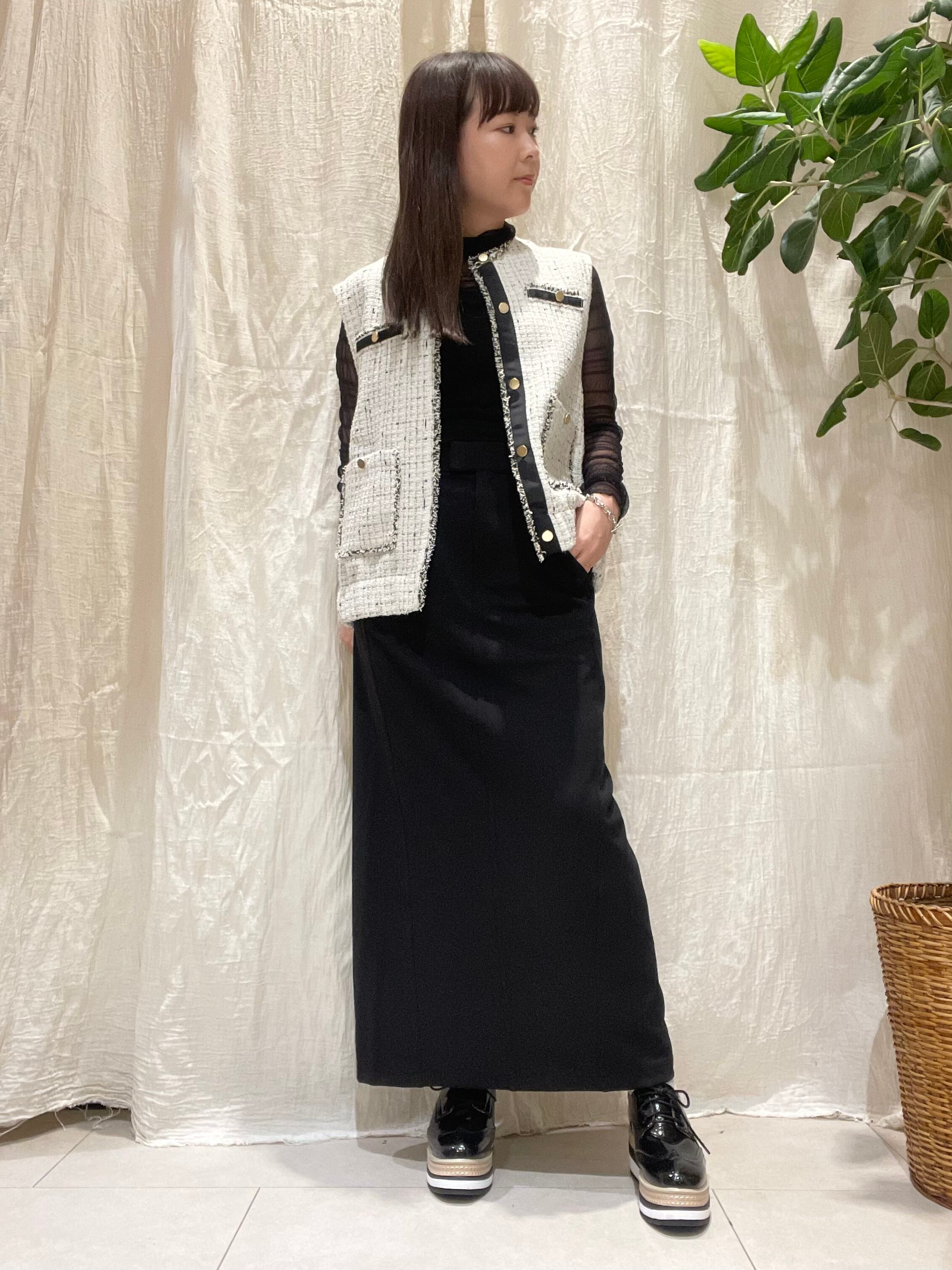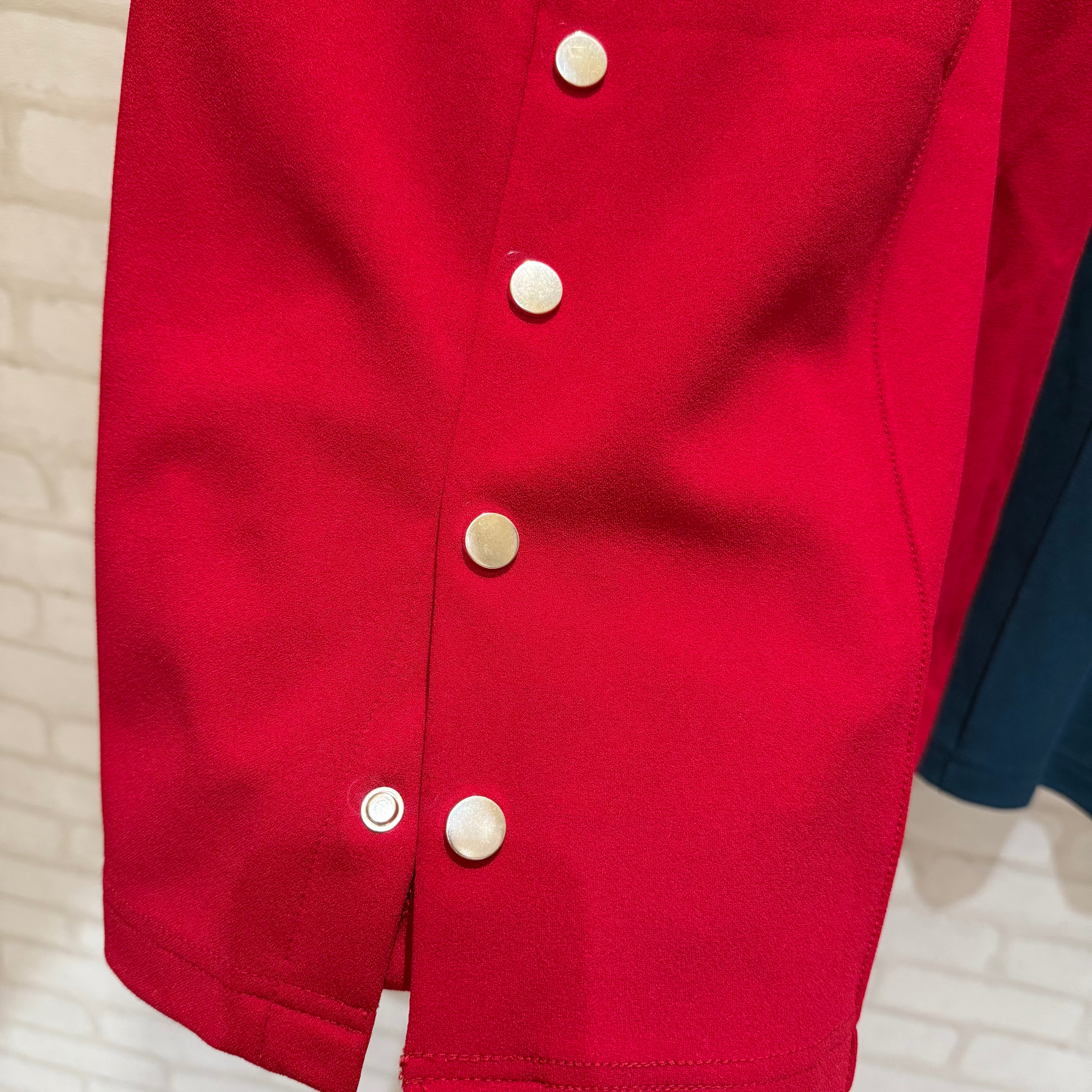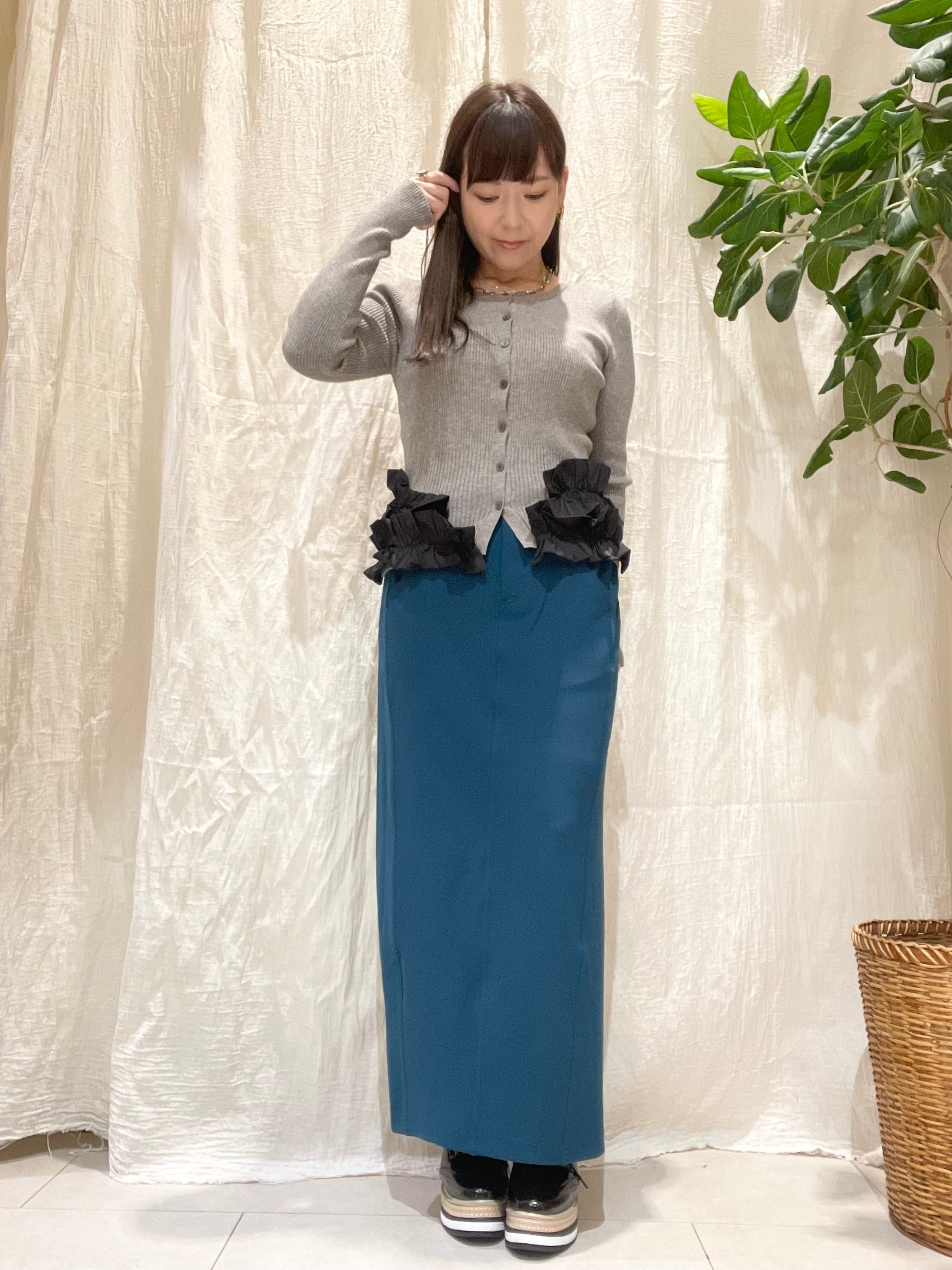 ストレッチの効いたジョーゼット素材で履き心地も軽いです。後ろの裾にはボタンがついていて開けるとスリットが入れられるデザインです。カジュアルにも綺麗めにも合わせやすいスカートです。ウエストは後ろがゴムになっていてベルトループもついています。