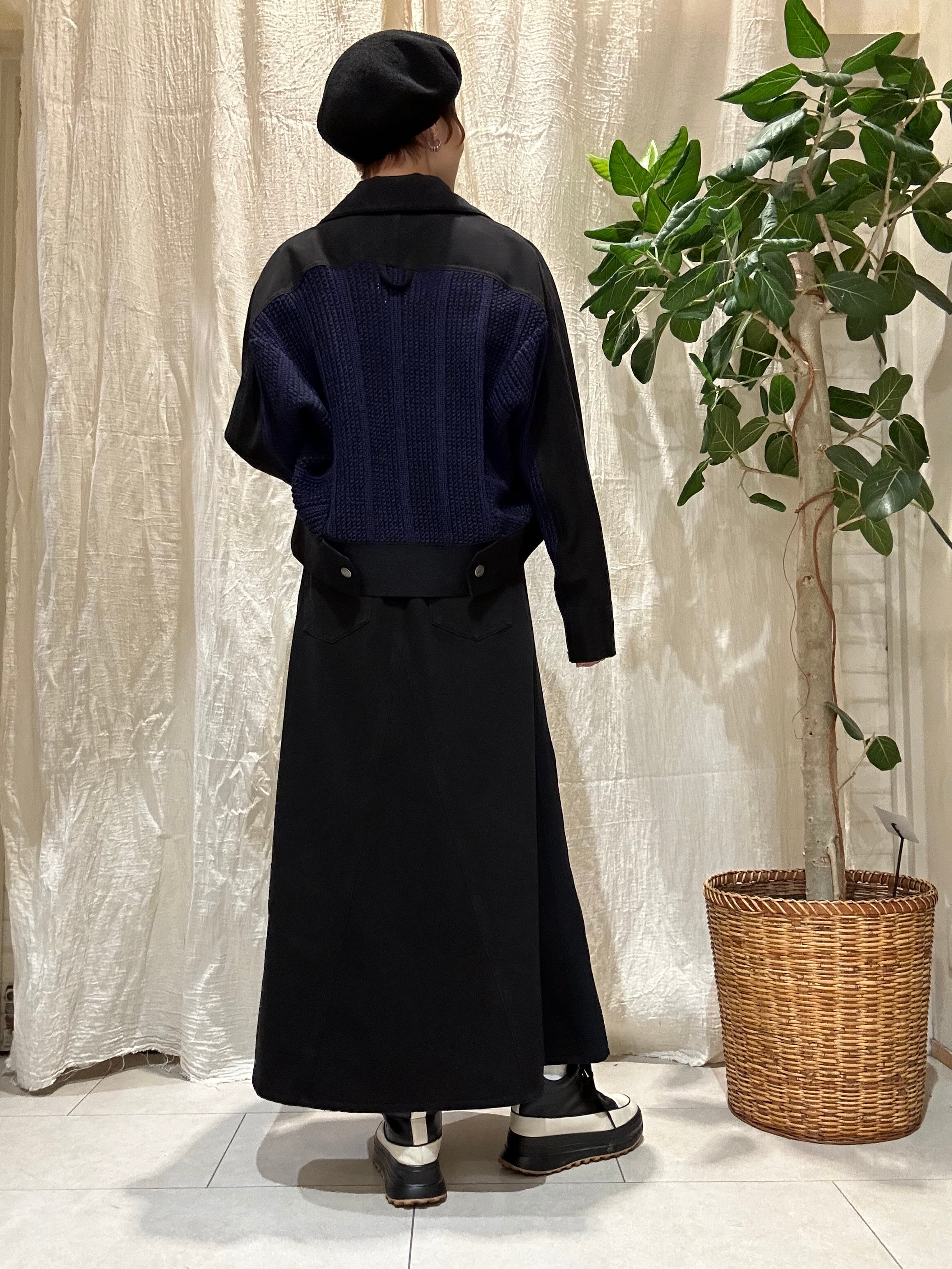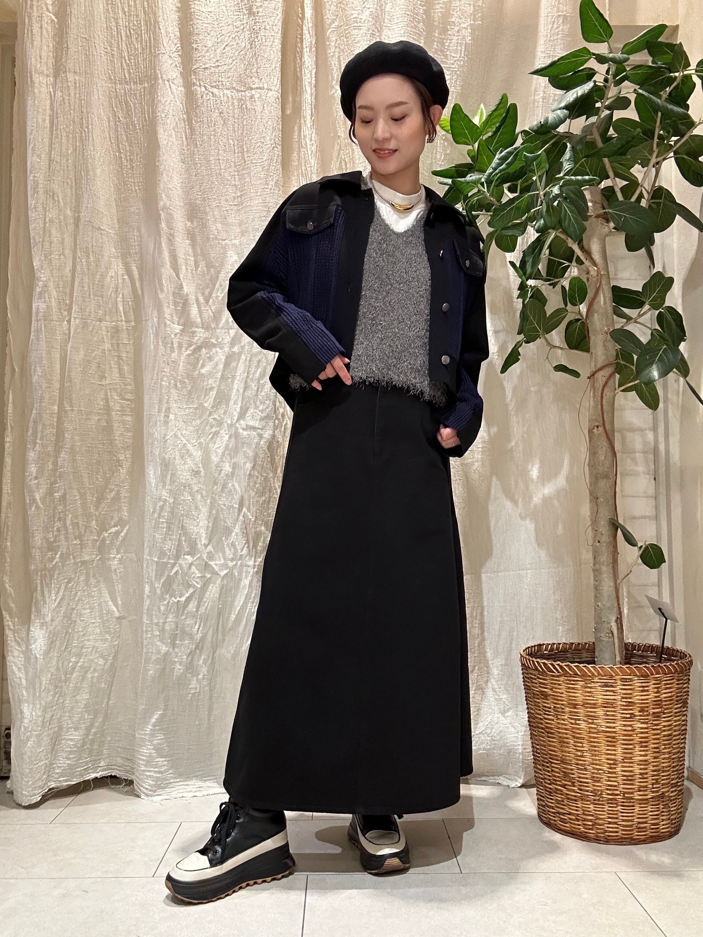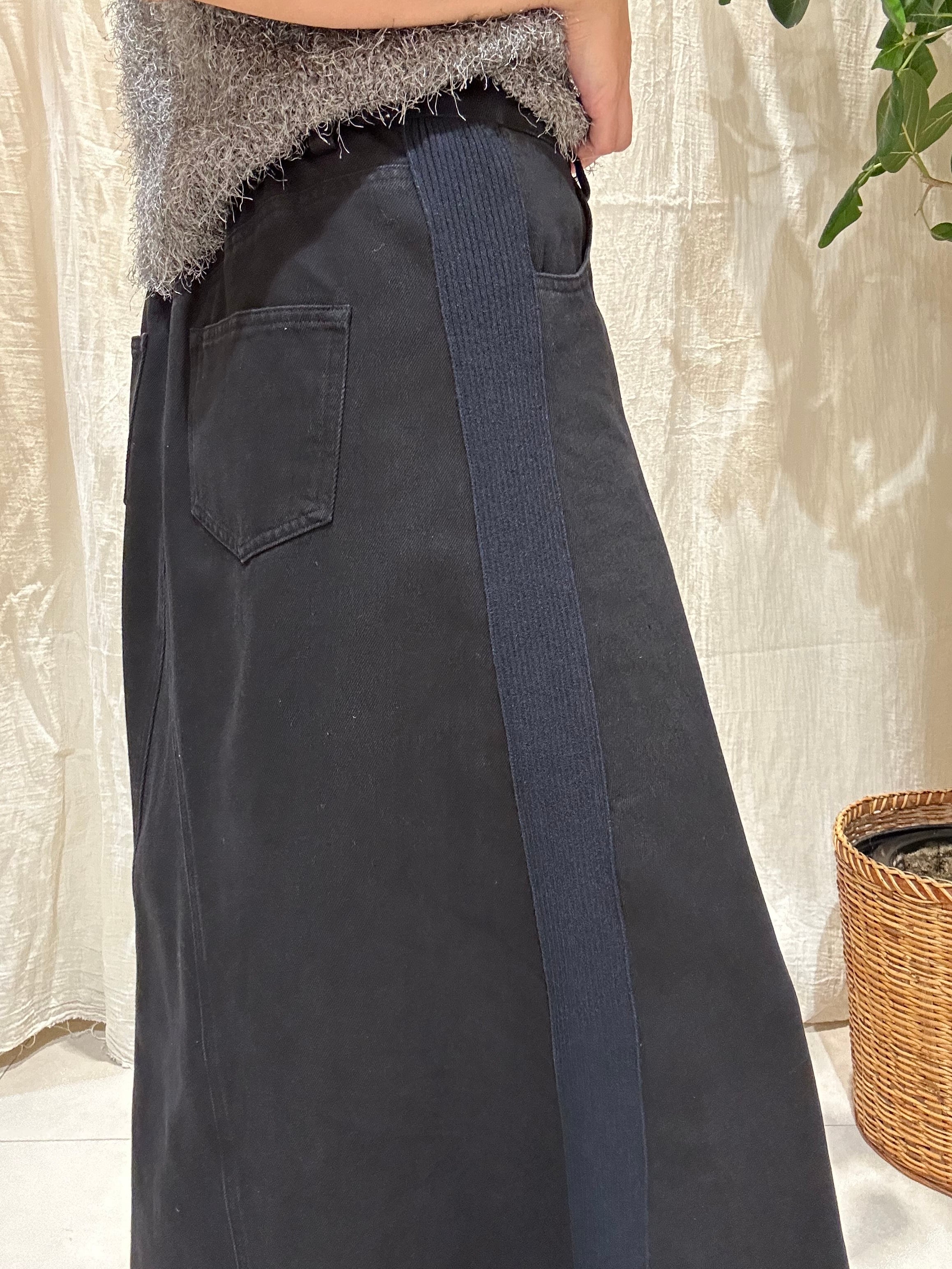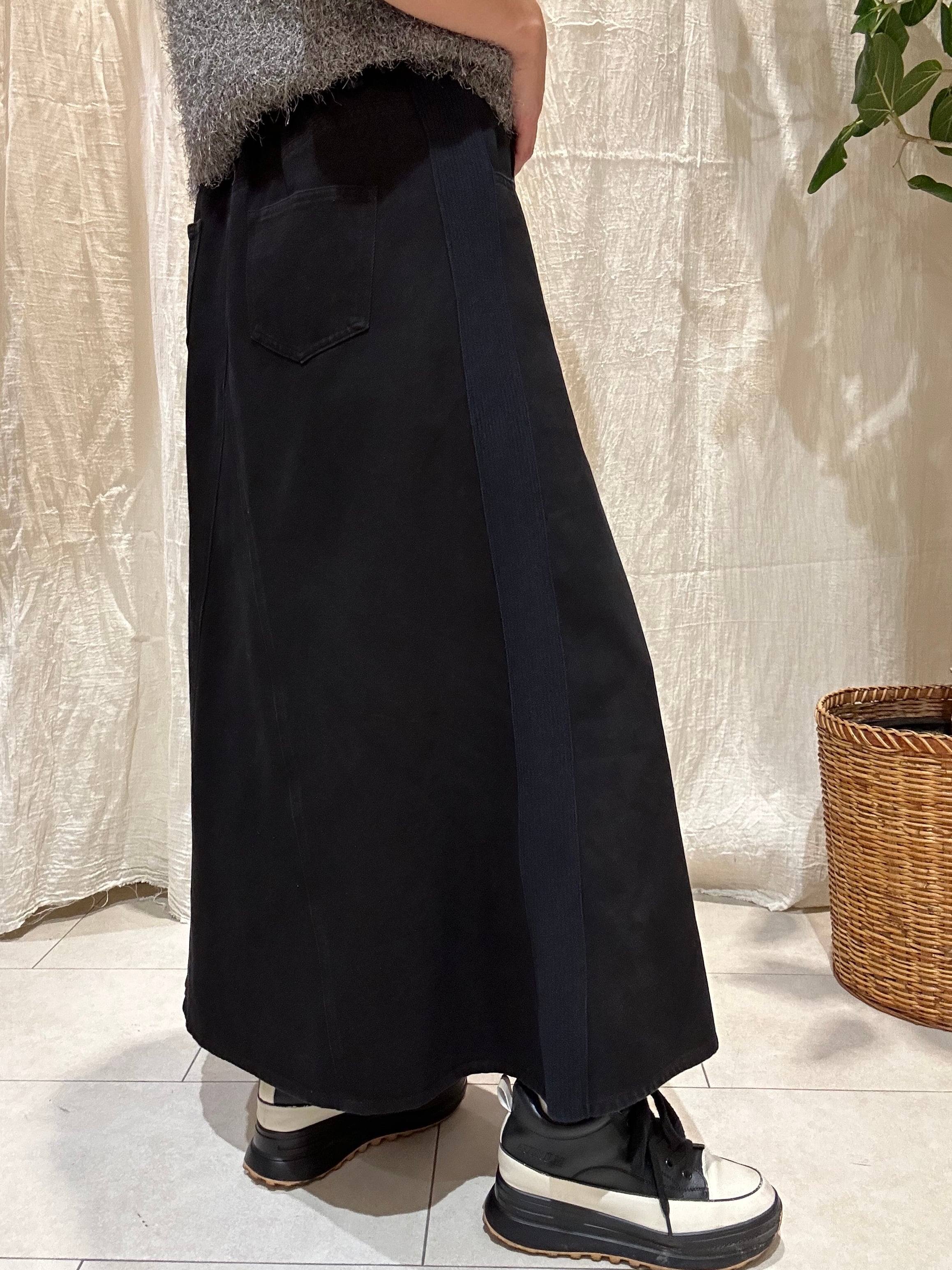 サイドにニットリブのラインがはいったデニムスカート。フレアシルエットですがブラックデニムなので落ち着いたかっこいい印象に。ウエストは後ろがゴム仕様になっています。