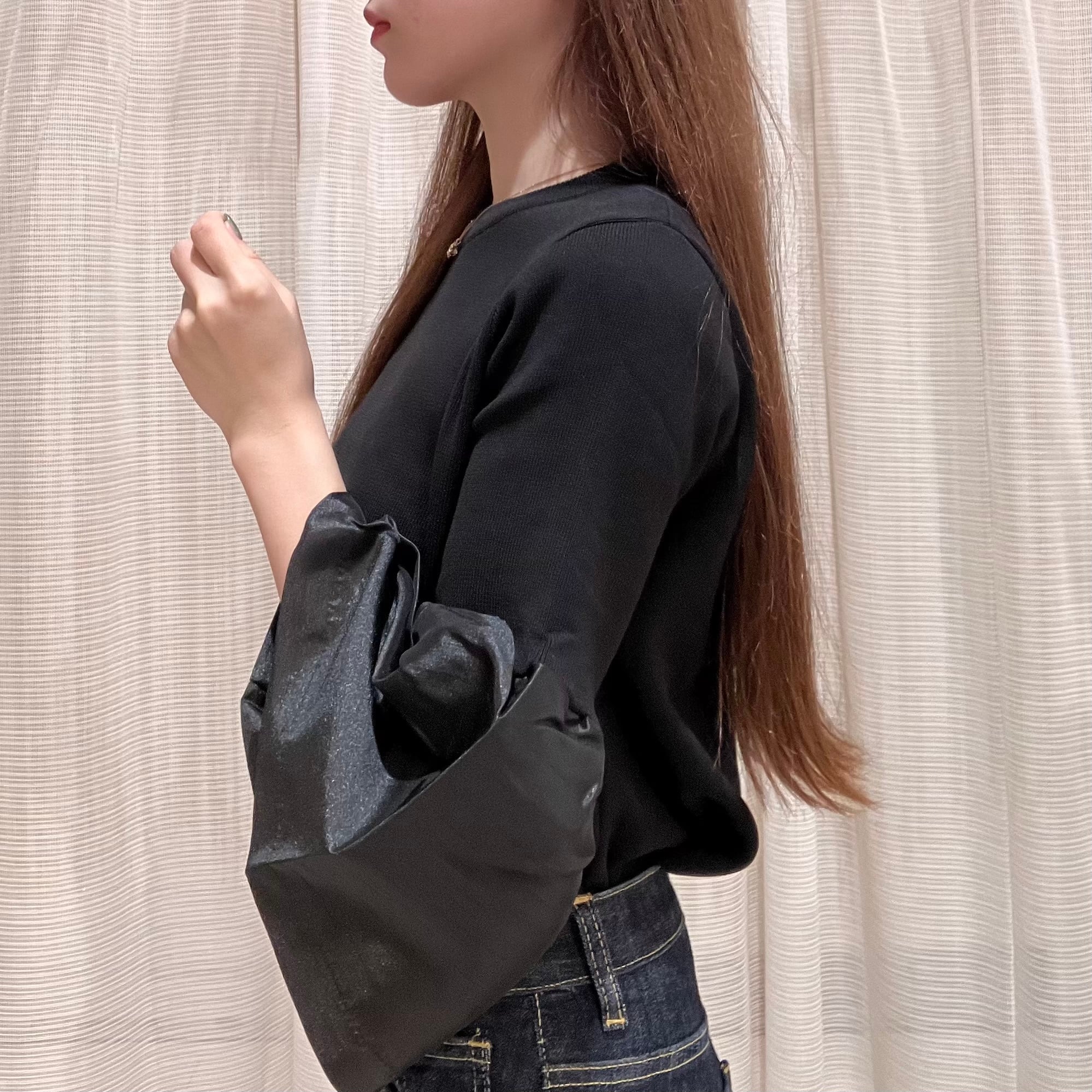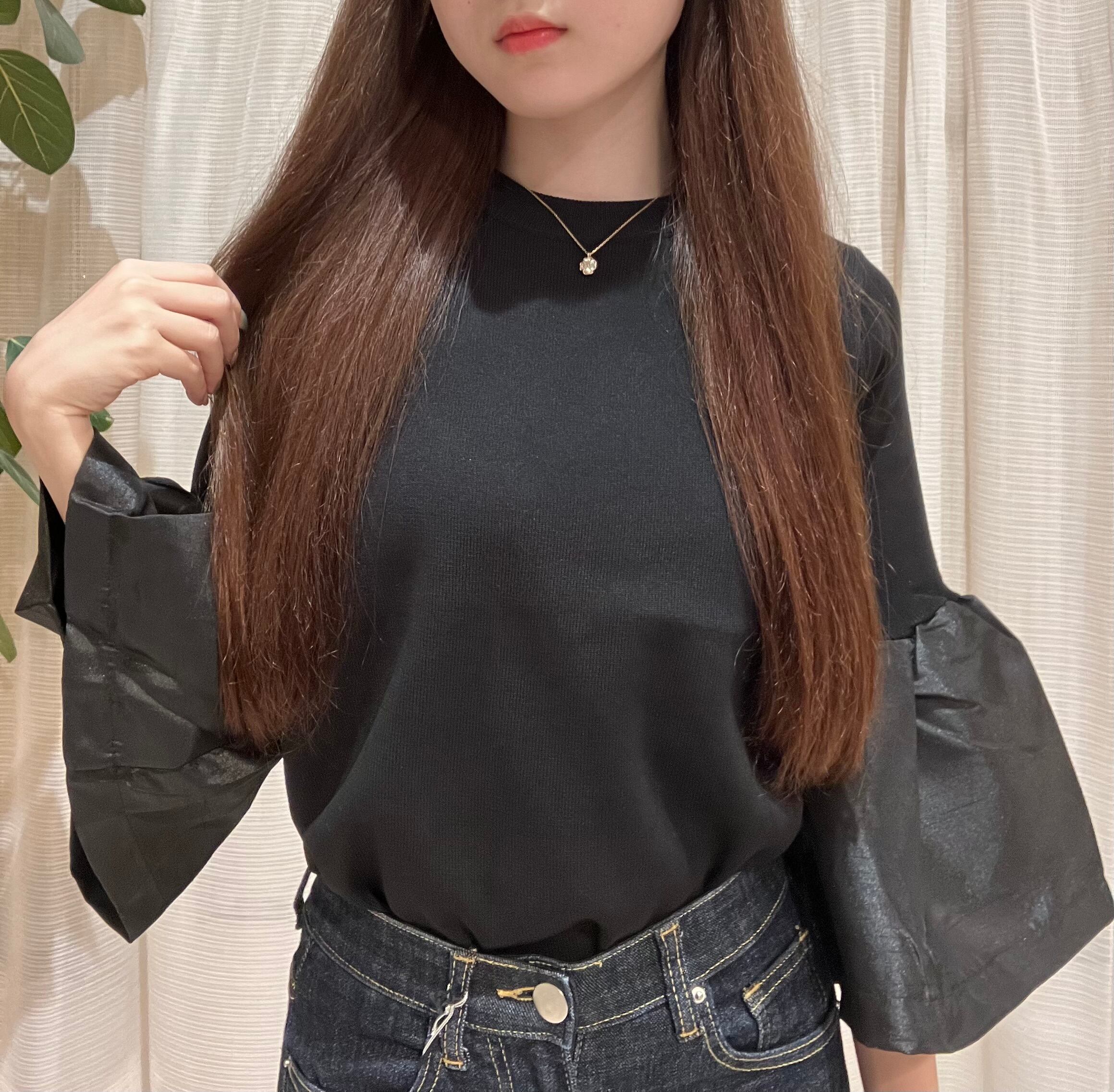 裾が少し短めのトップスで、袖口のフレアがエレガントな雰囲気を演出。