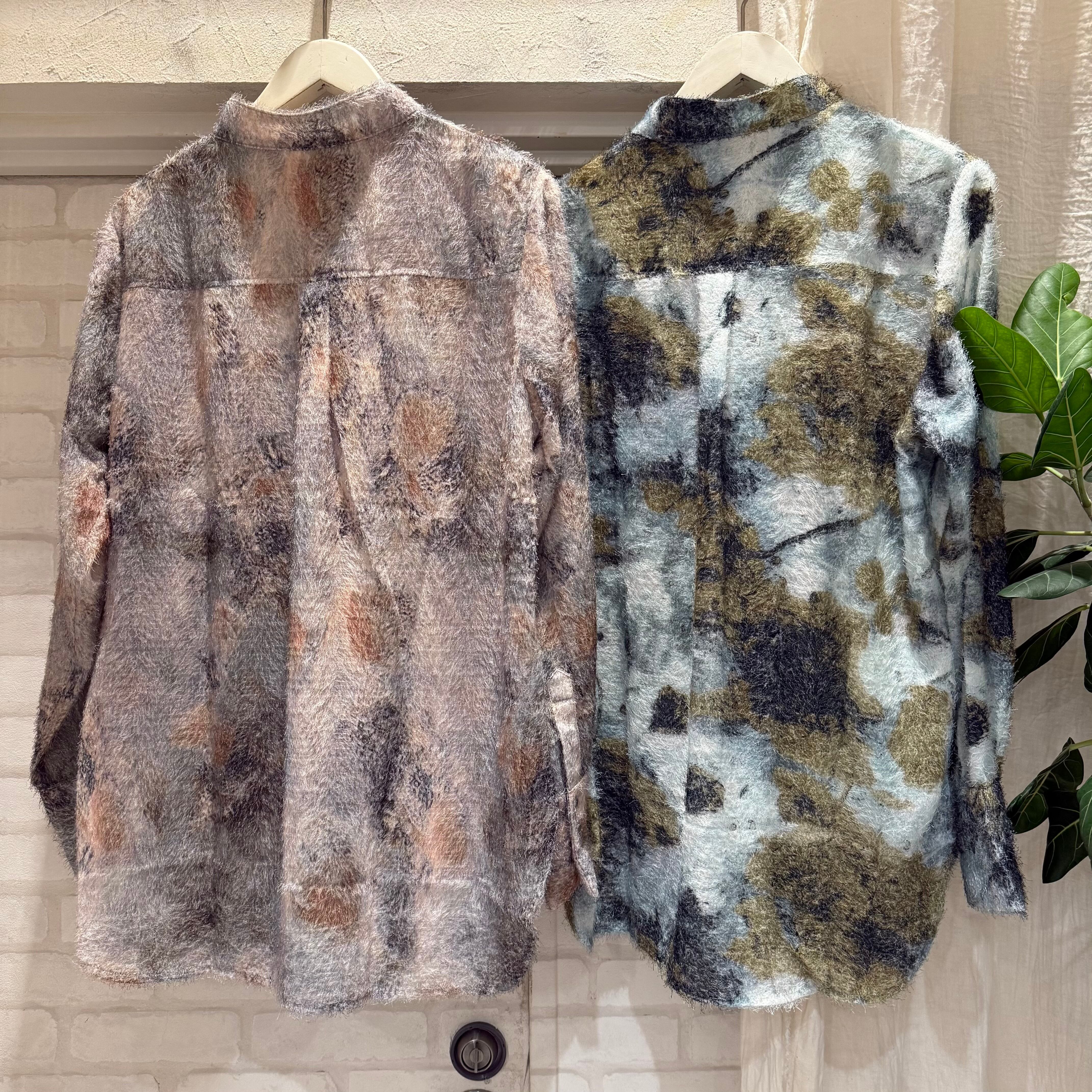 短いフェザー生地に水彩画を滲ませたようなアート柄が目を惹く一枚。