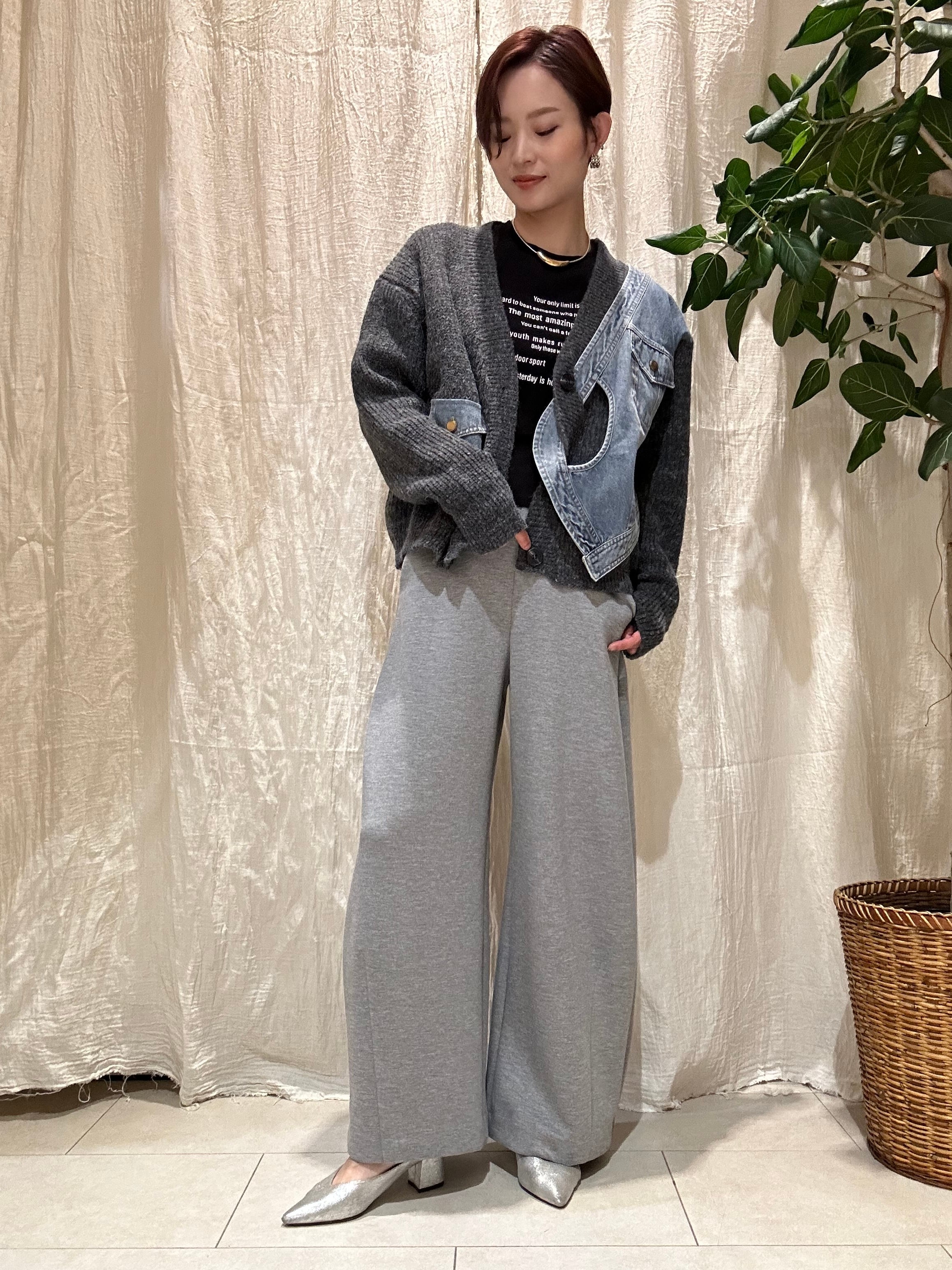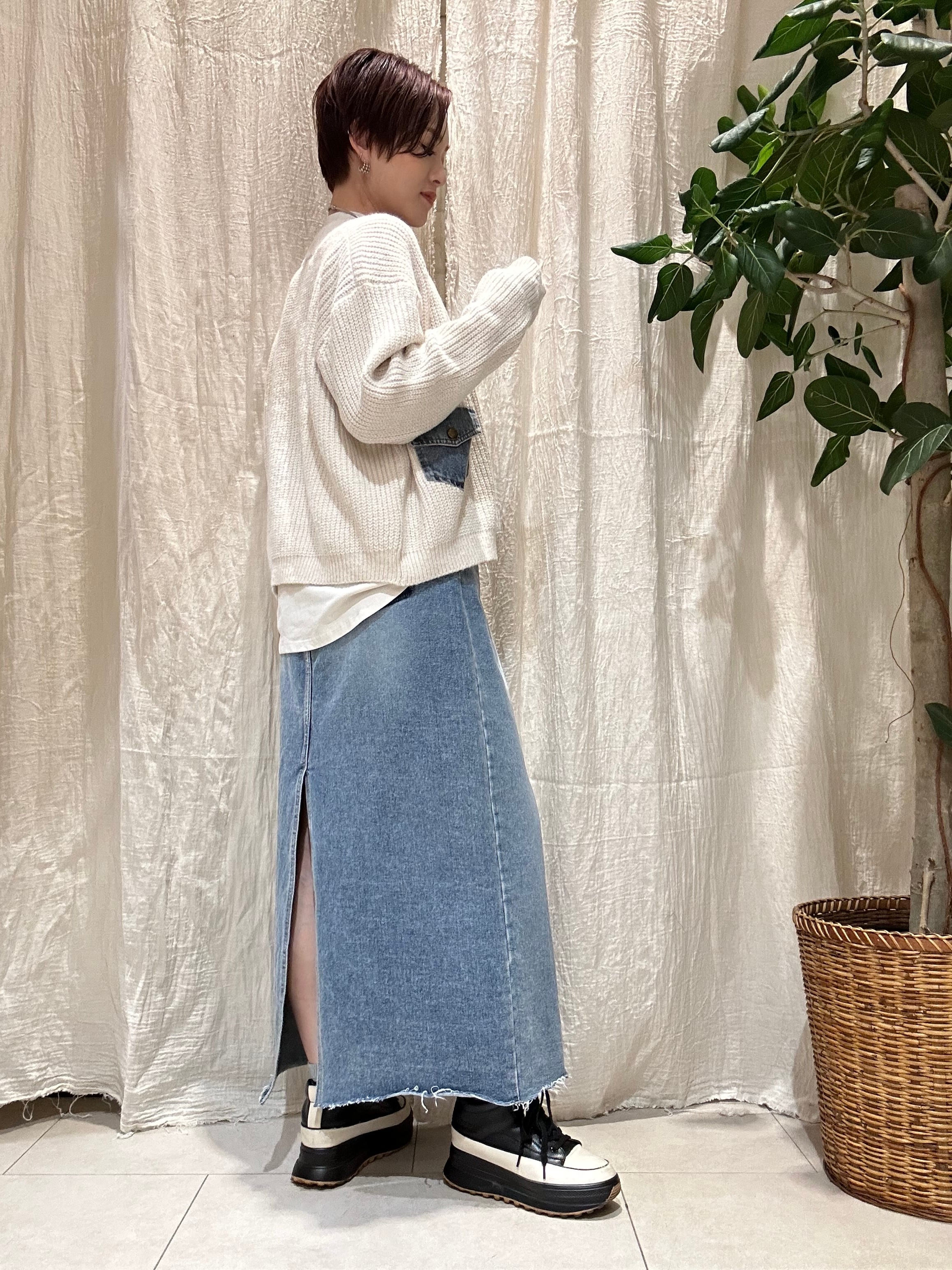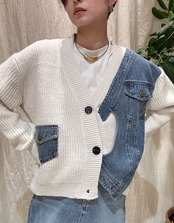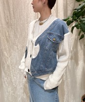 ざっくりニットとデニムがドッキングしたコンパクトなサイズ感のニットカーデ。