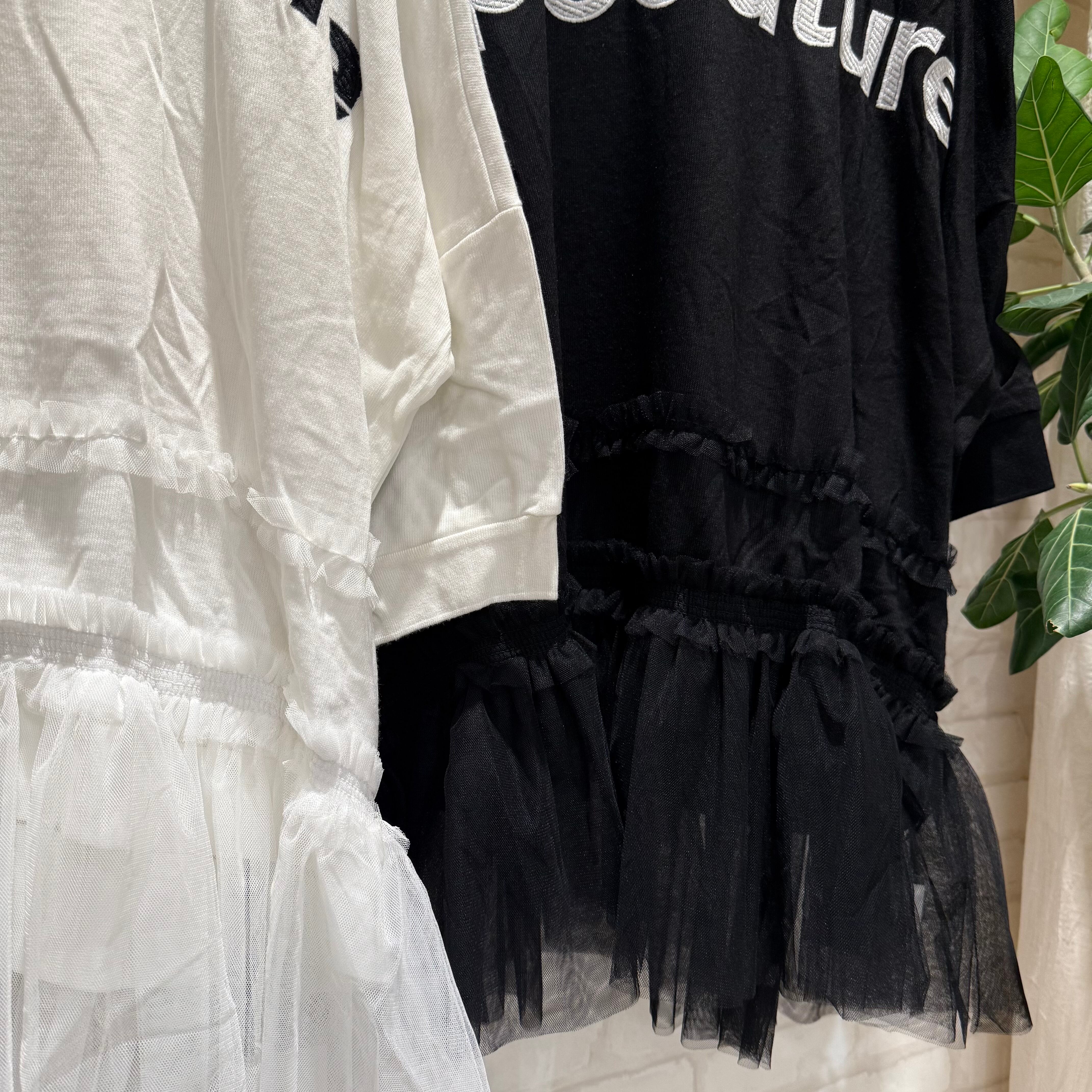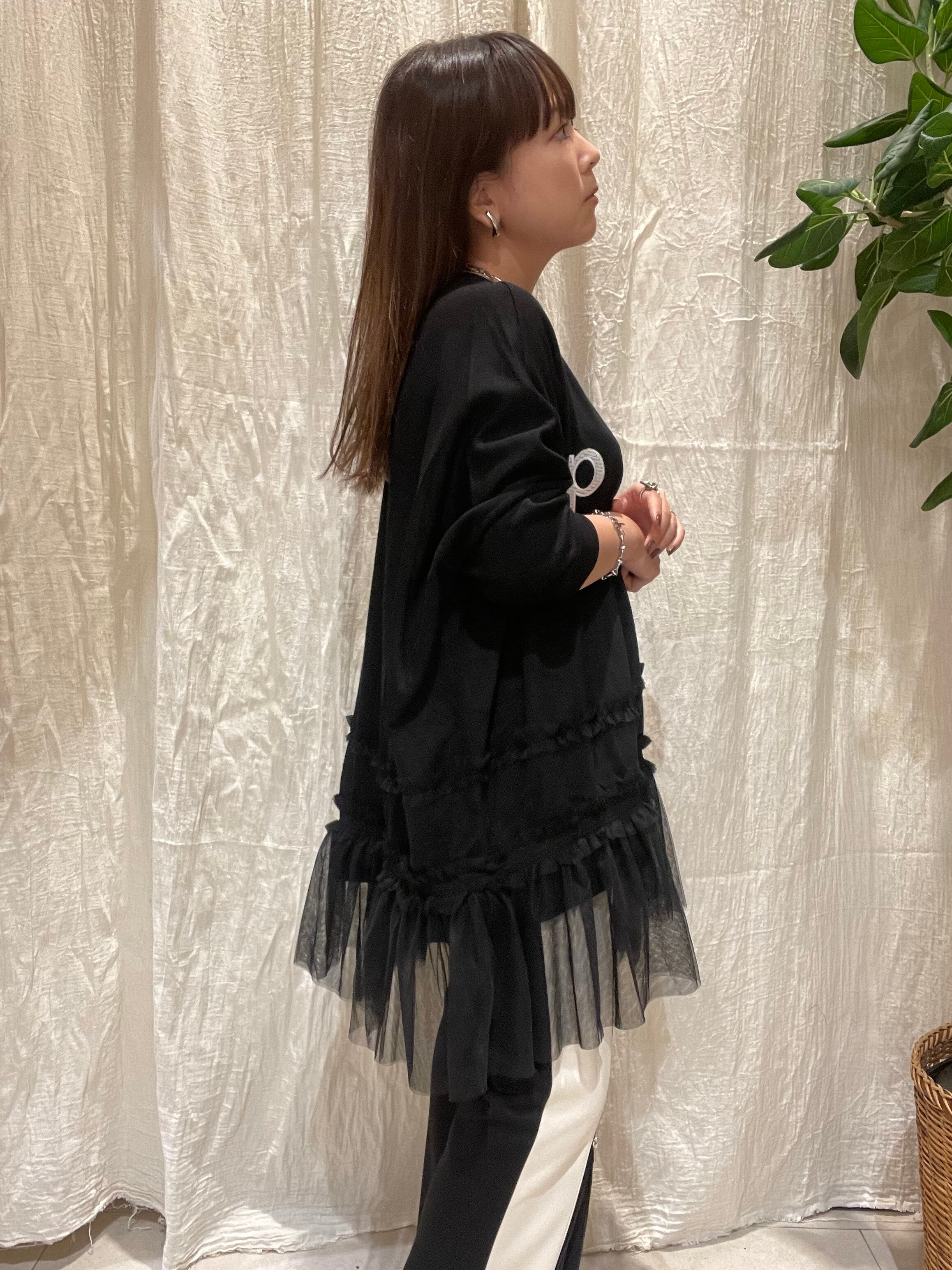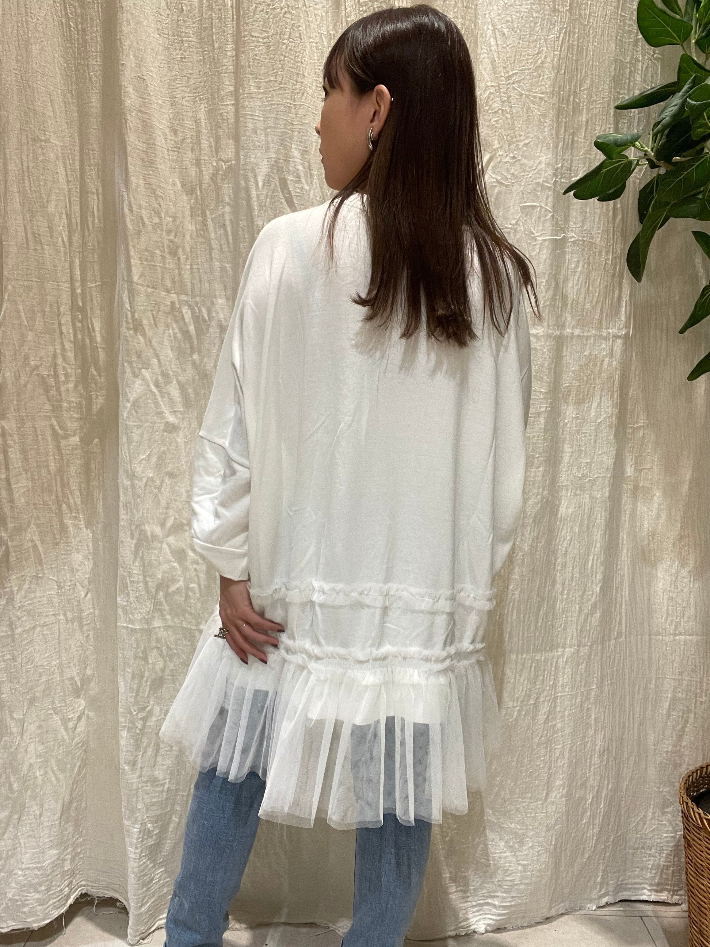 カジュアルなBIGシルエットのプルオーバーに甘めのチュールを施した絶妙なバランス。