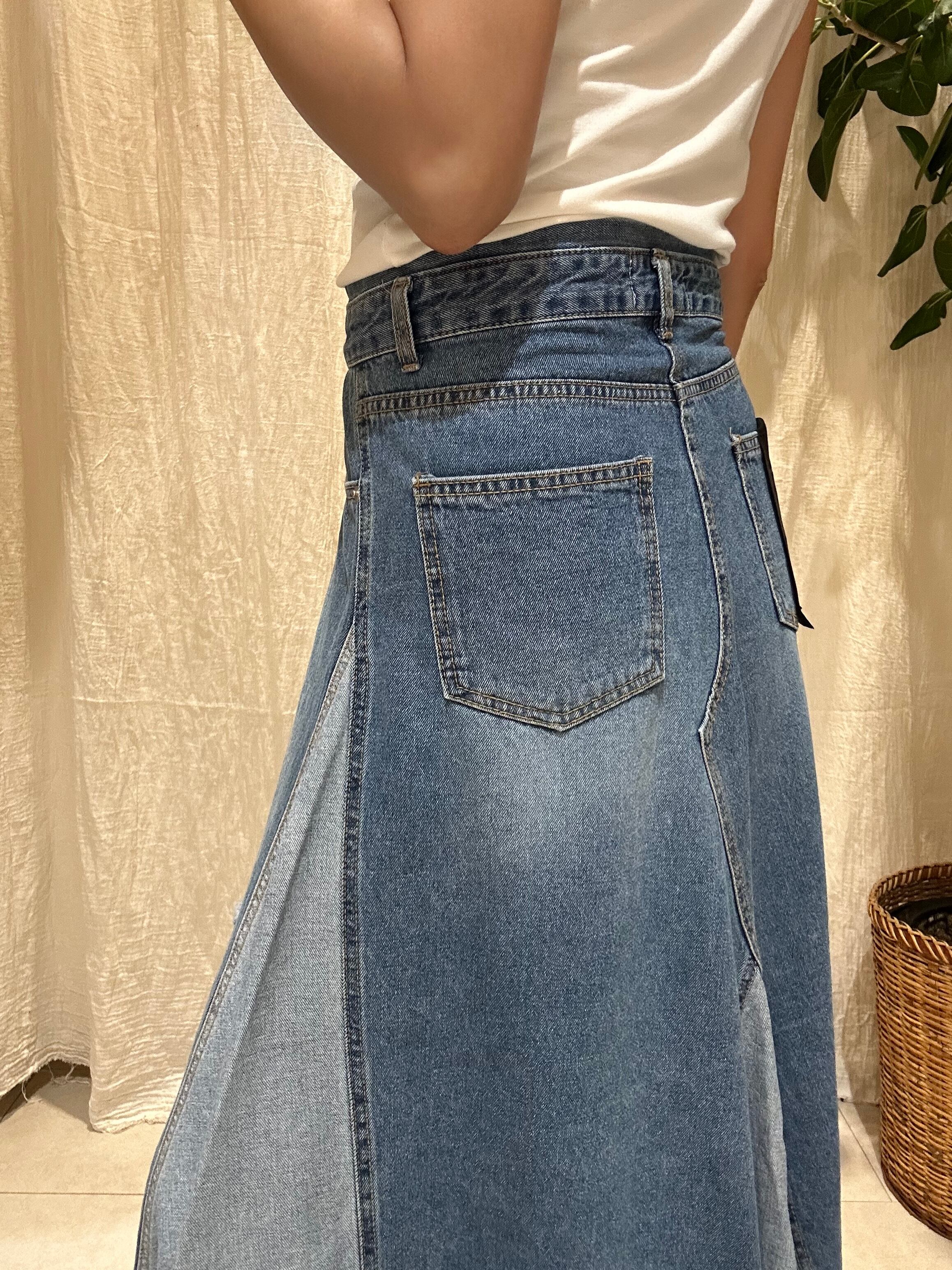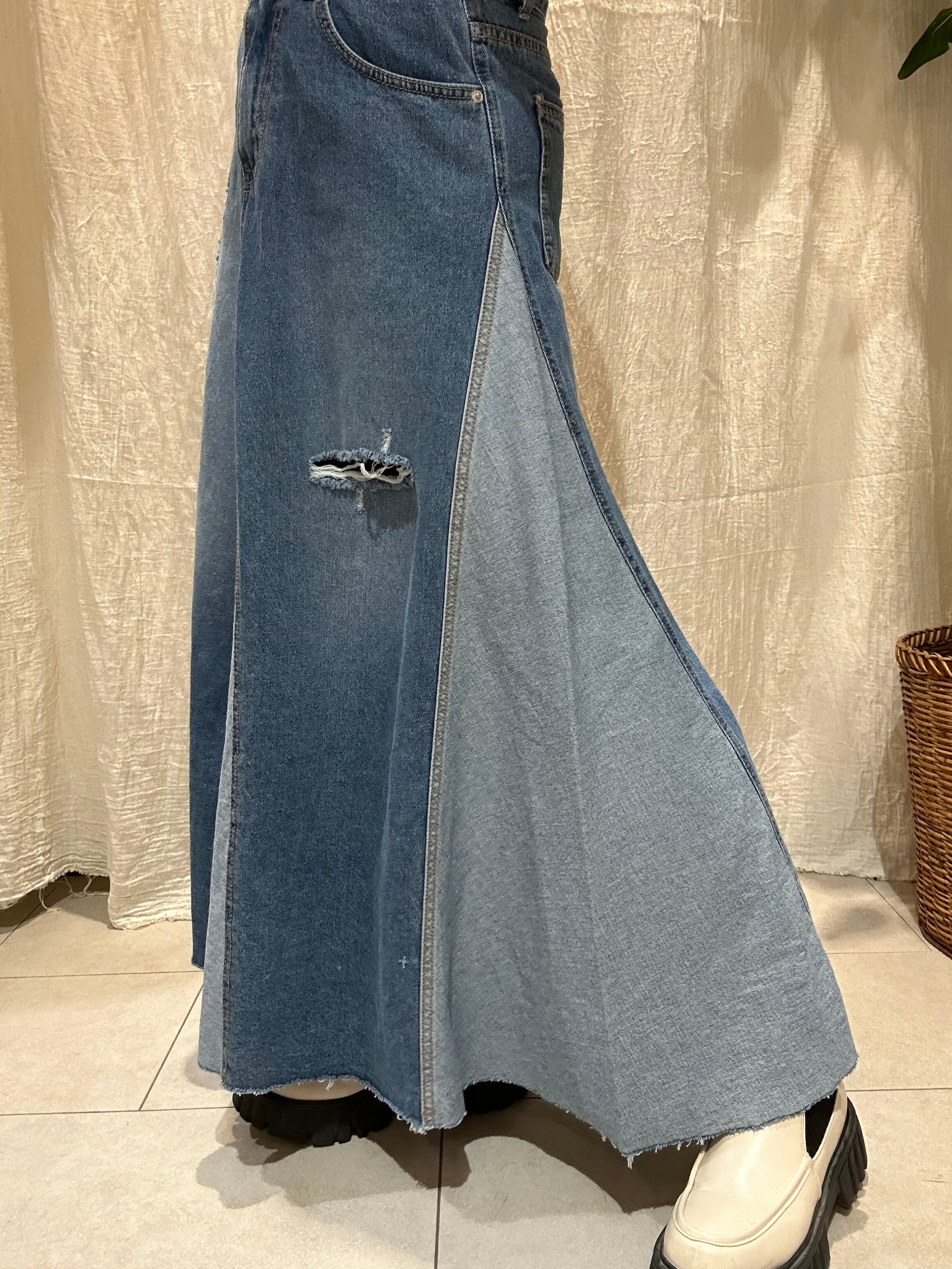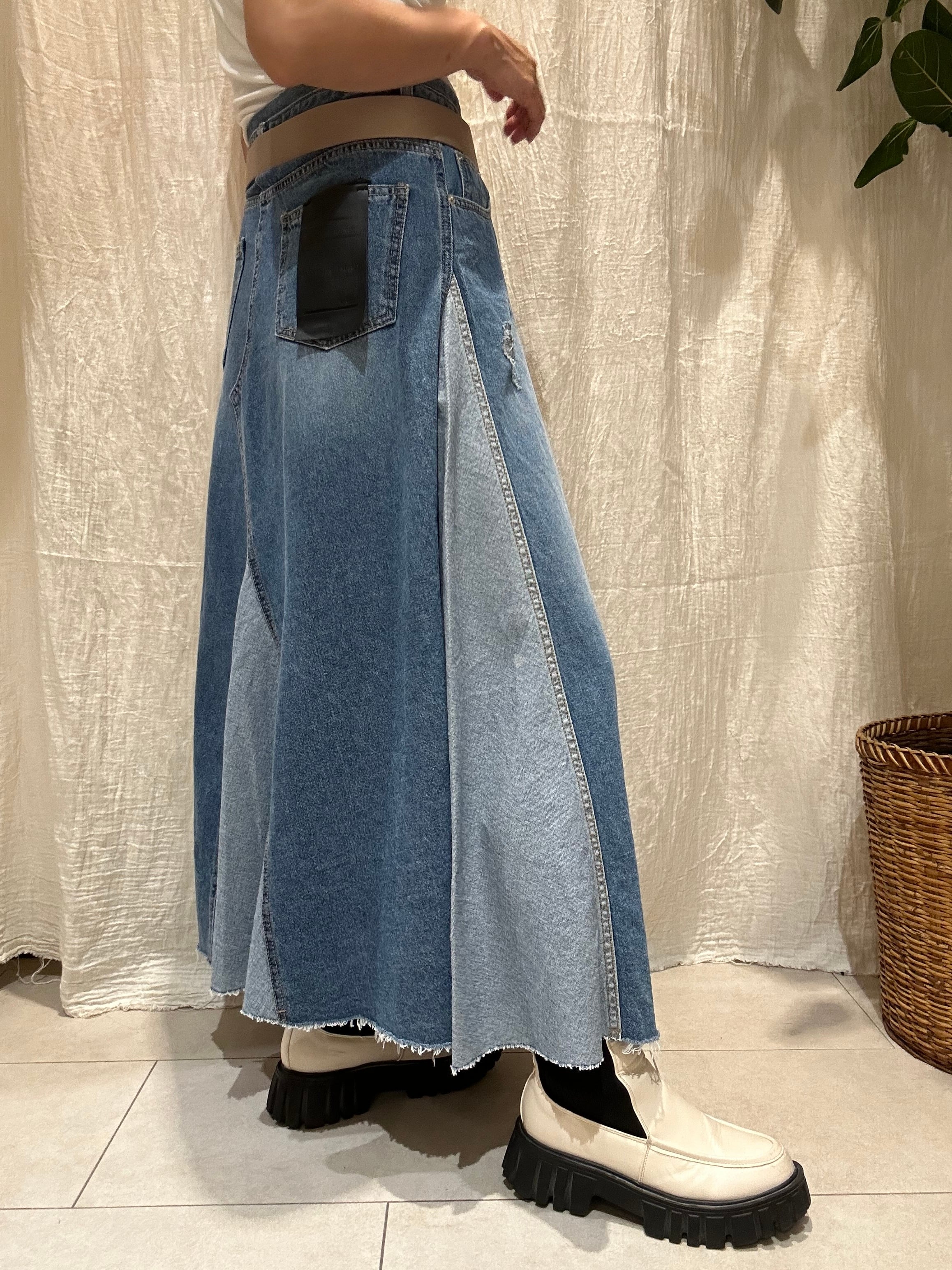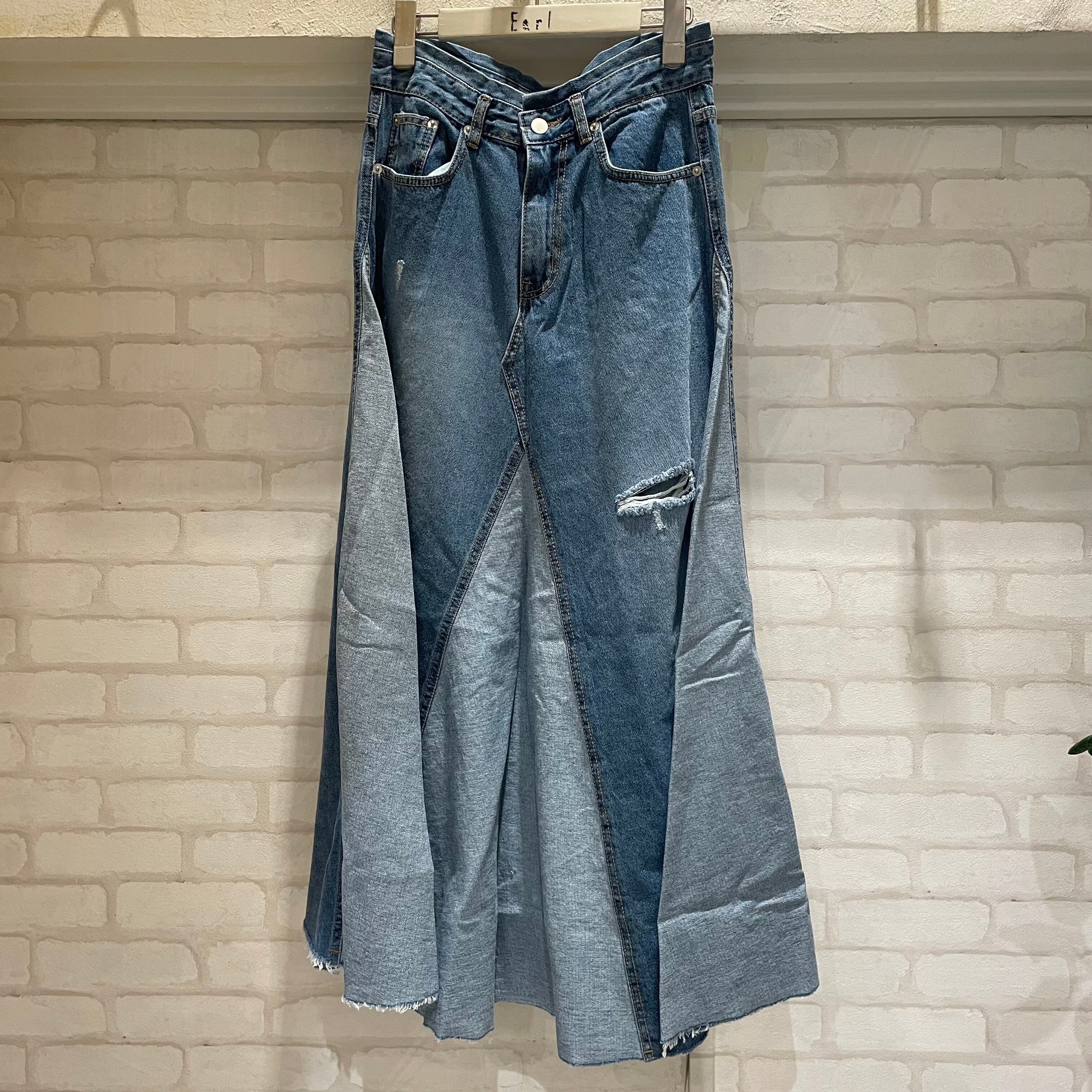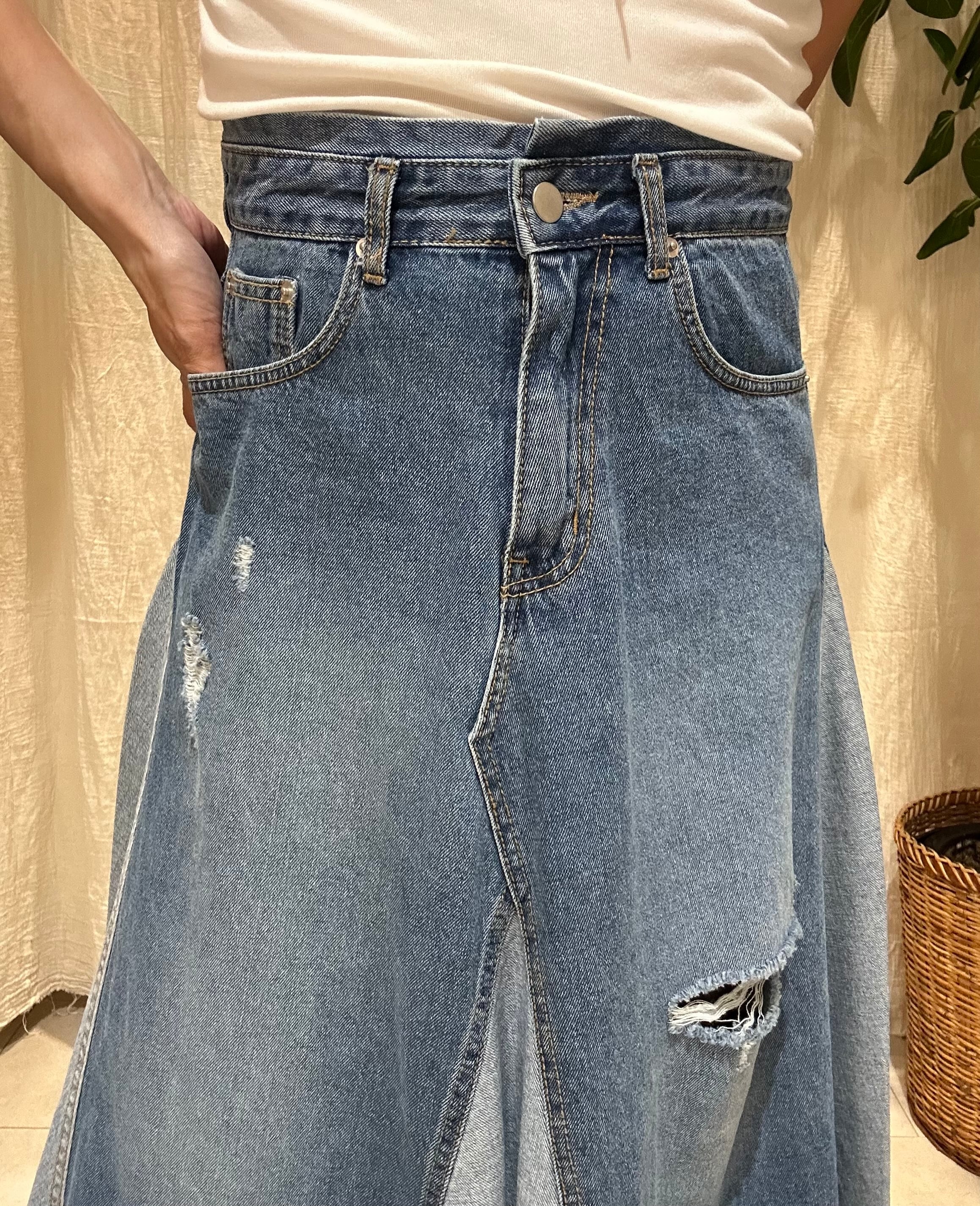 ビンテージ感のあるリメイク&クラッシュデザインがいつものデニムスカートと違う遊び心あるコーデになります。