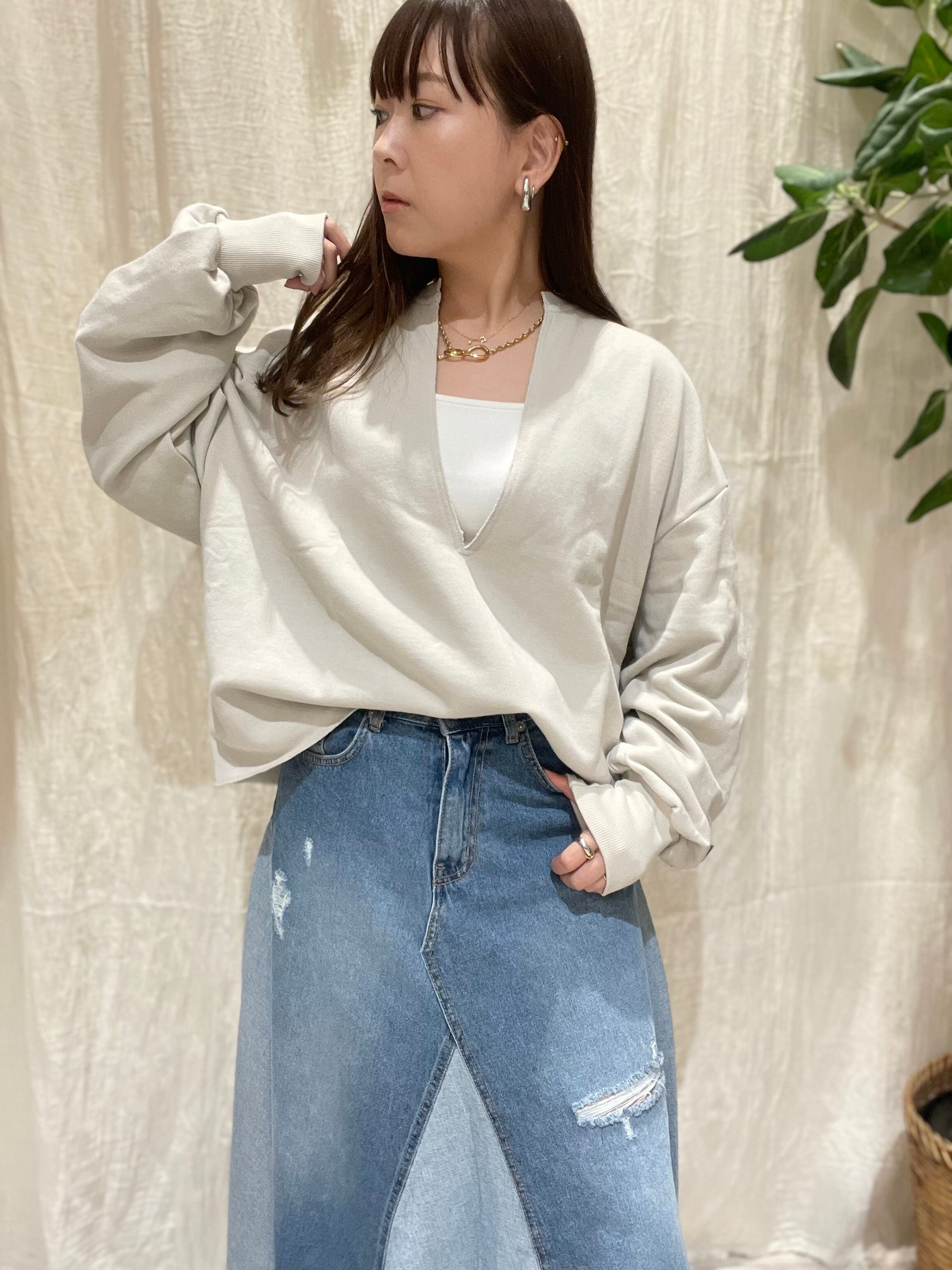 深めのVネックが特徴のデザインスウェットトレーナー。