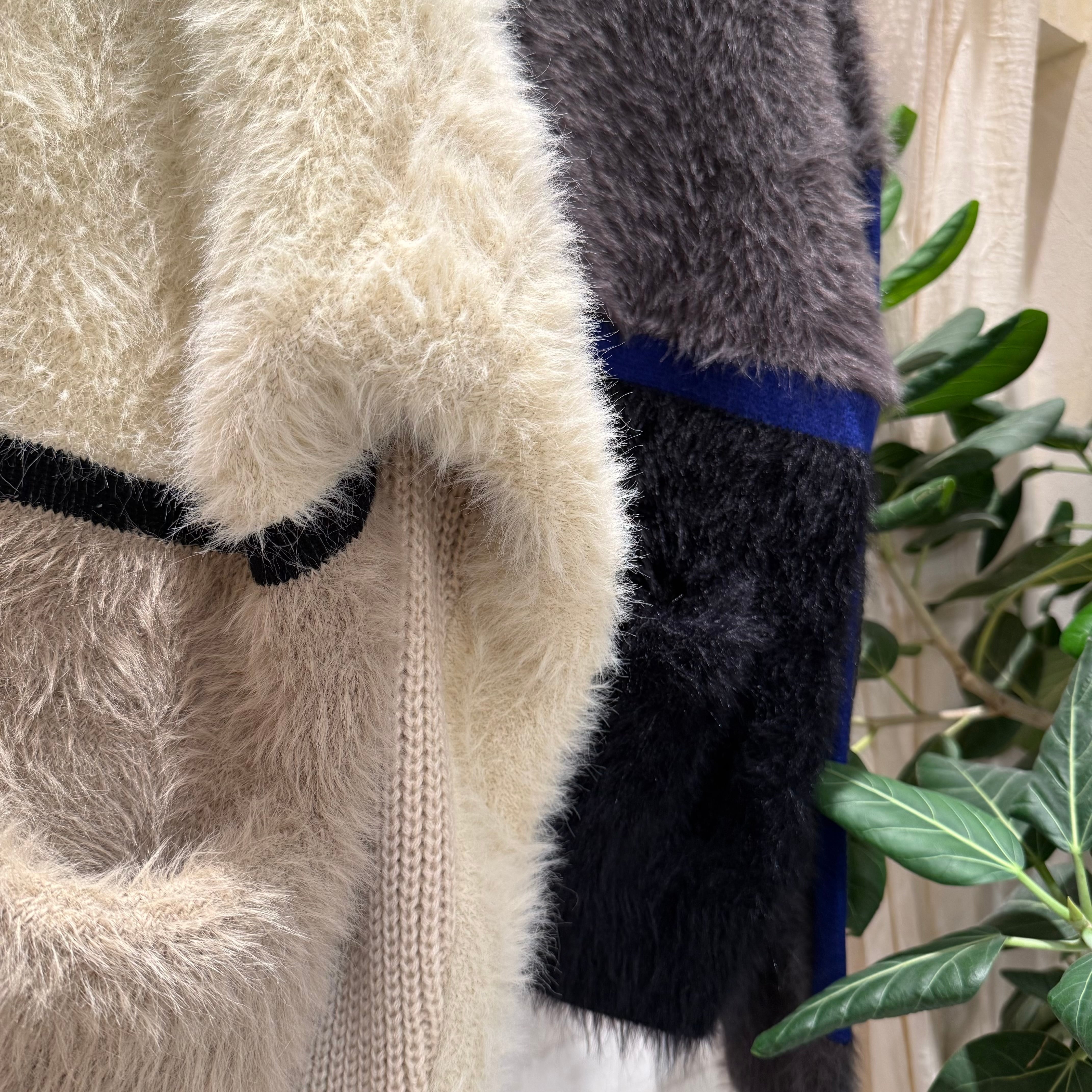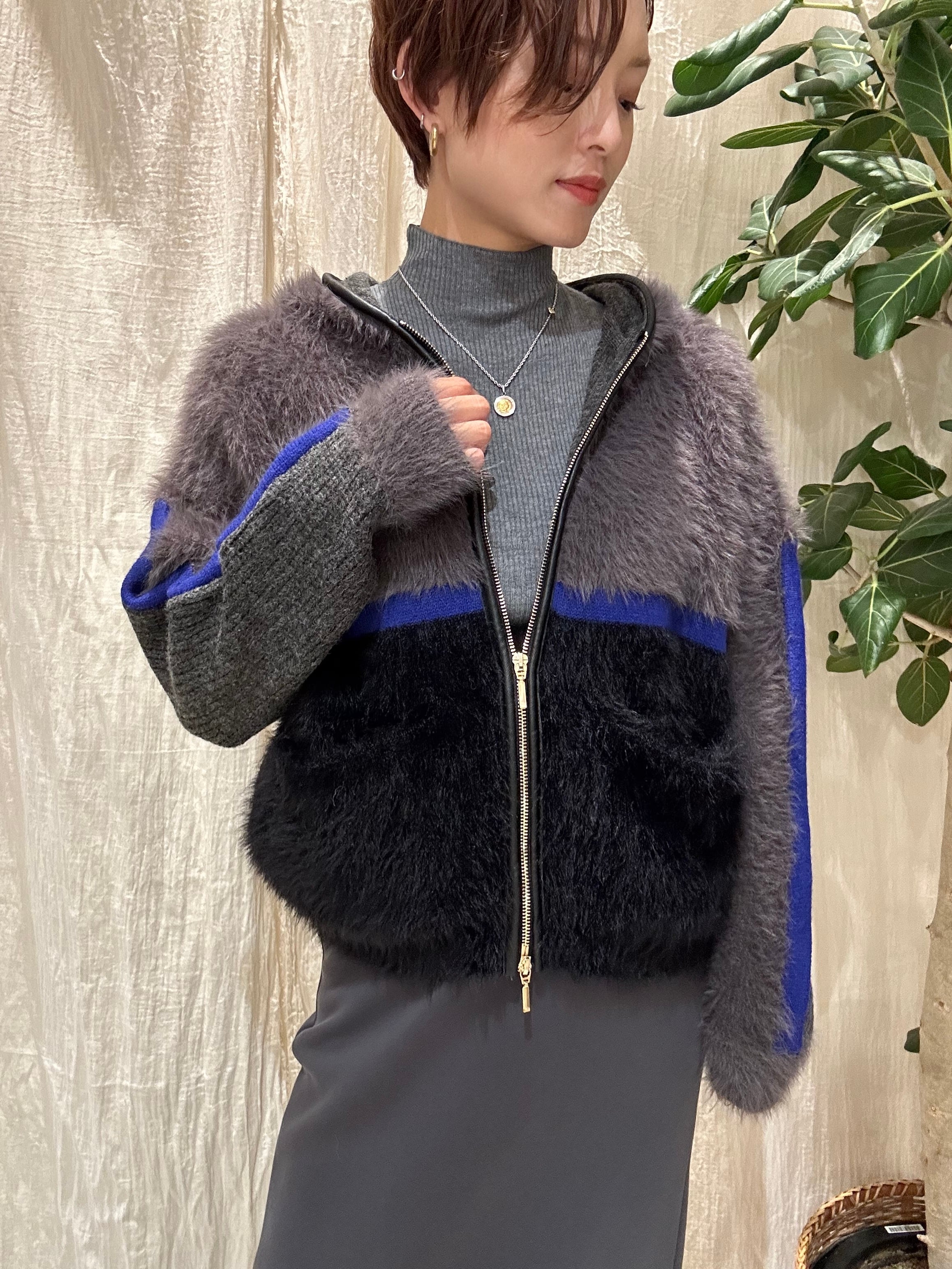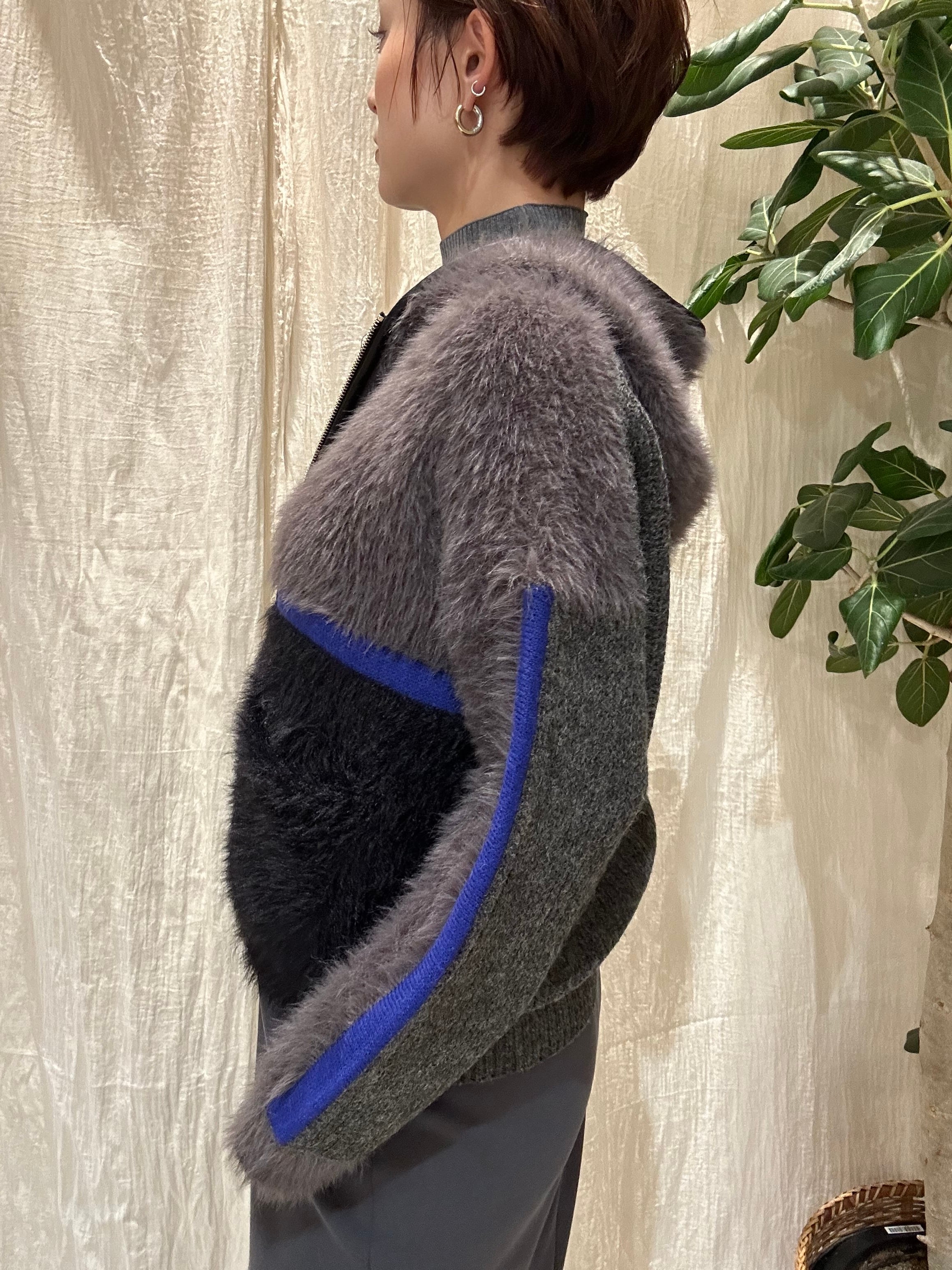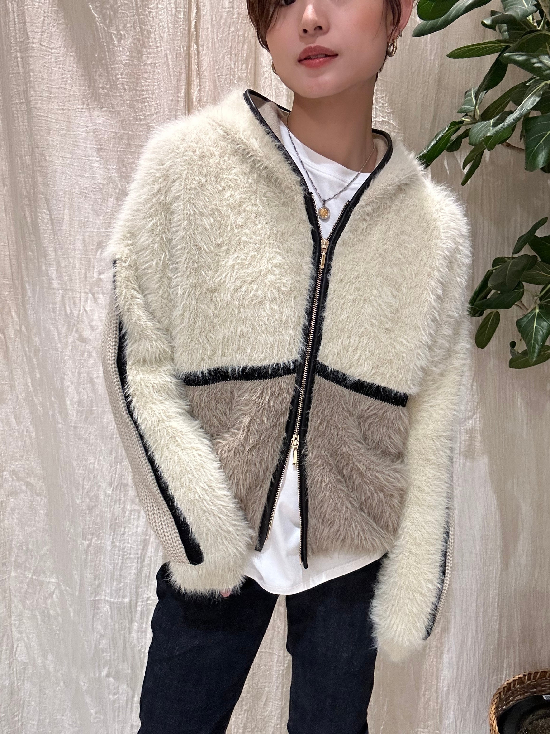 シャギーヤーンのふんわりとした表情に、袖やフロントの配色ラインがリズムを生み、ブルゾンの洒落感をぐっと引き立てます。