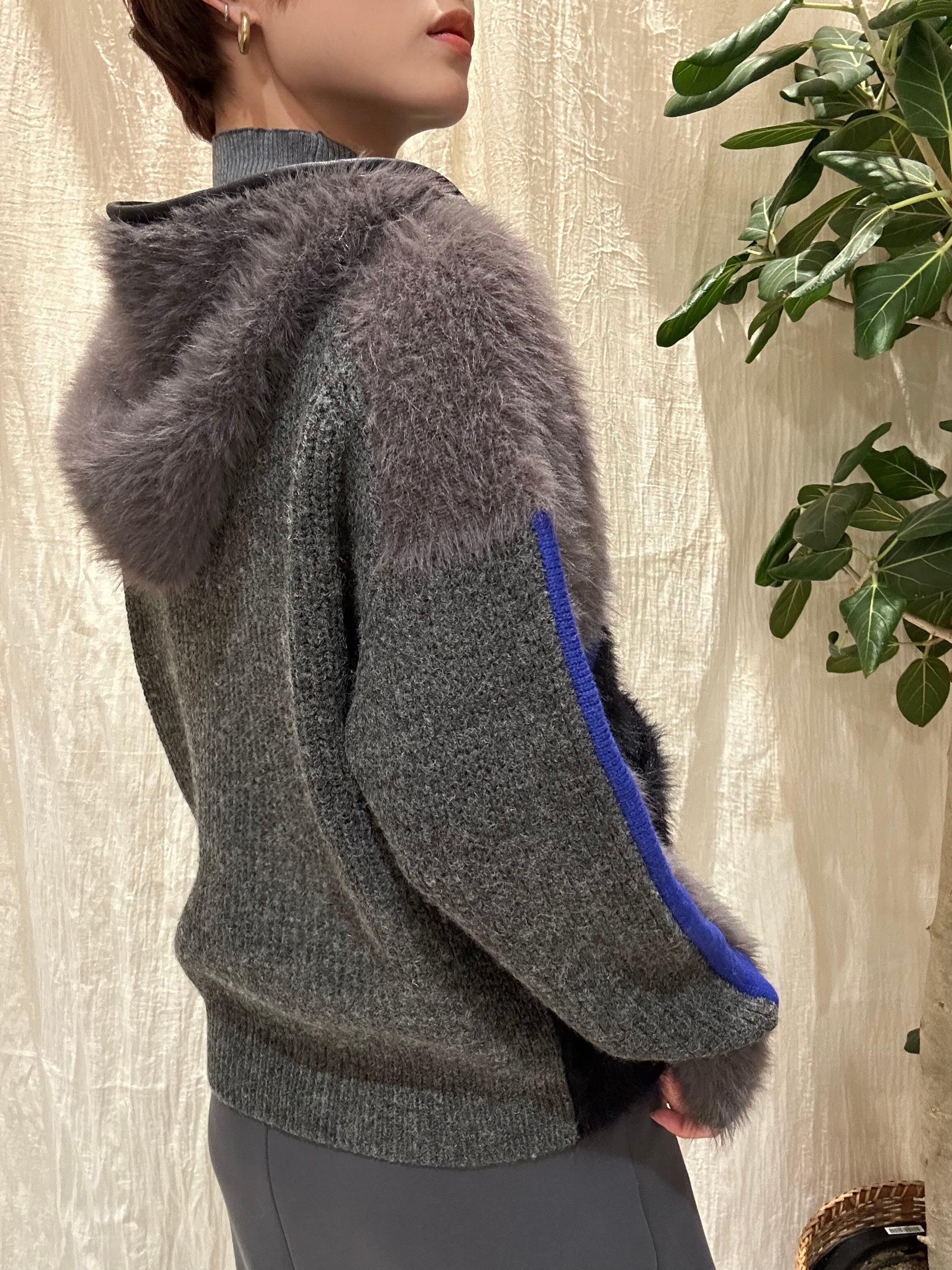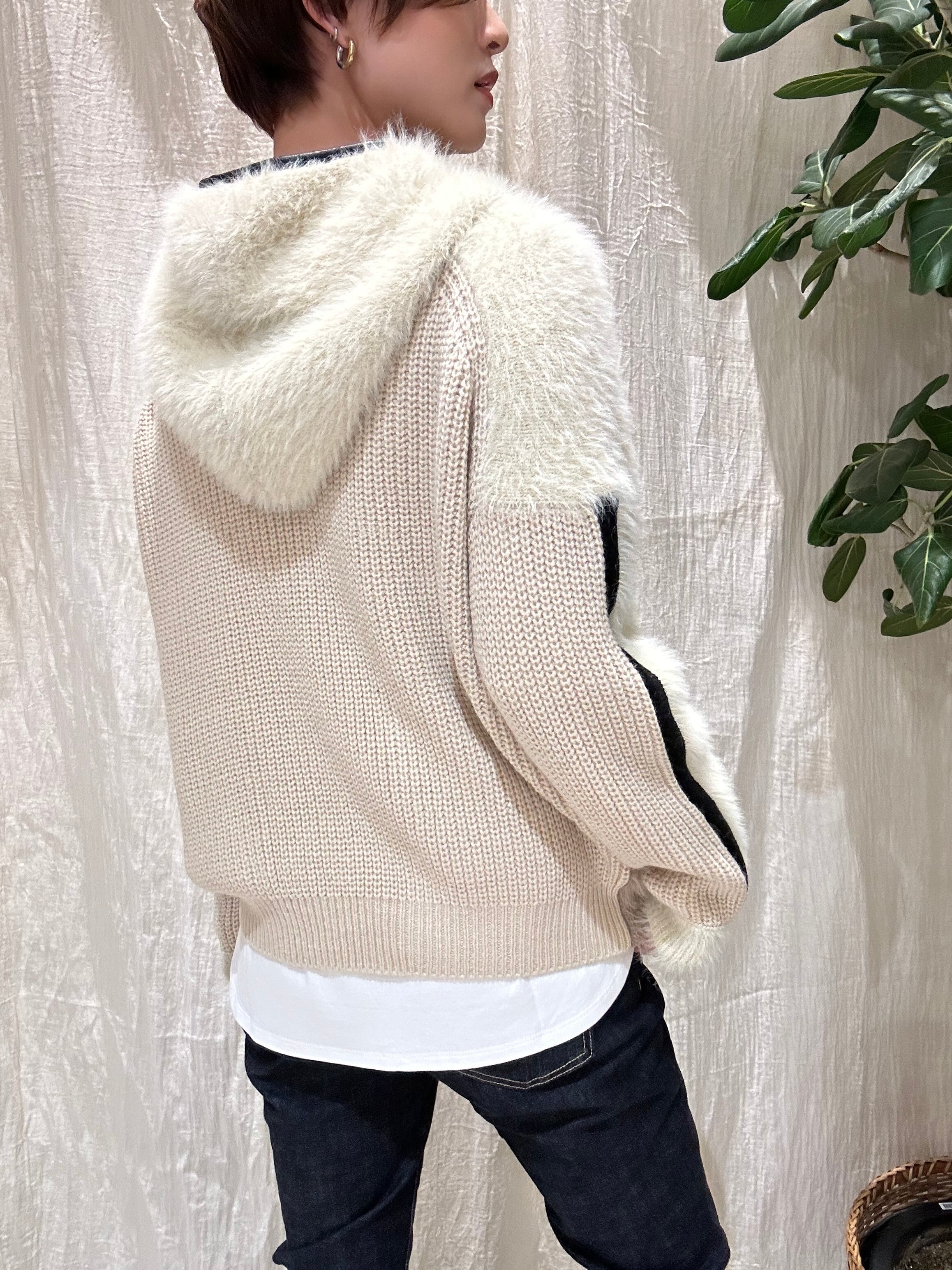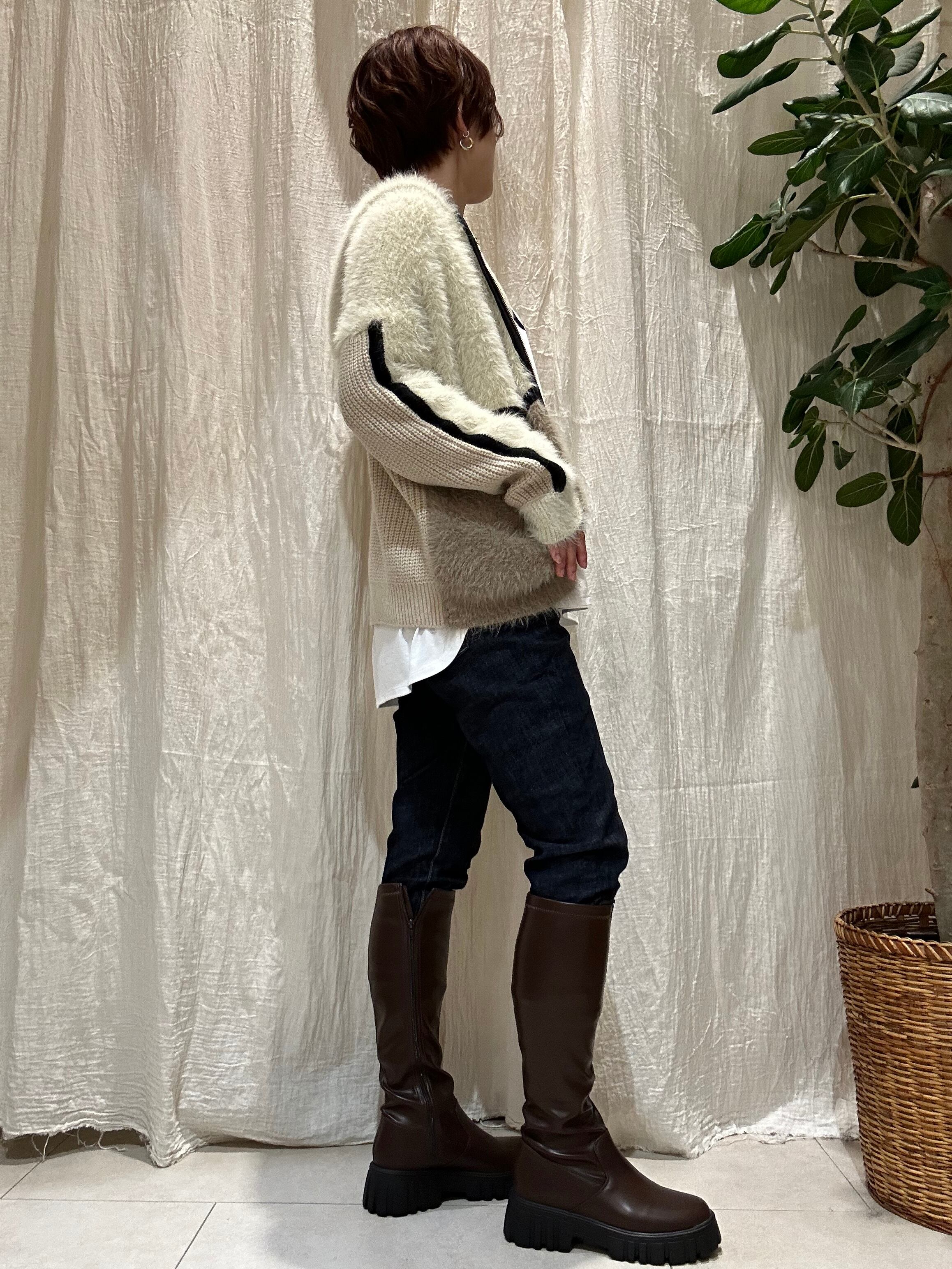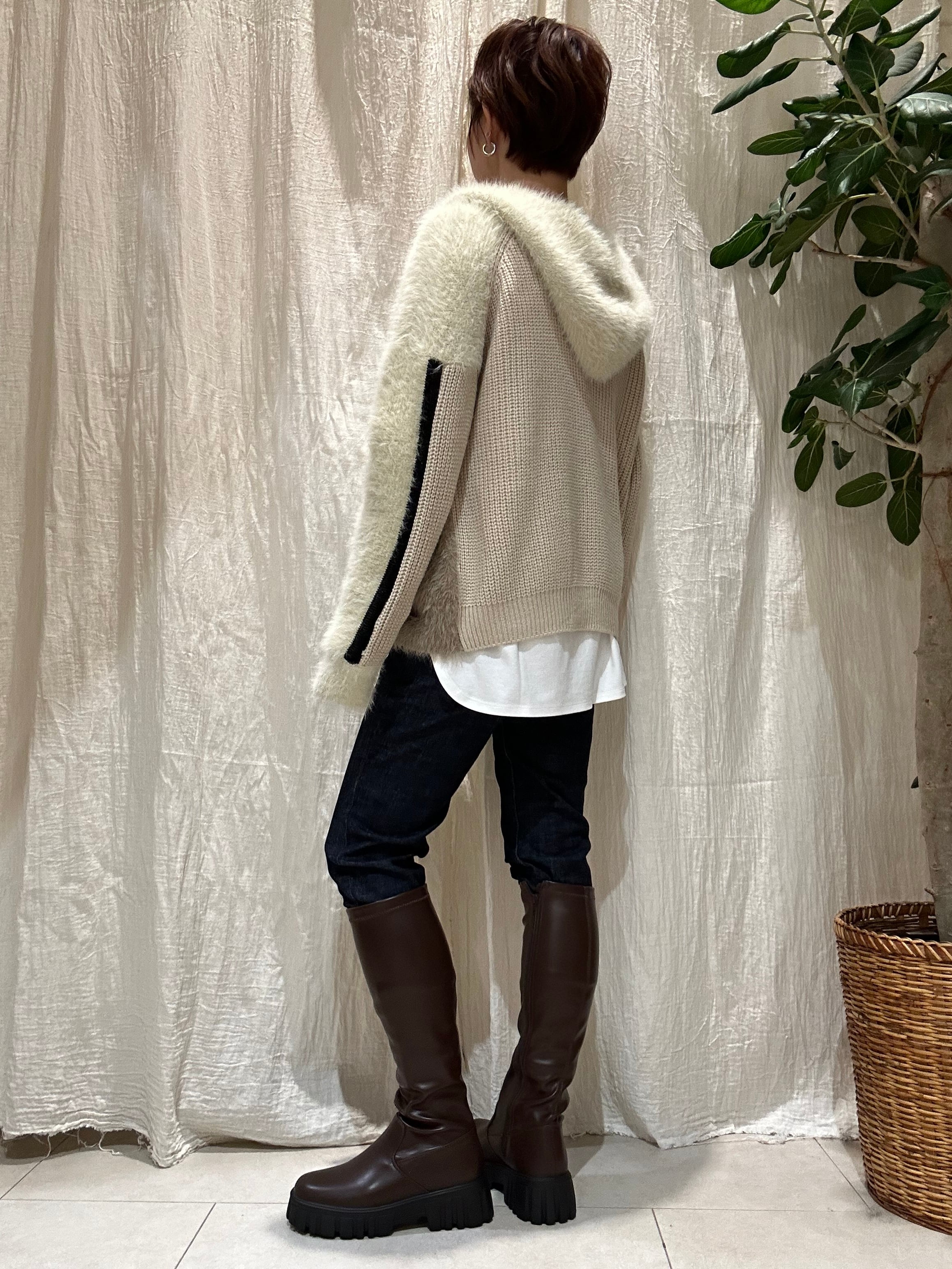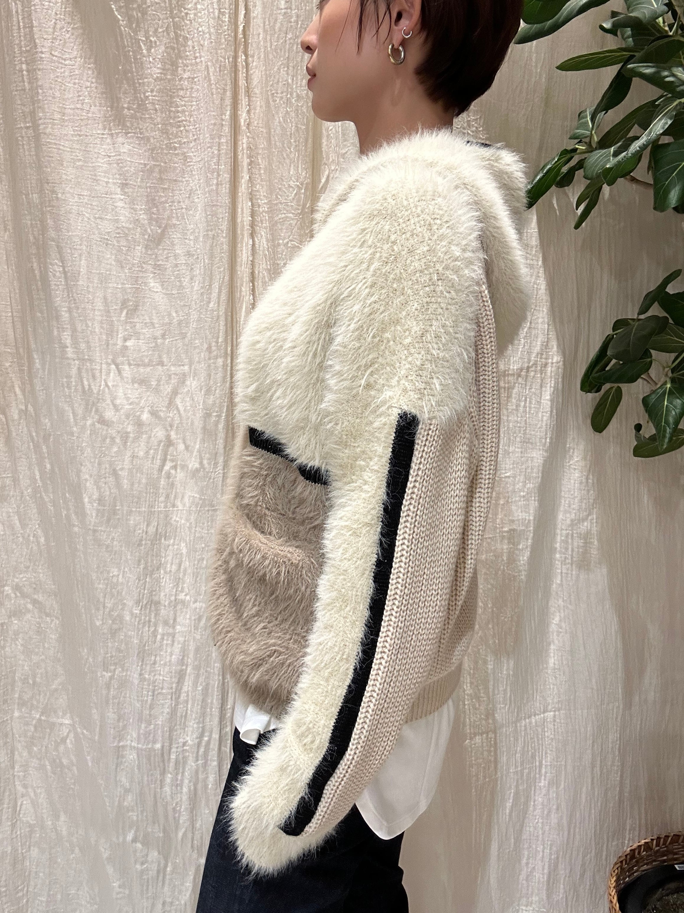 シャギーヤーンのふんわりとした表情に、袖やフロントの配色ラインがリズムを生み、ブルゾンの洒落感をぐっと引き立てます。