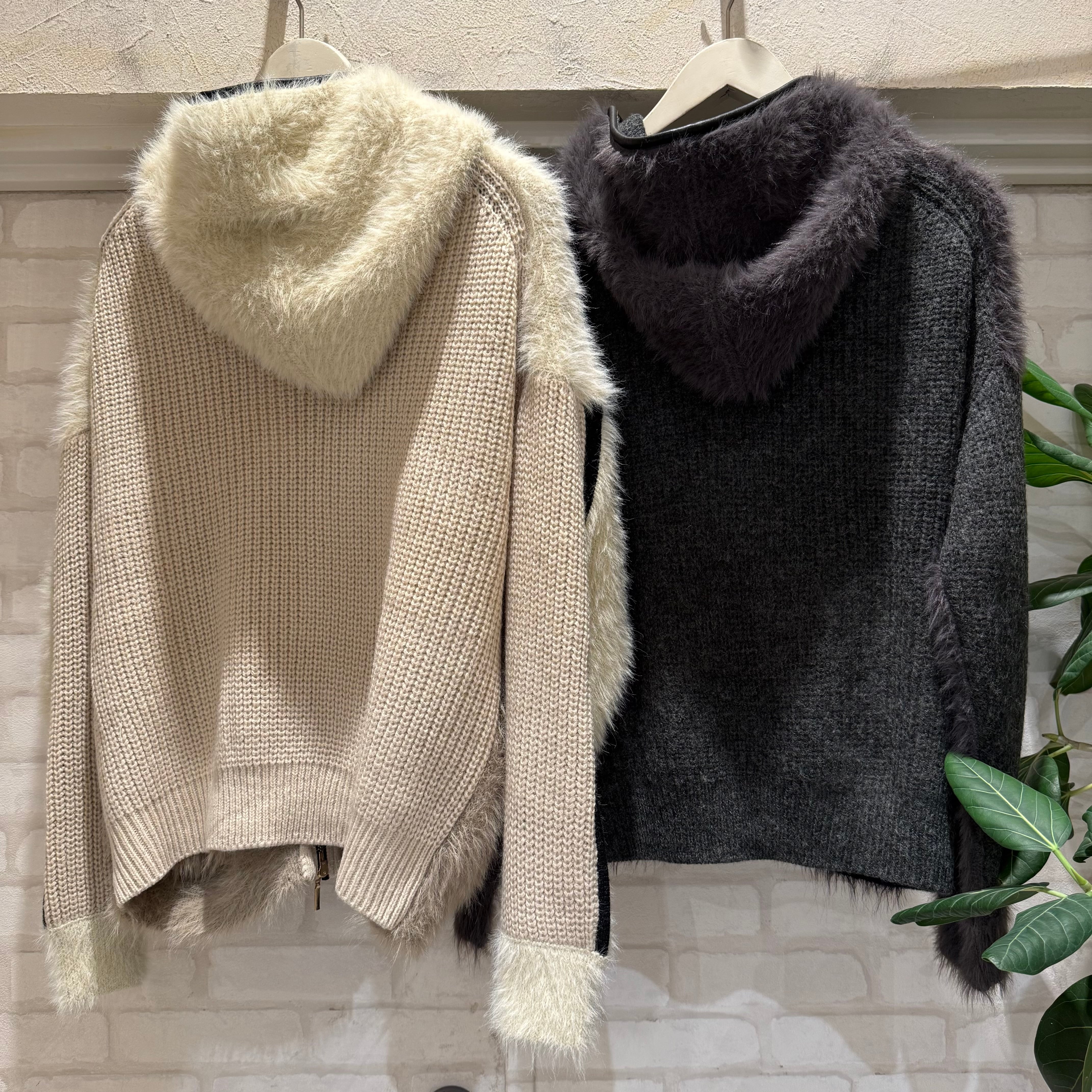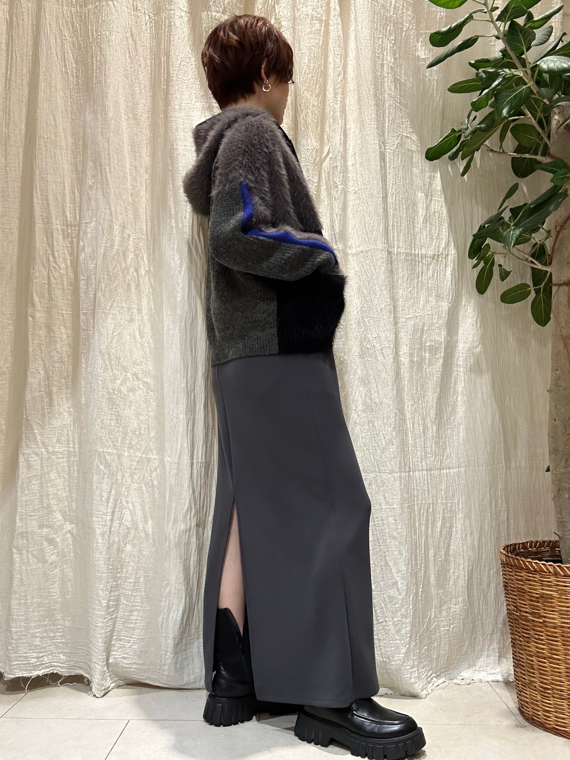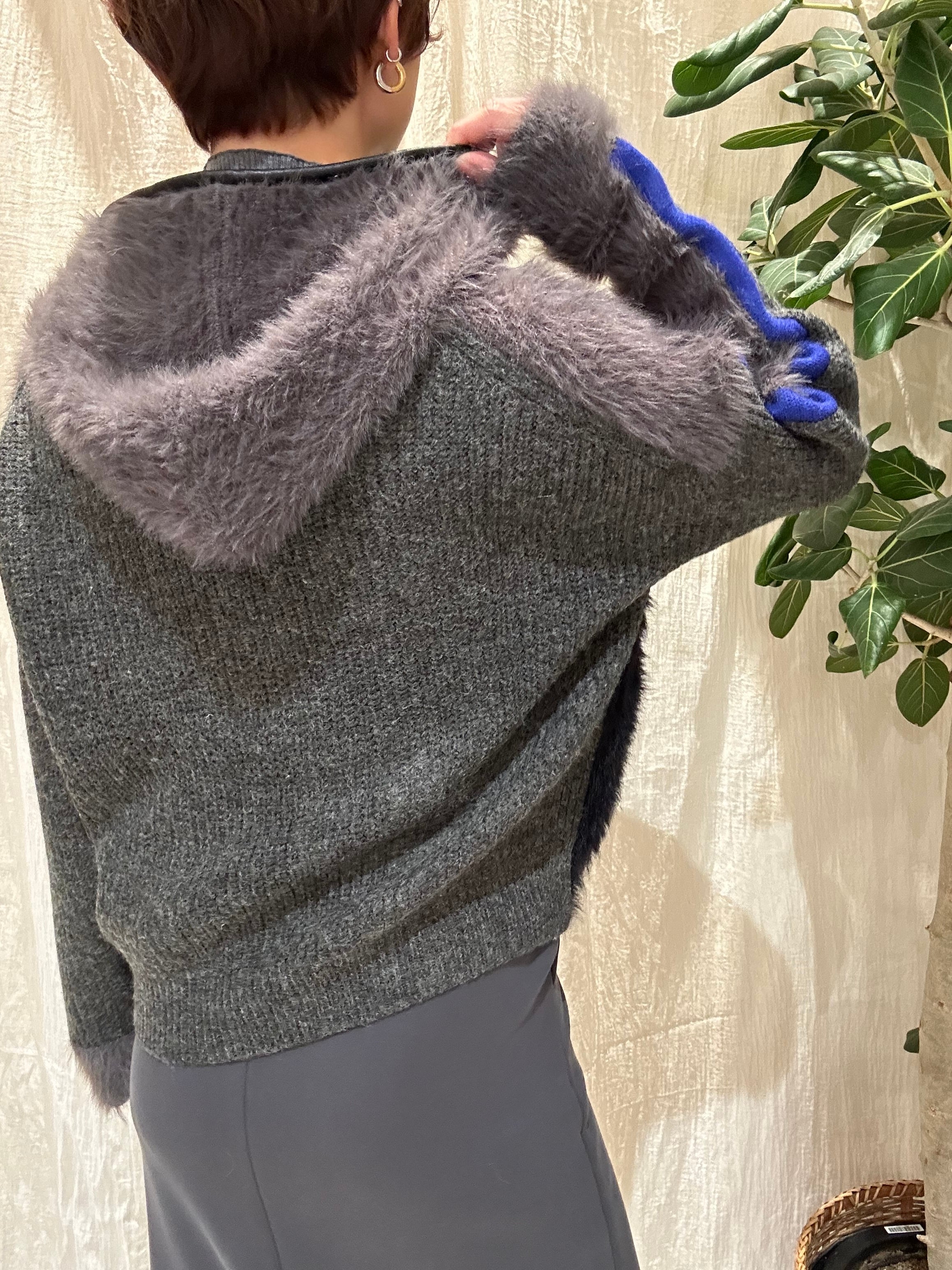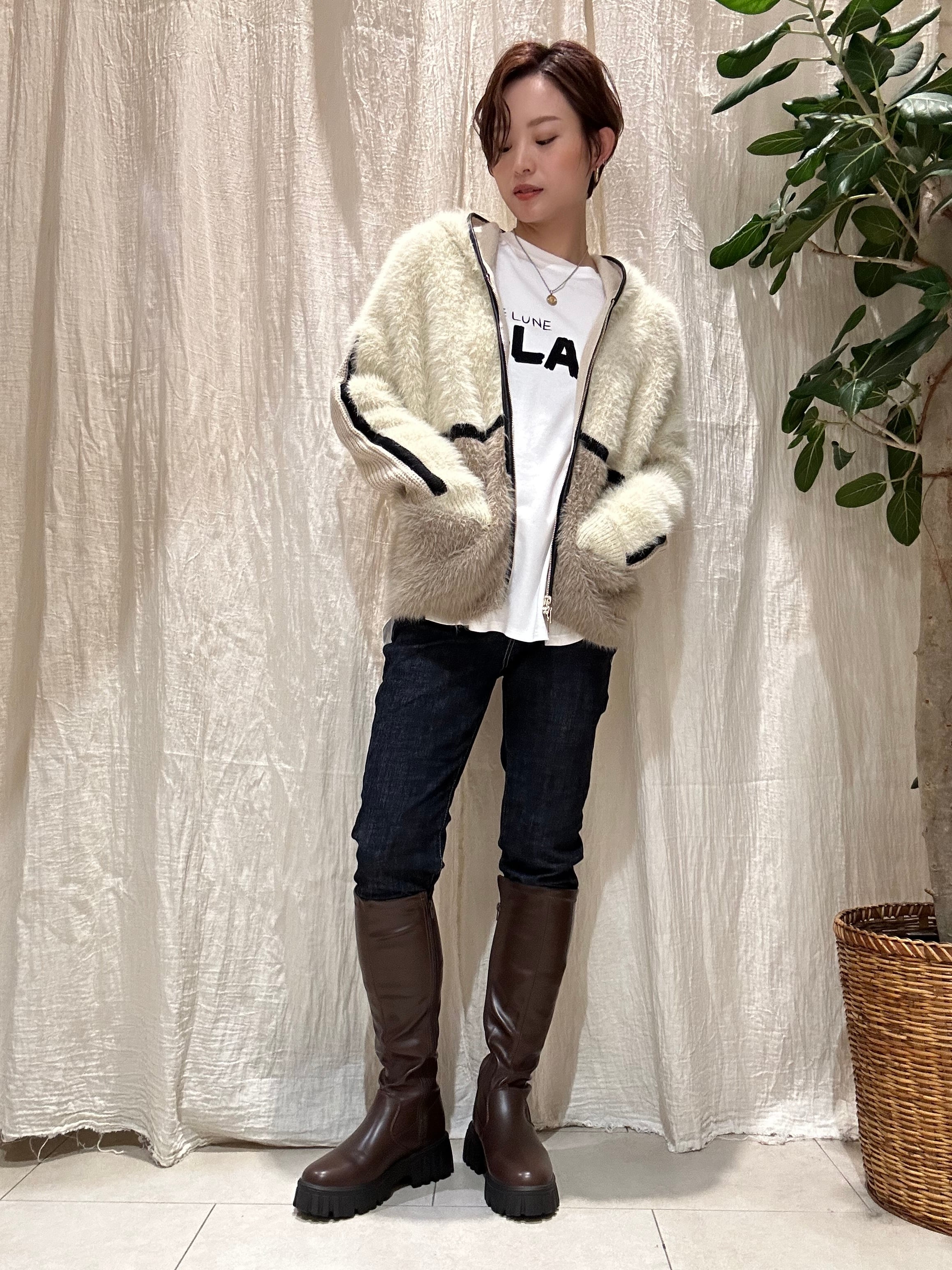 シャギーヤーンのふんわりとした表情に、袖やフロントの配色ラインがリズムを生み、ブルゾンの洒落感をぐっと引き立てます。