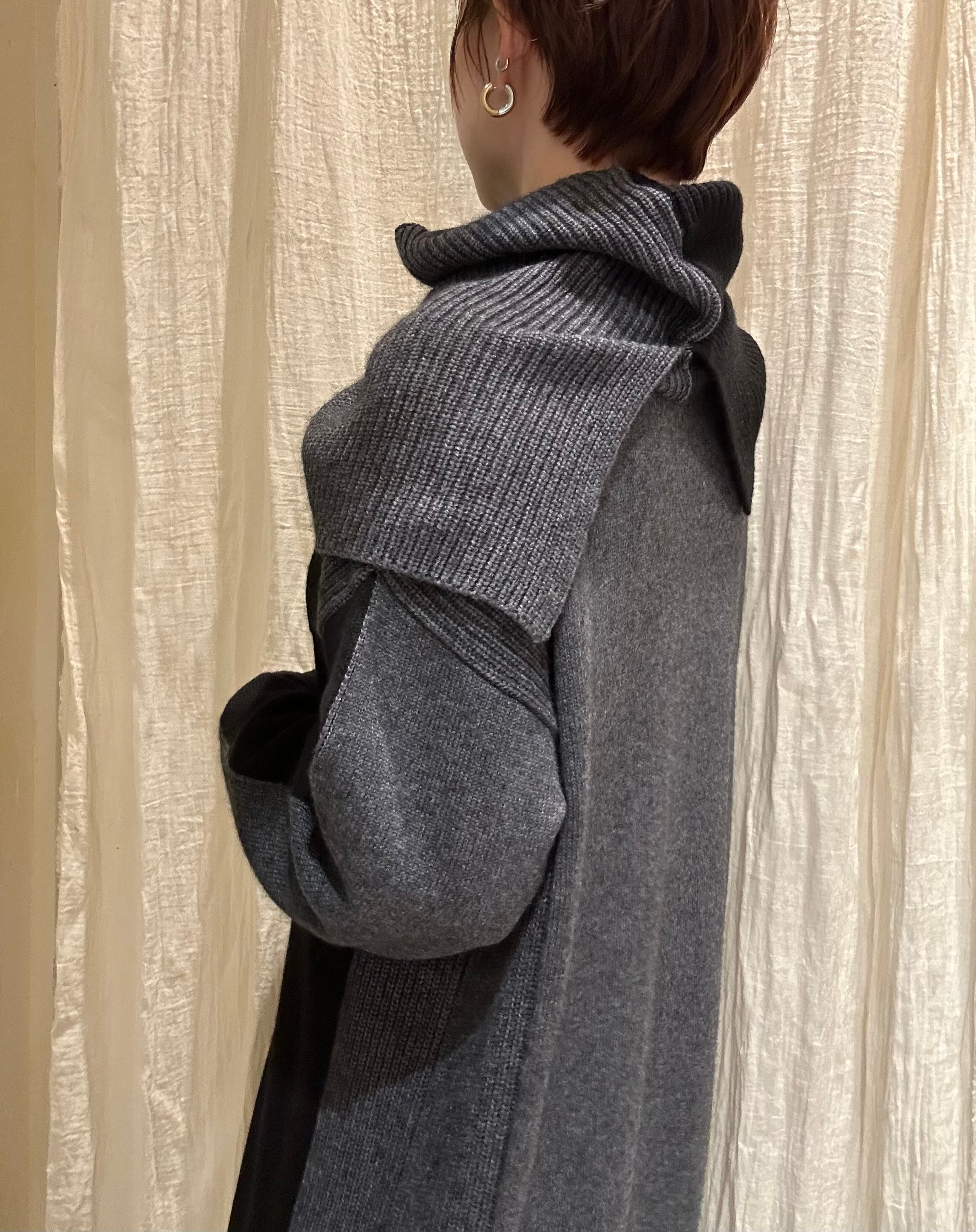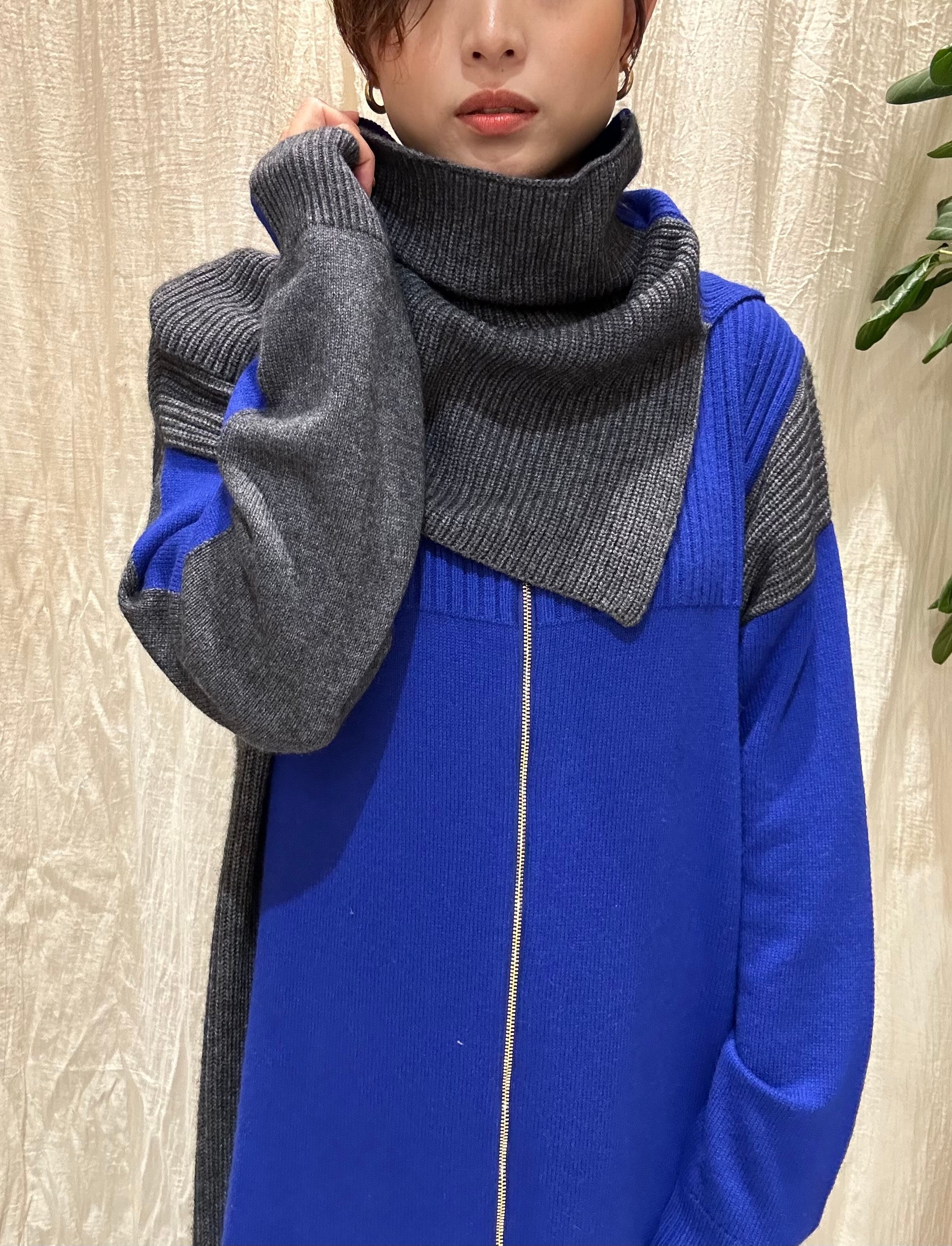 ボリュームのあるバイカラーのネックウォーマーは、付けても外してもOK。