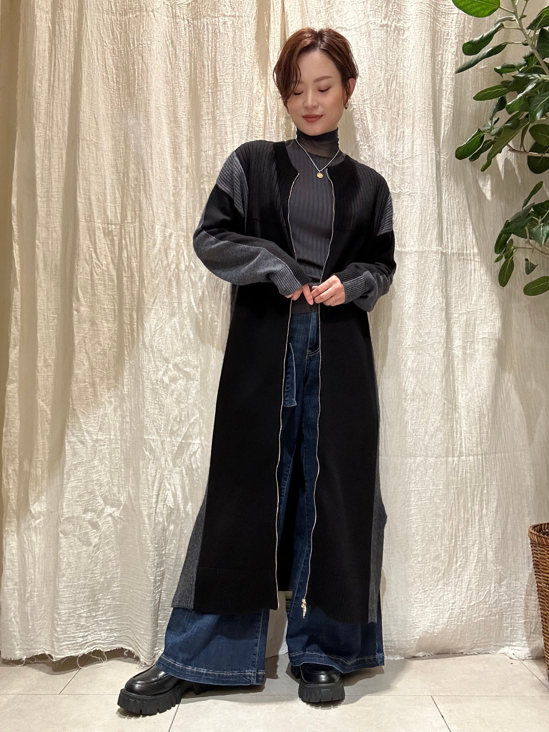 ジップを前にすれば、開けてロングカーディガン風に羽織れる、こなれ感のある着こなしに。
