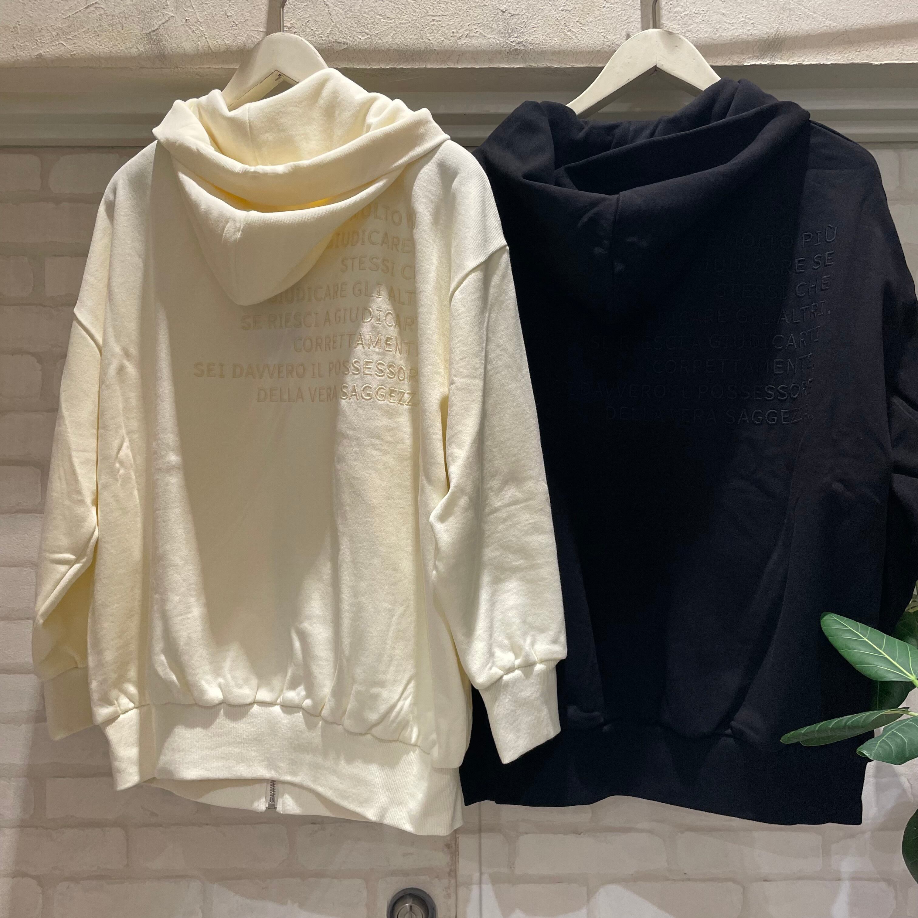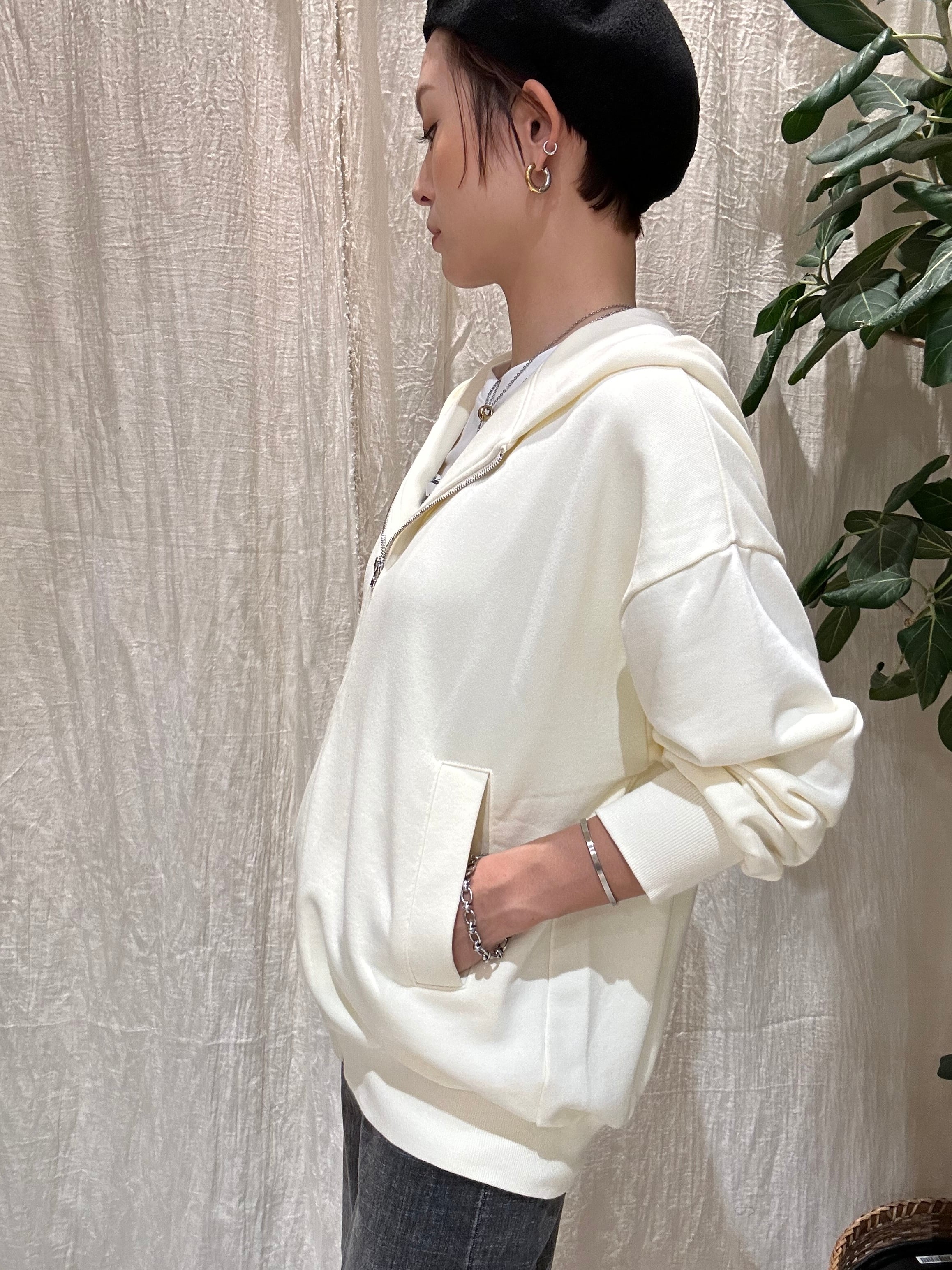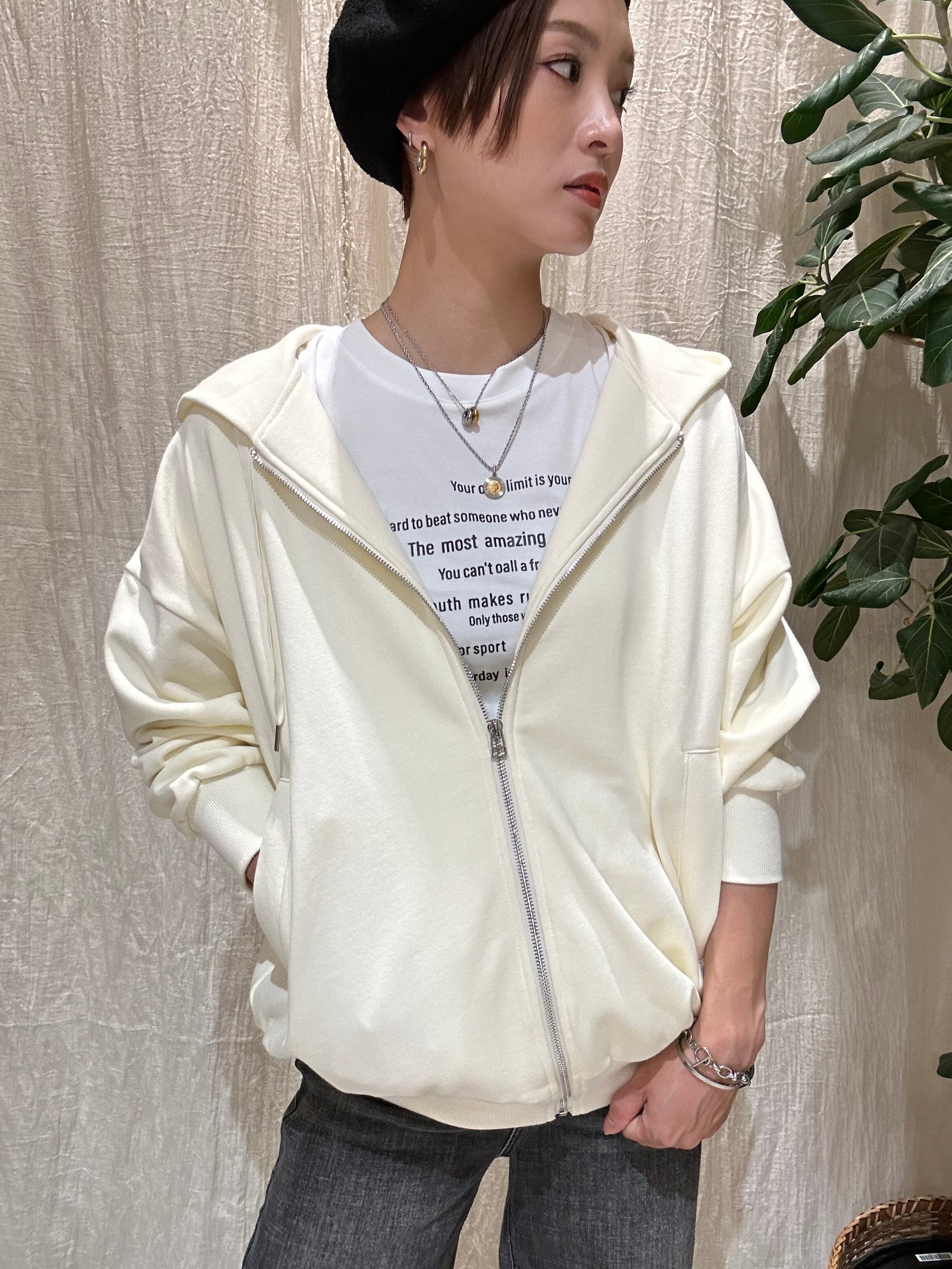 バックのトーンを揃えたロゴがかわいらしいジップパーカー。