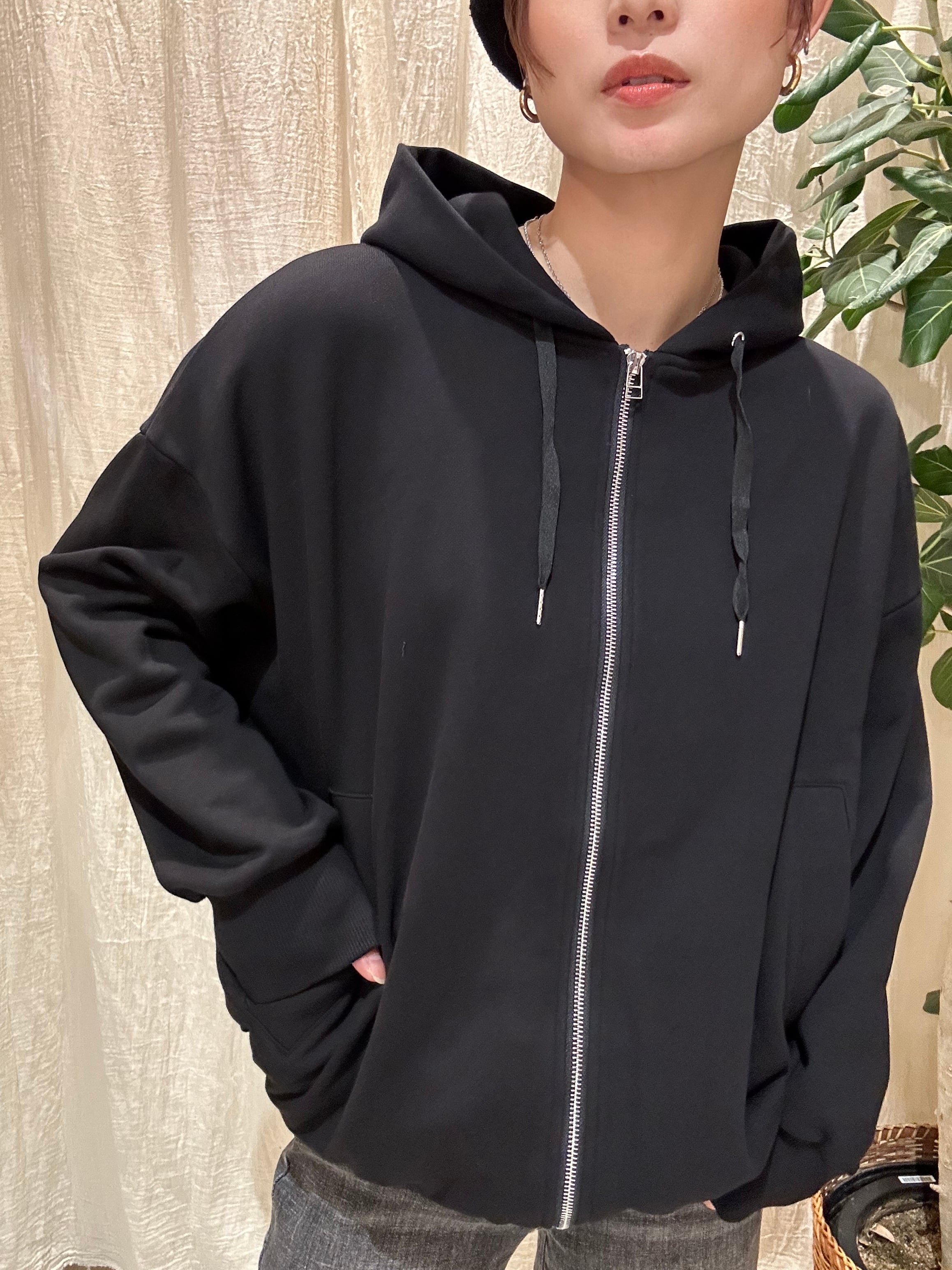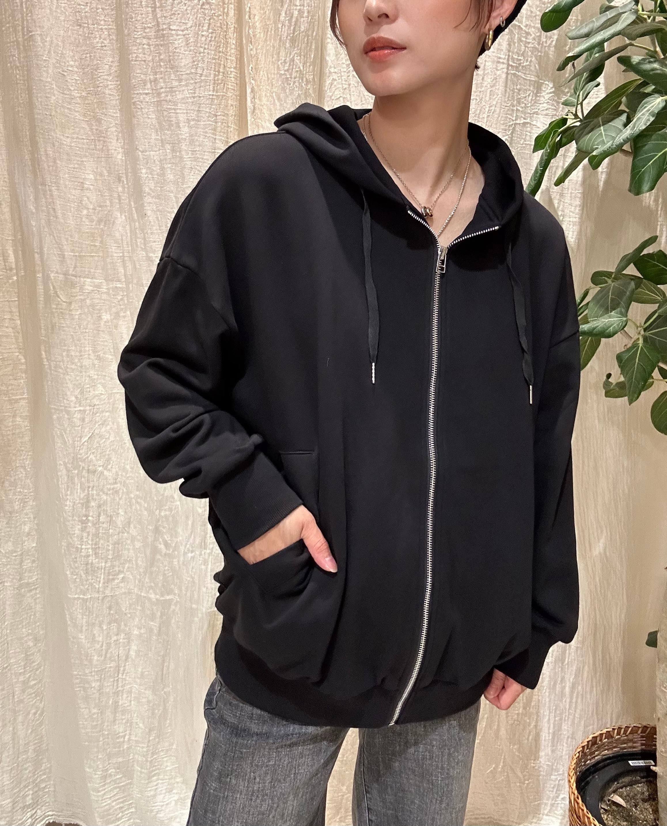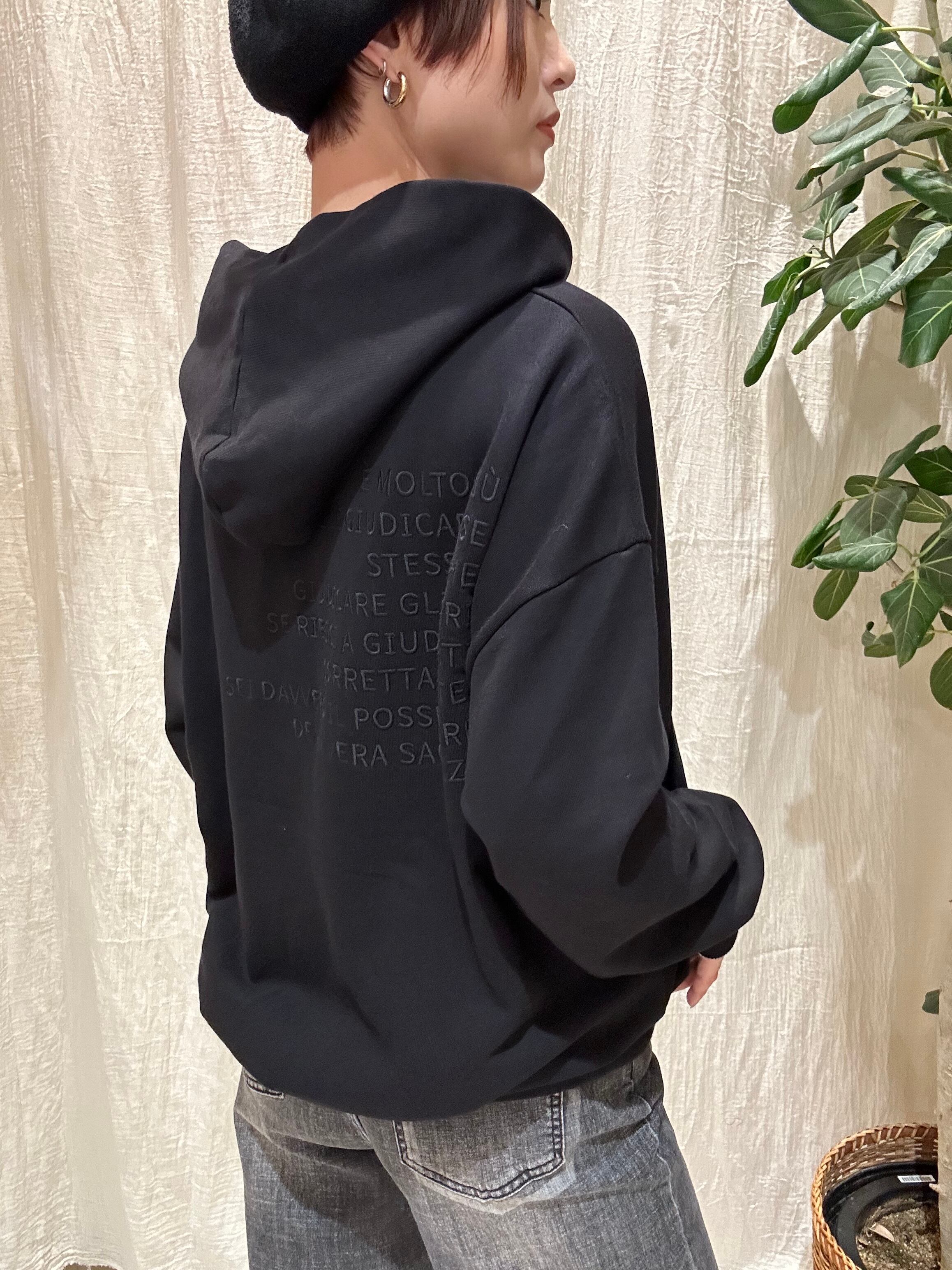 バックのトーンを揃えたロゴがかわいらしいジップパーカー。