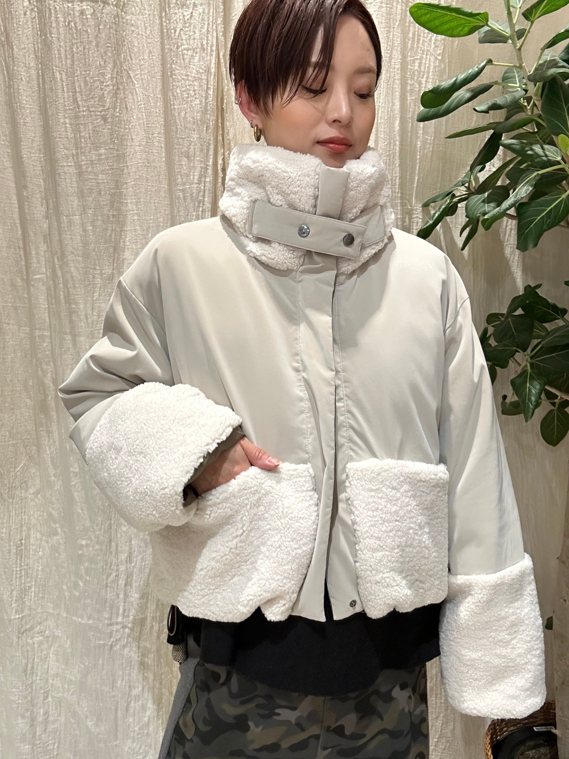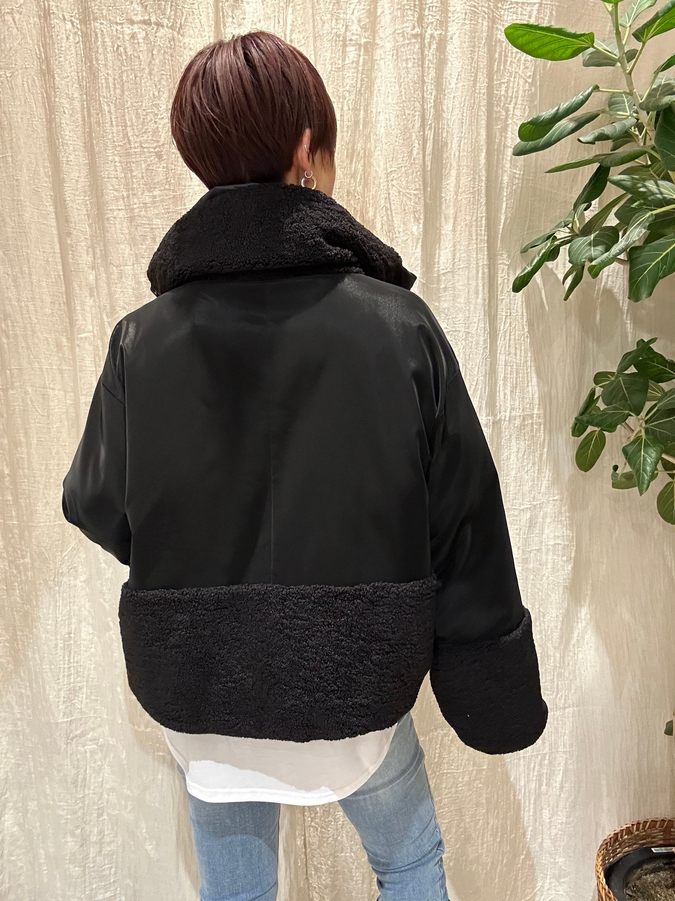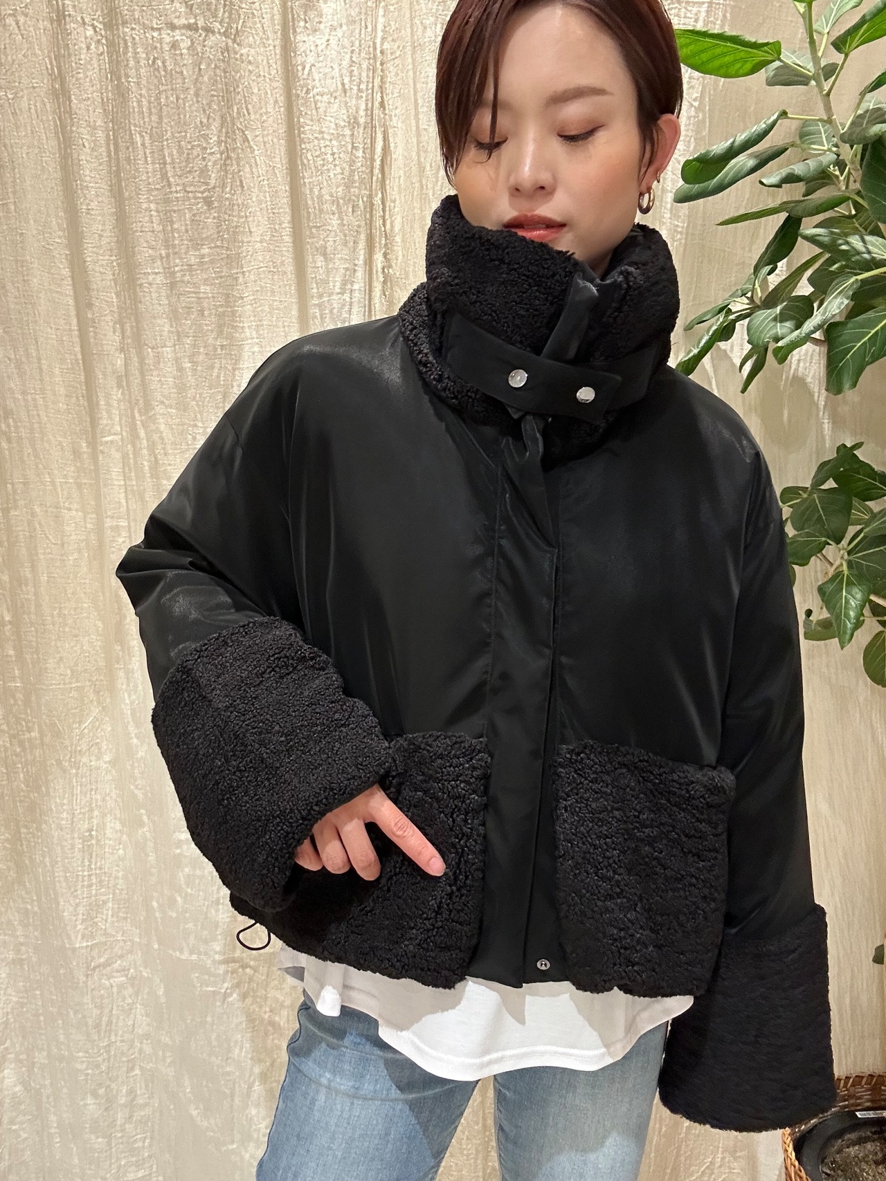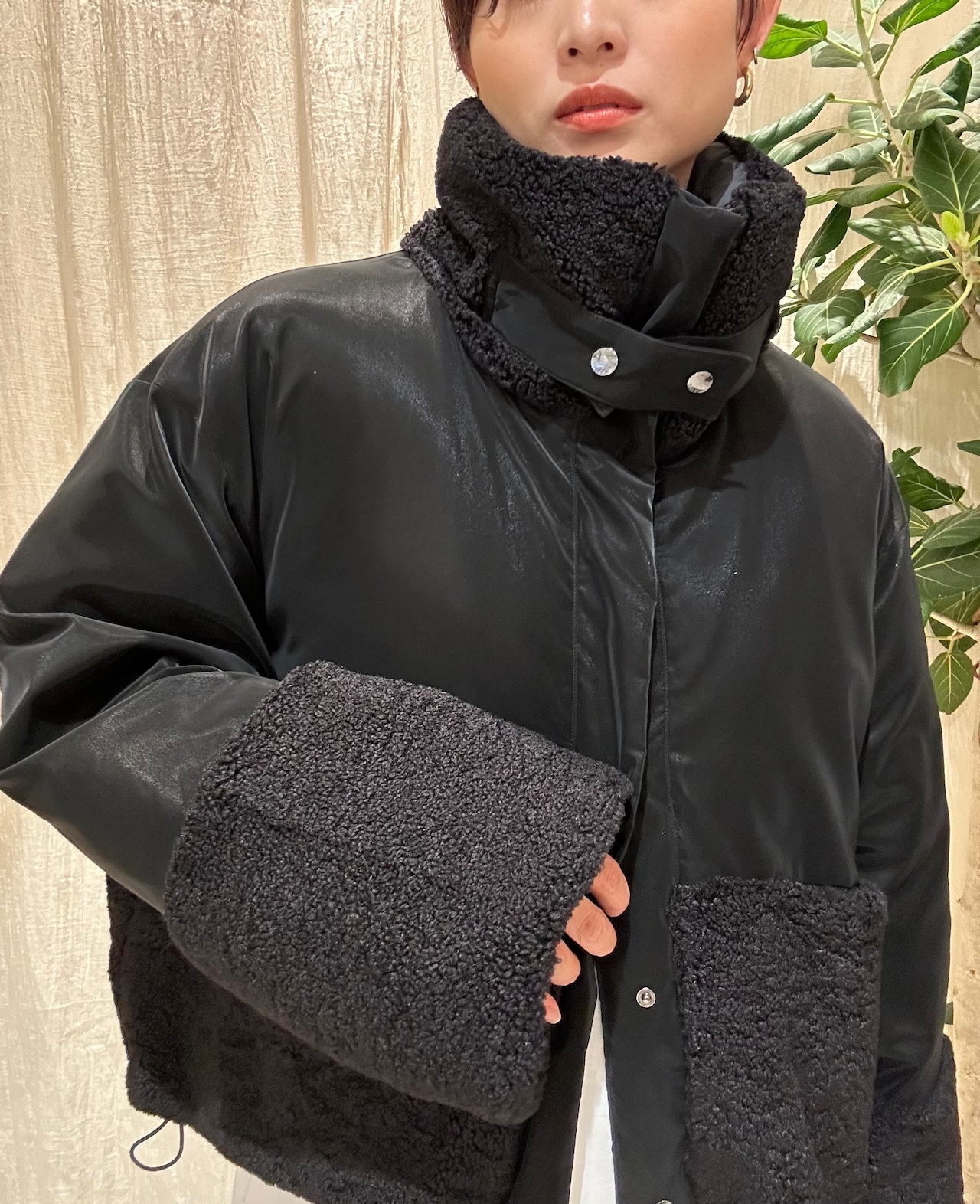 ボア素材と艶感のあるナイロン素材を組み合わせたスタンドカラージャケット。
