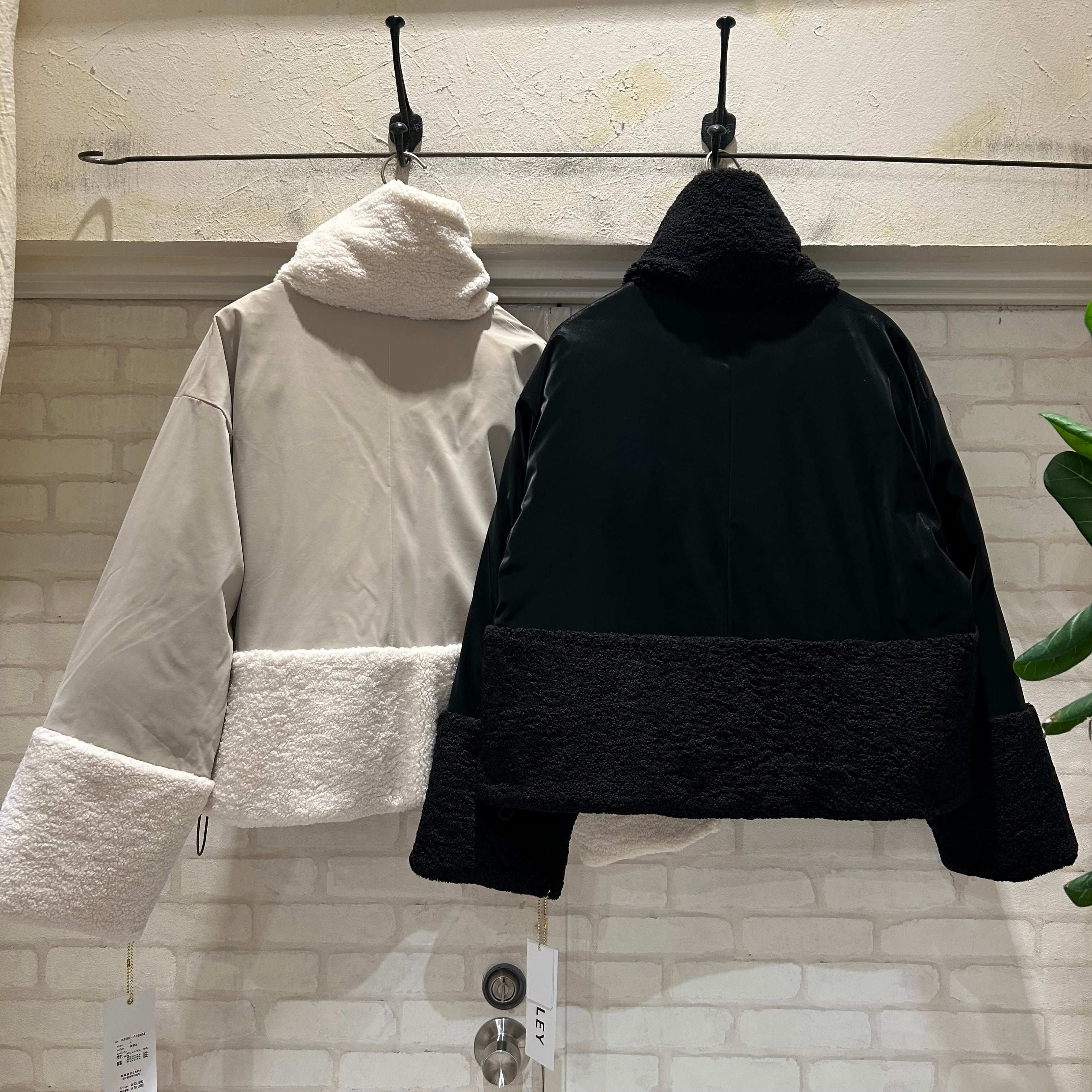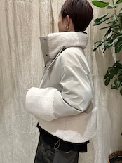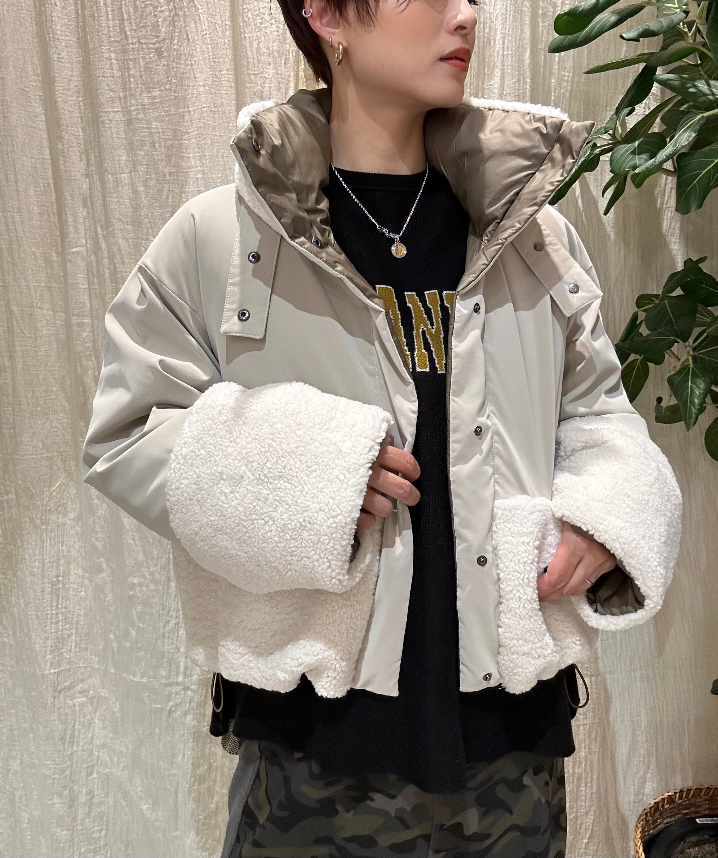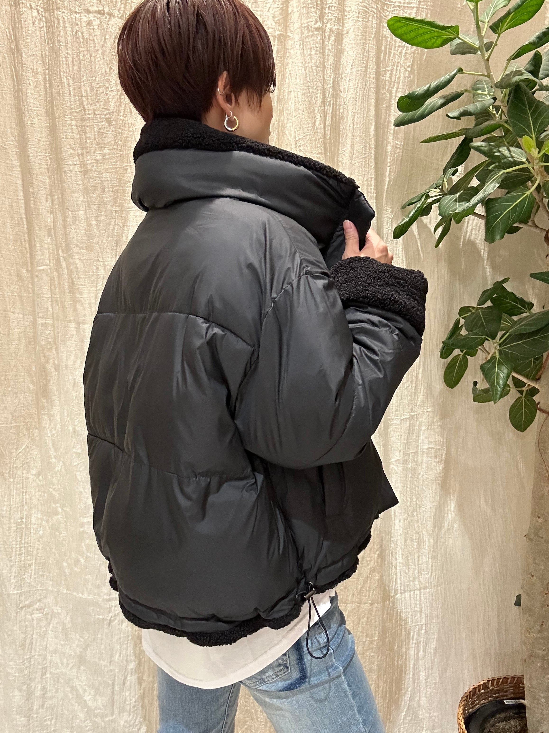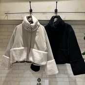 ボア素材と艶感のあるナイロン素材を組み合わせたスタンドカラージャケット。