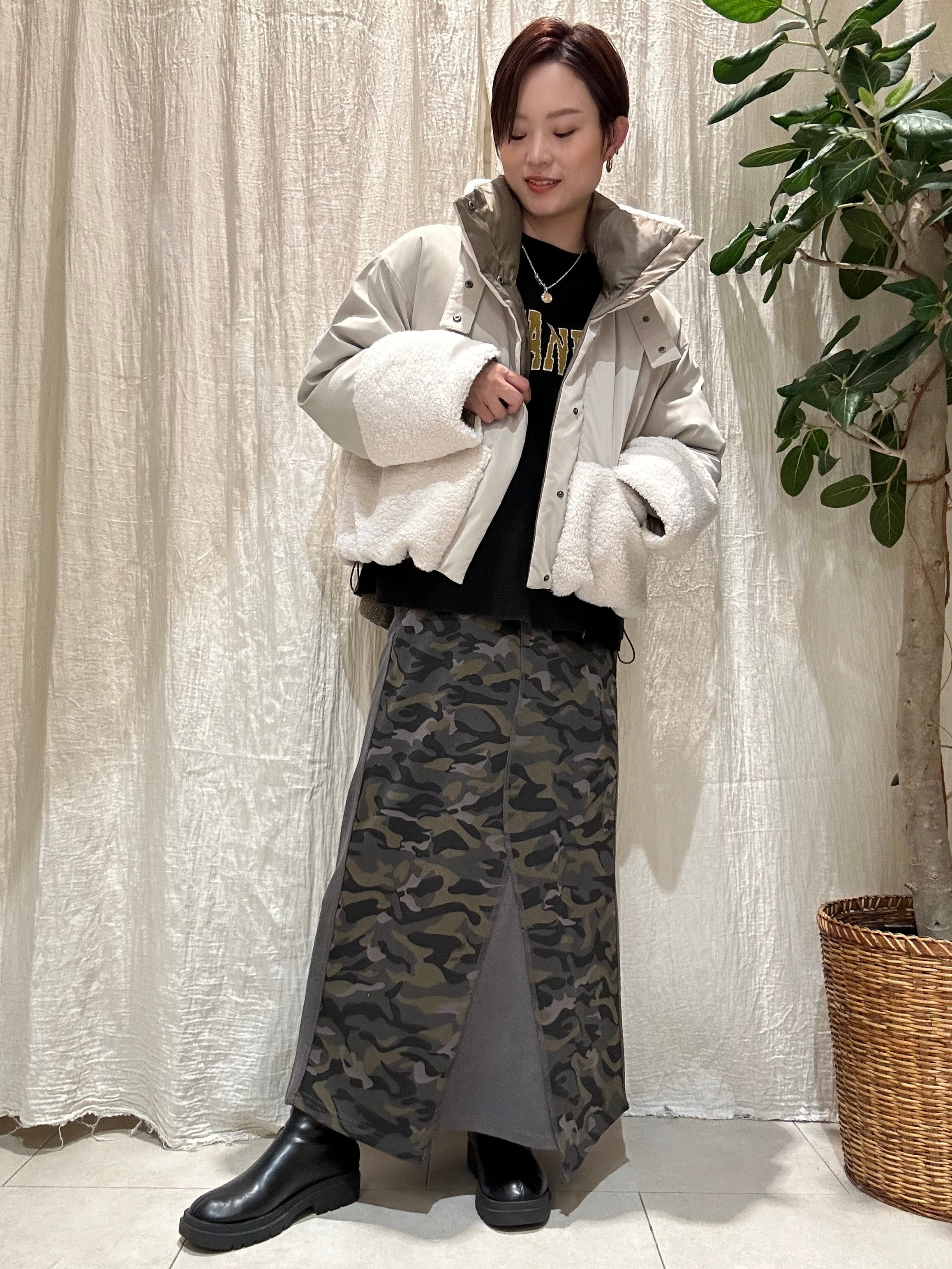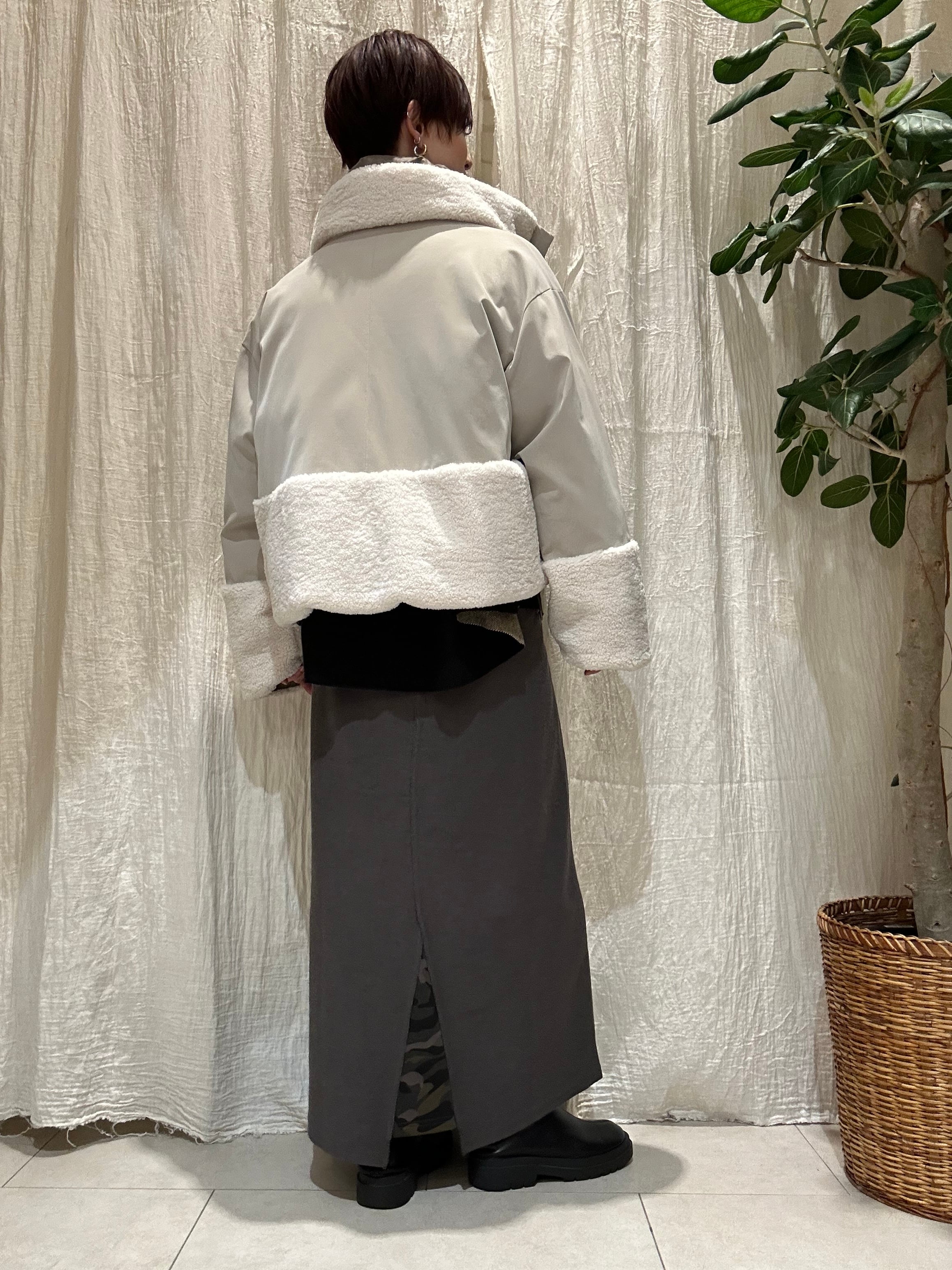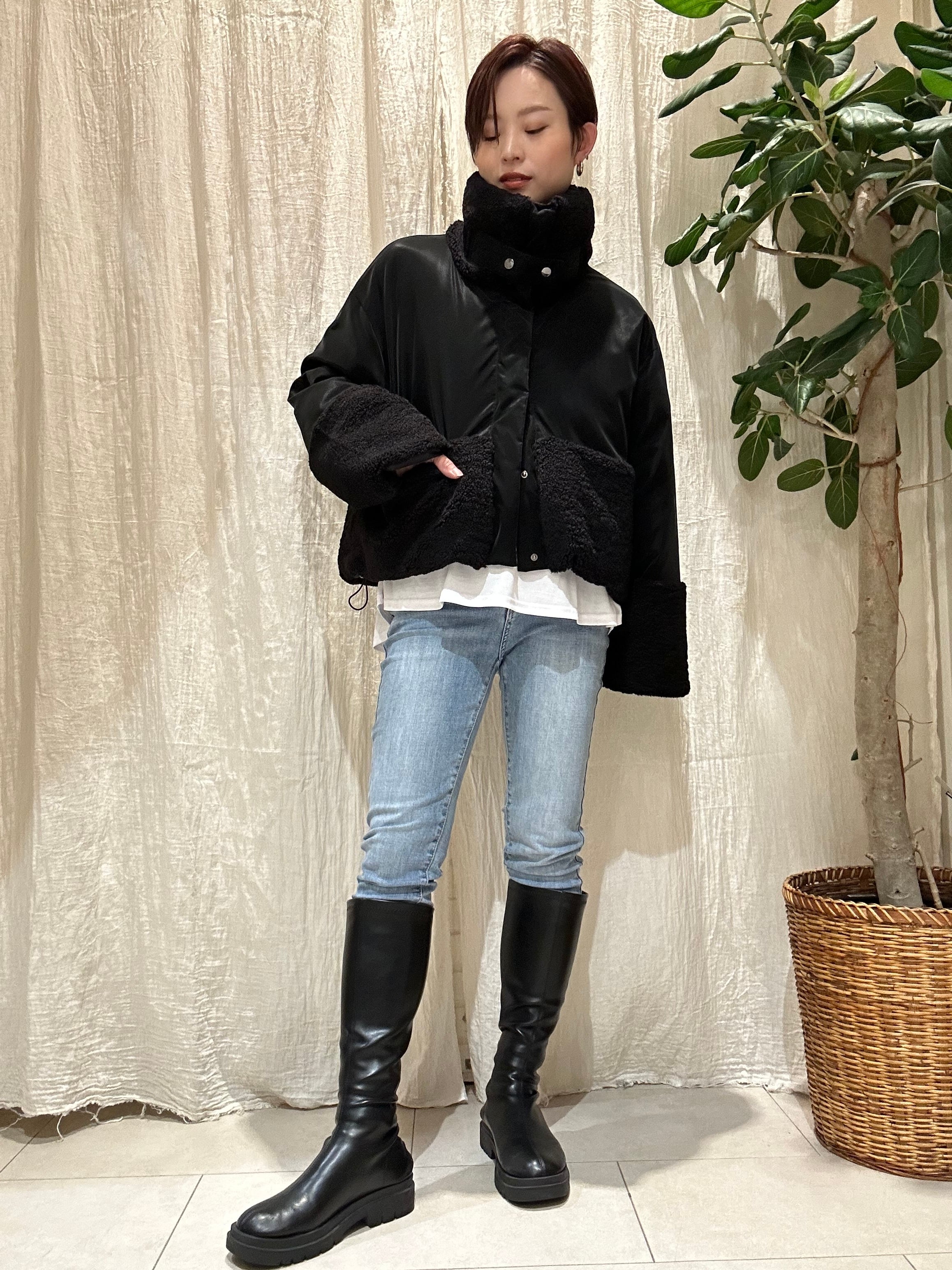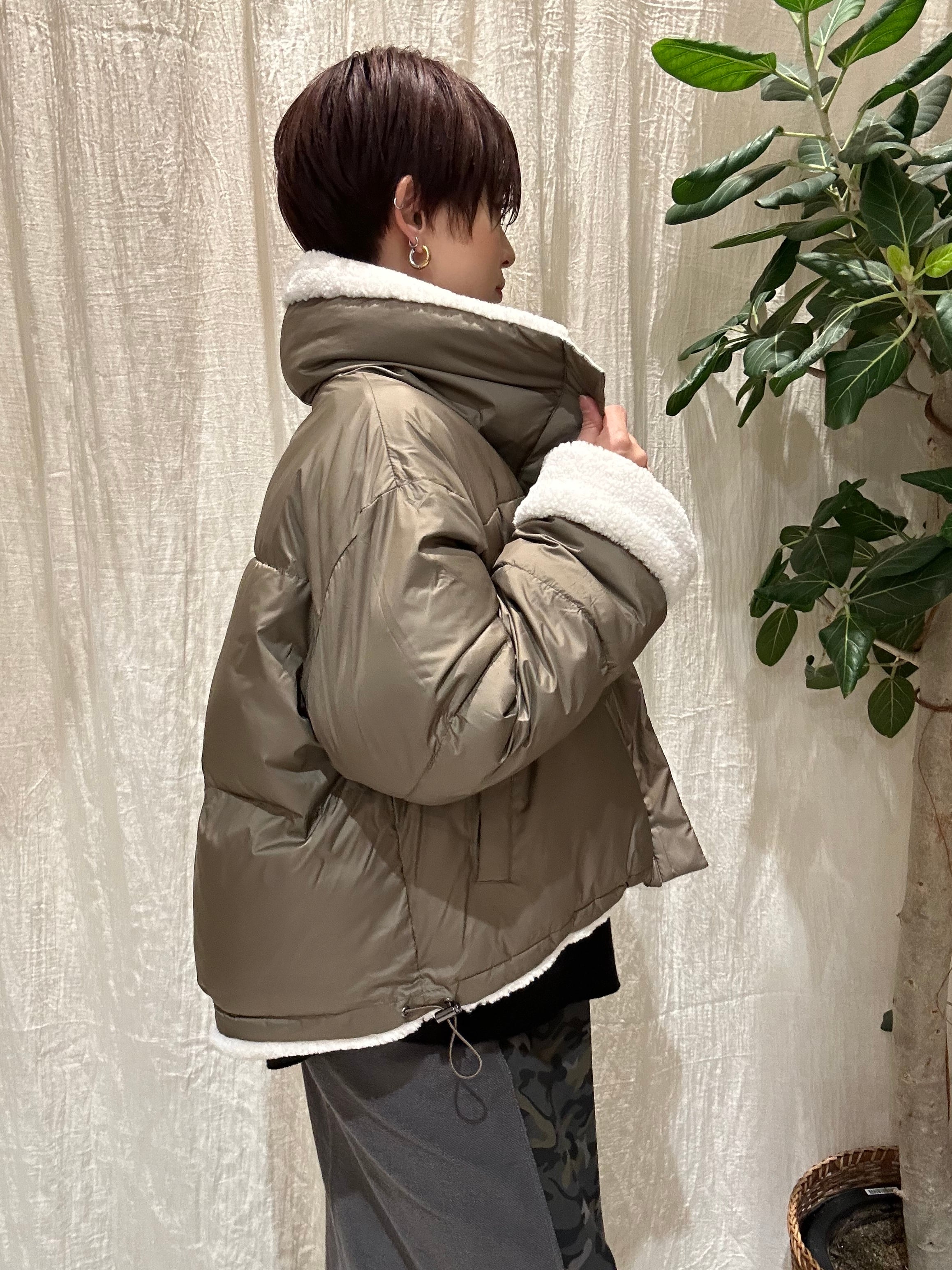 ボア素材と艶感のあるナイロン素材を組み合わせたスタンドカラージャケット。