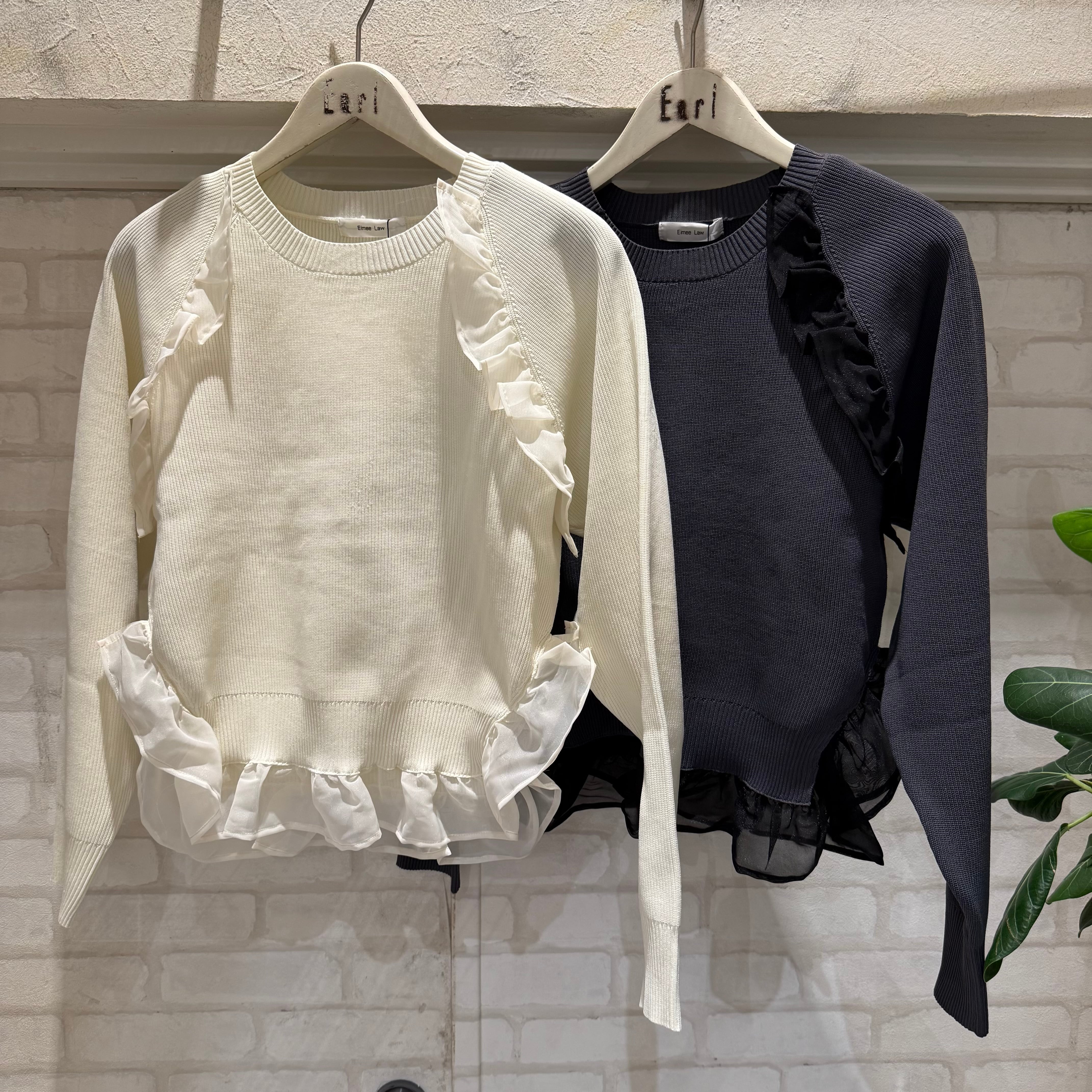 シアーオーガンジーのフリルデザインが可愛いニットトップス。