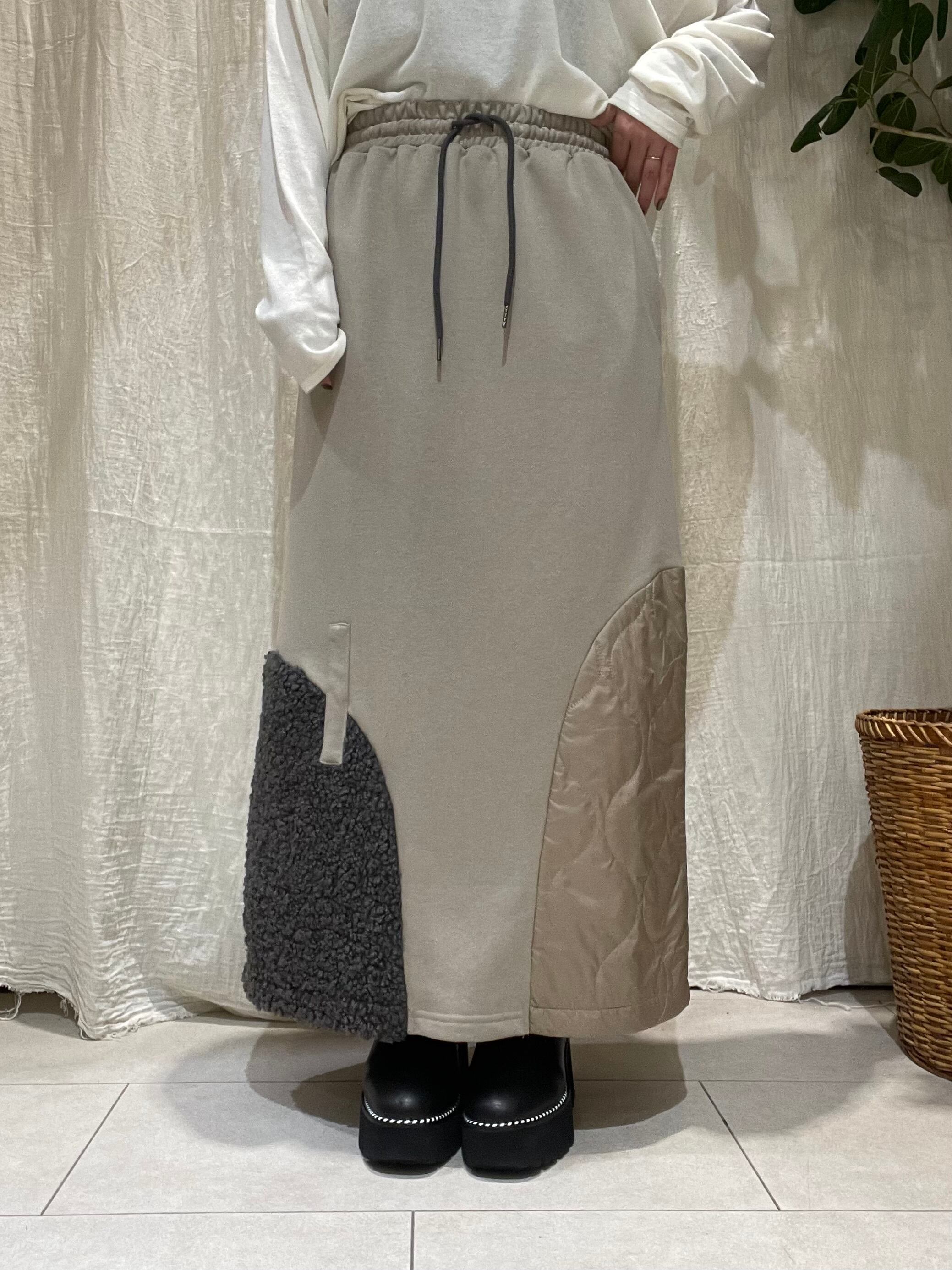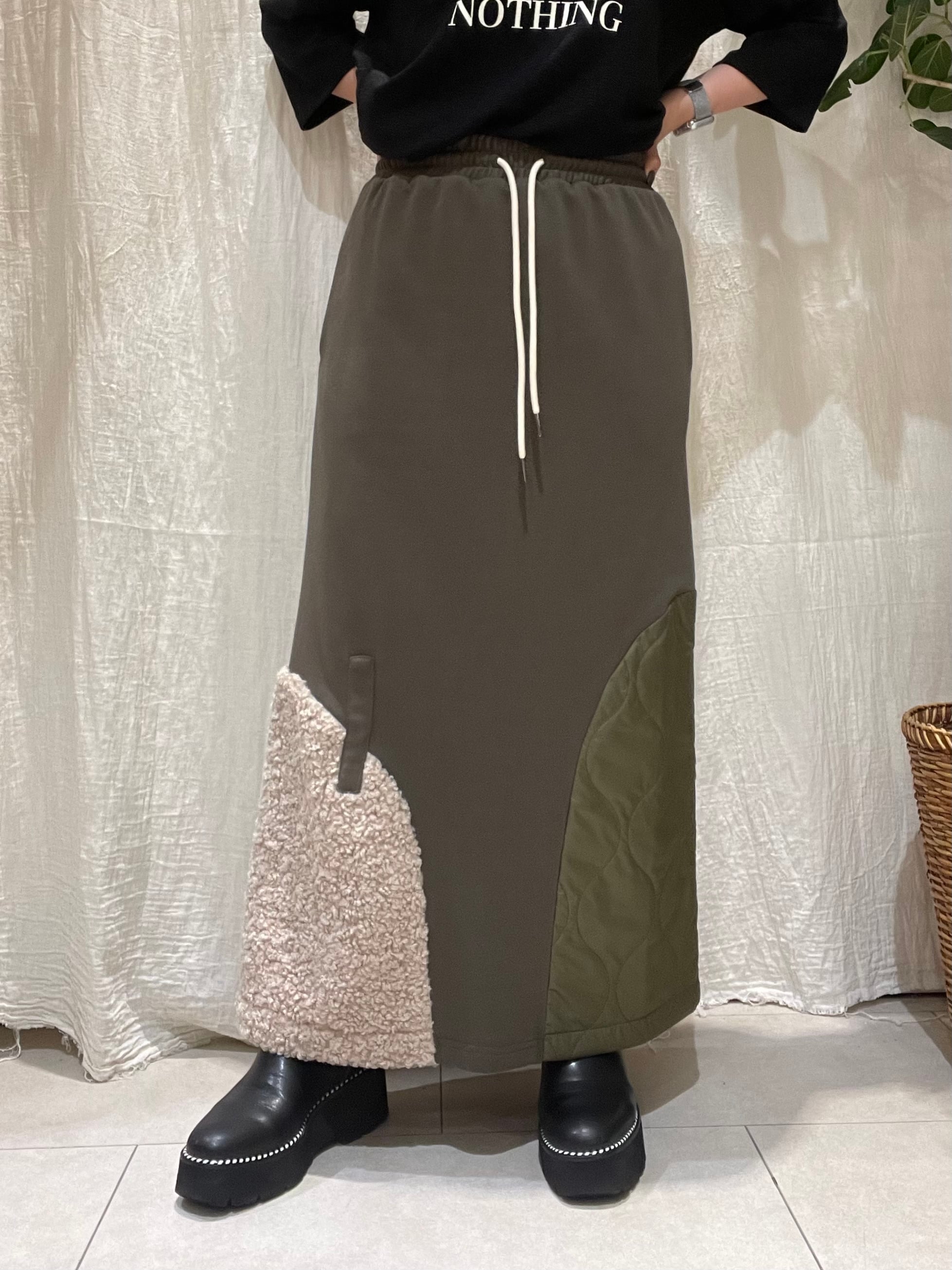 異素材の切り替えデザインが魅力のフレアスカートです。