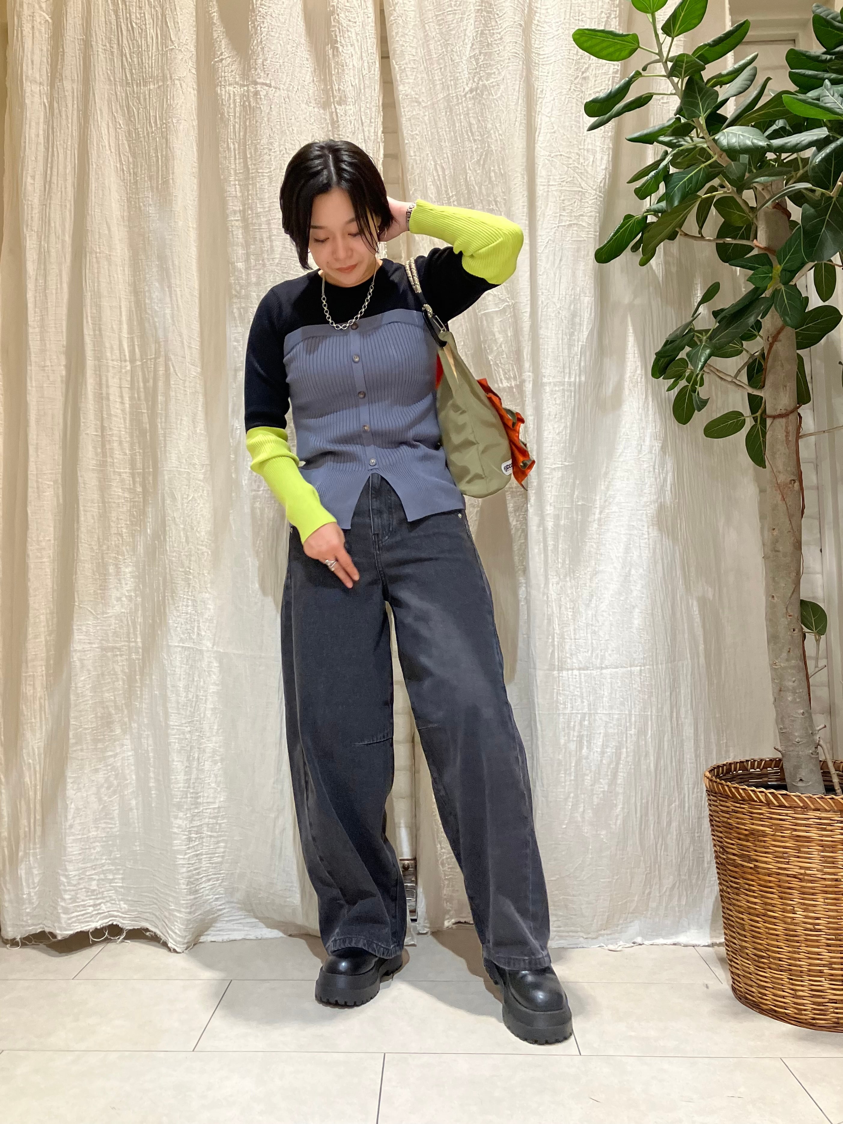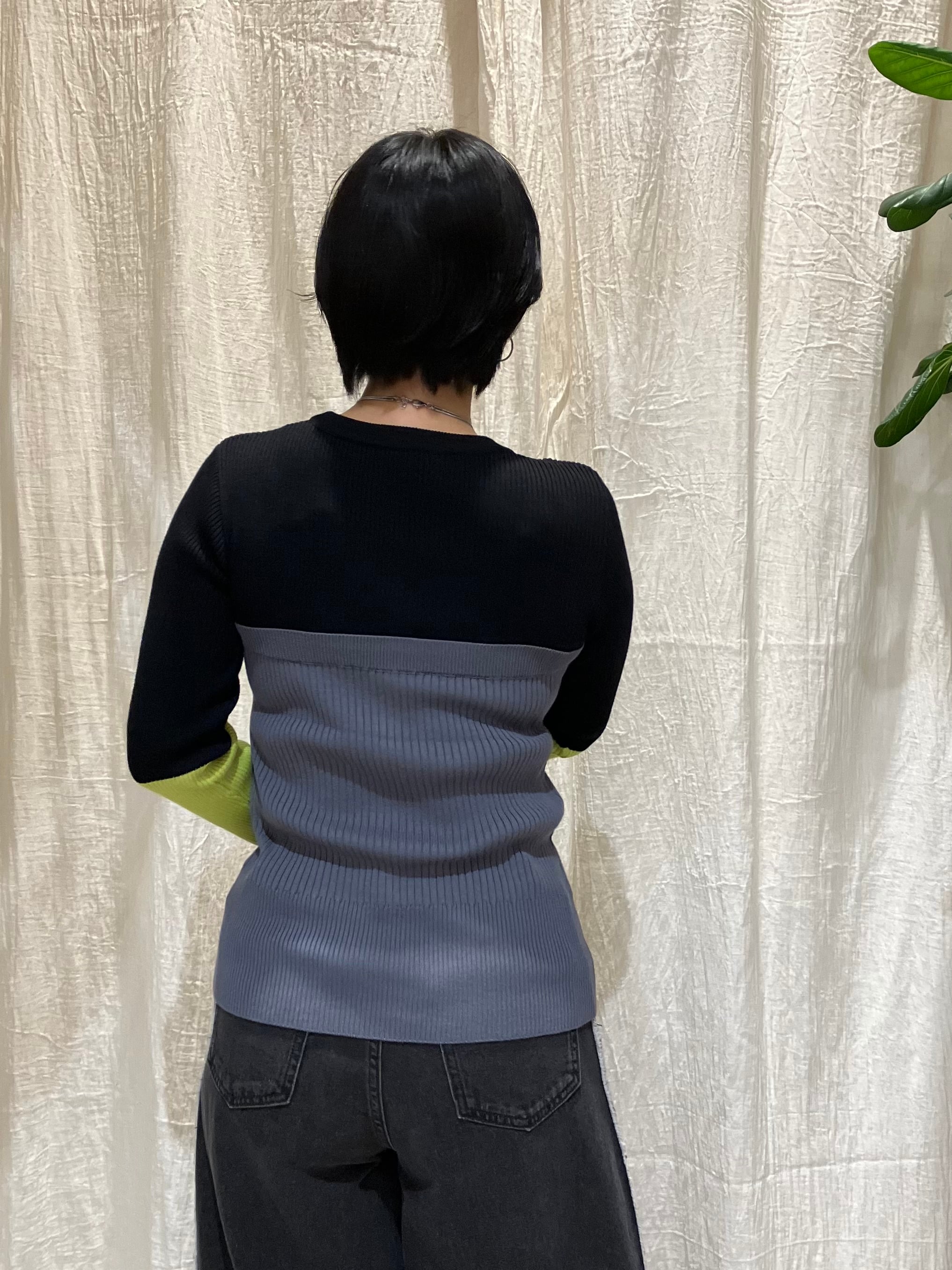 伸縮性があり、袖のカラーがワンポイントで目を惹く可愛いニットです。