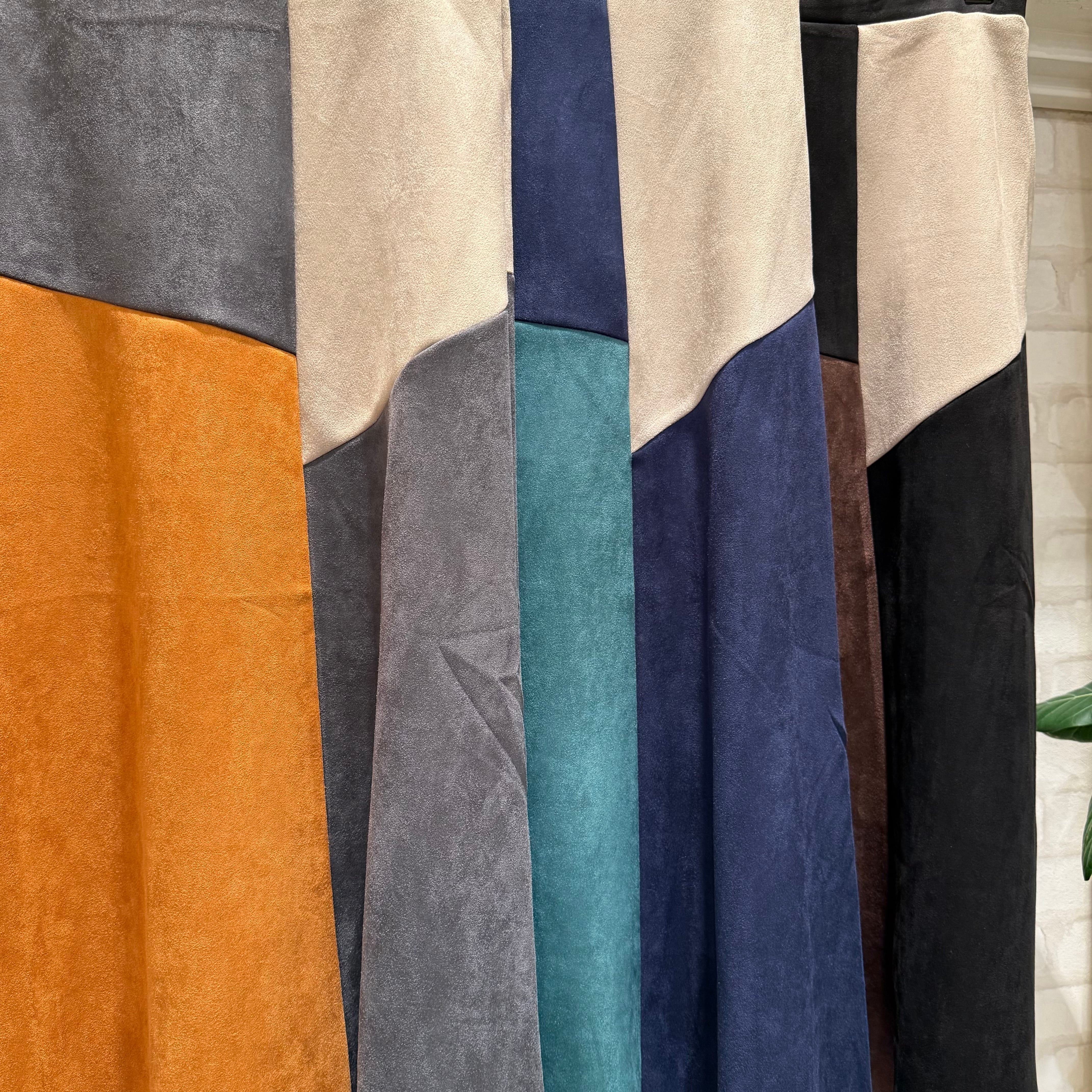 柔らかなスエード素材を使用した配色ブロッキングスカート。