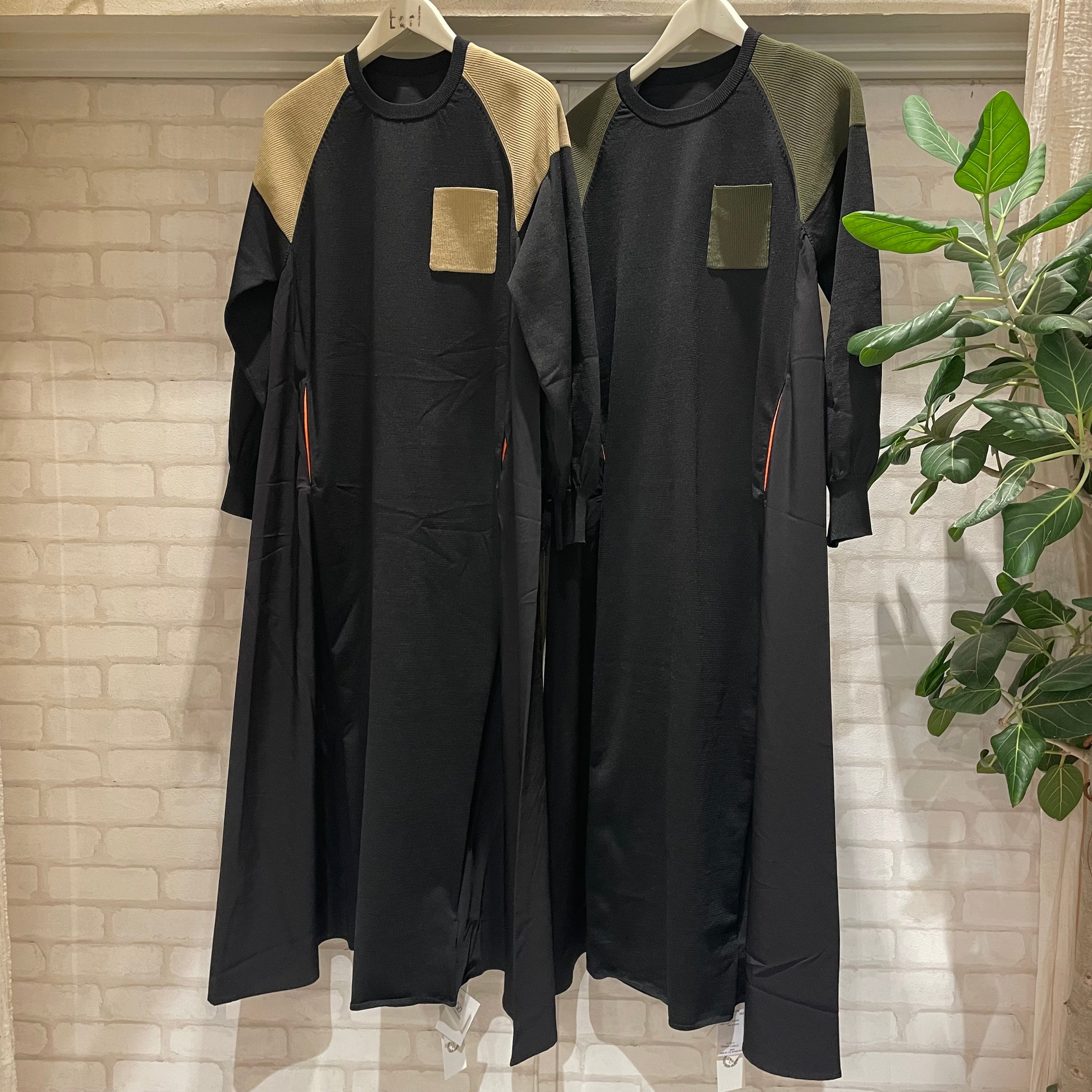 ニットとナイロンの切り替えデザインがお洒落なロングフレアワンピース。