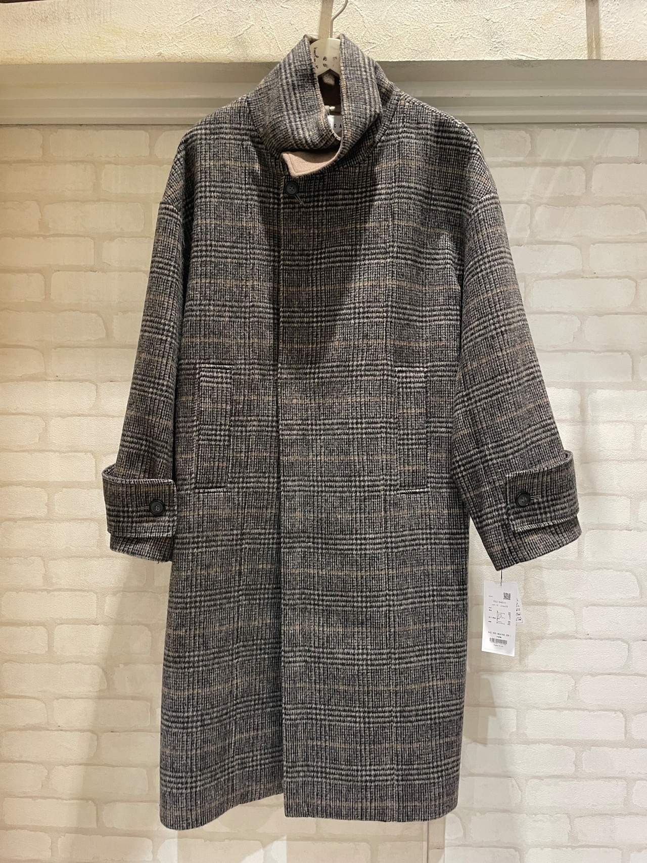上品なチェック柄が目を惹くウールコート。柔らかな風合いで、首元までしっかり暖かいスタンドカラー仕様。