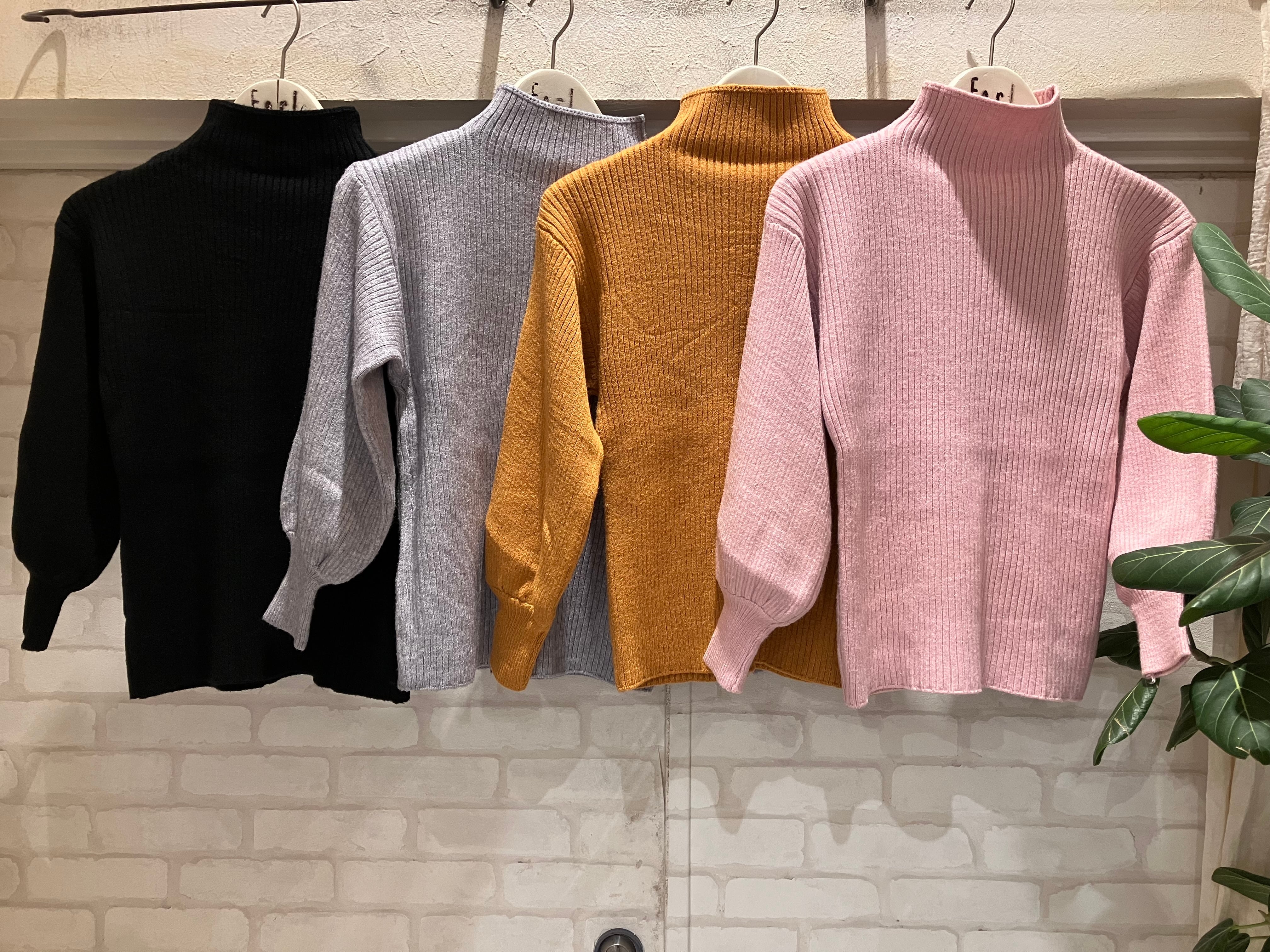 ボリューム袖が女性らしいハイネックリブニットセーター。