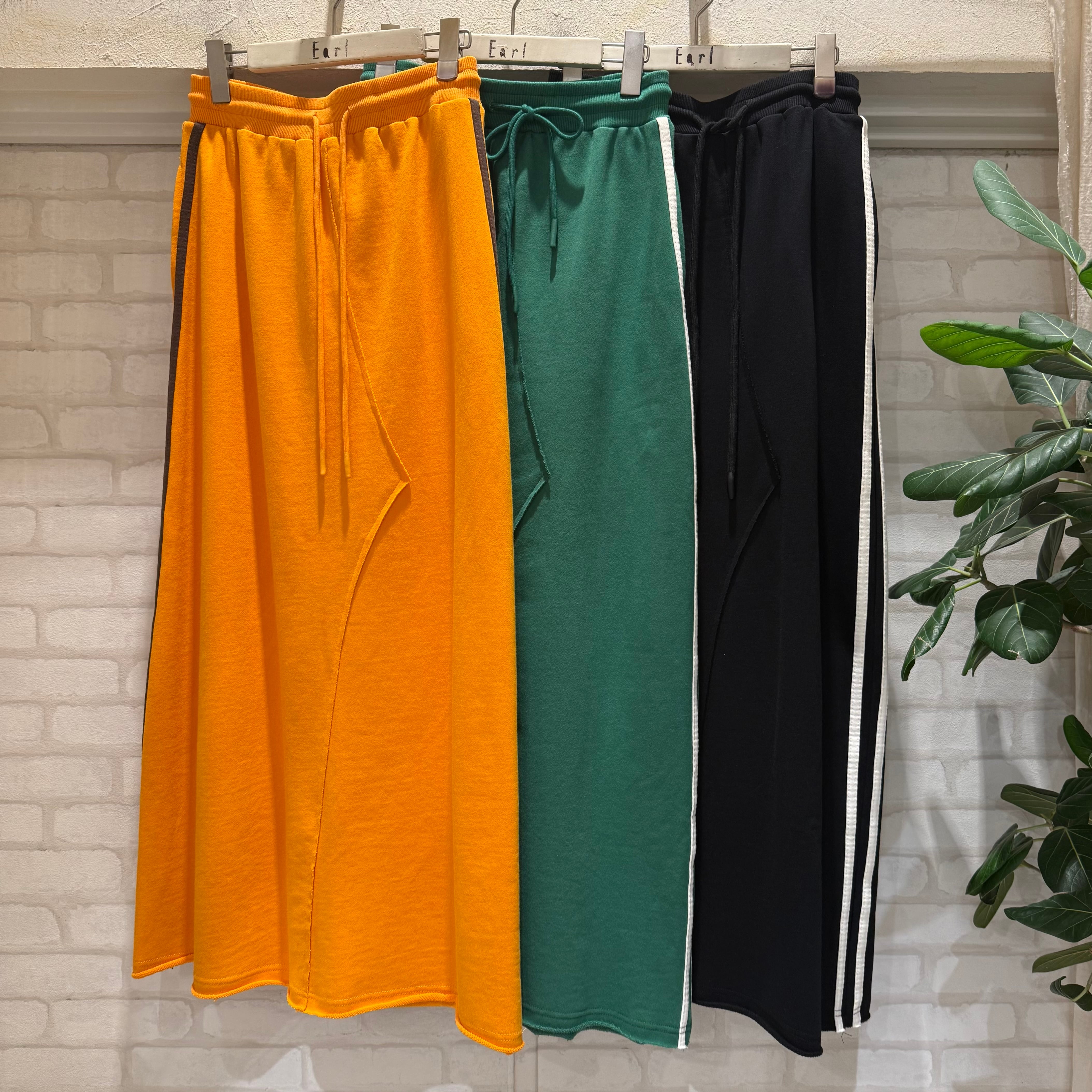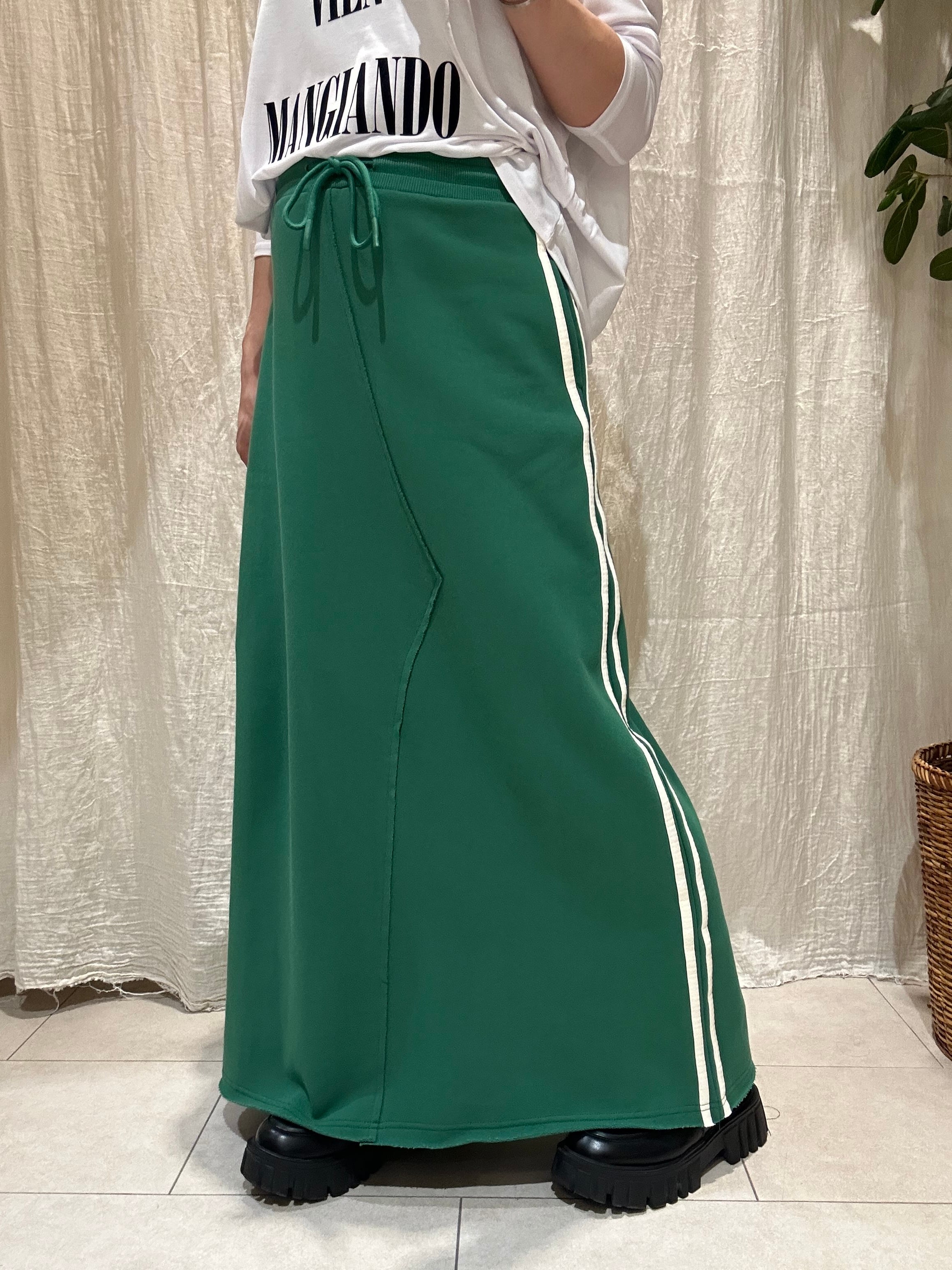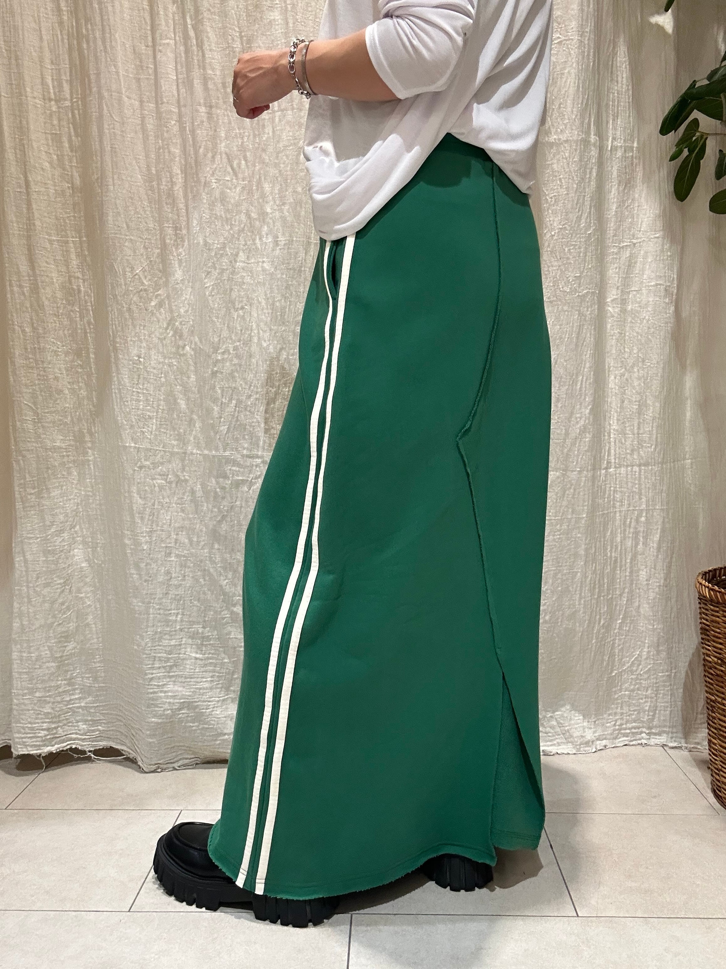 サイドの2本ラインとスウェット素材がカジュアルでおしゃれなスウェットスカート。