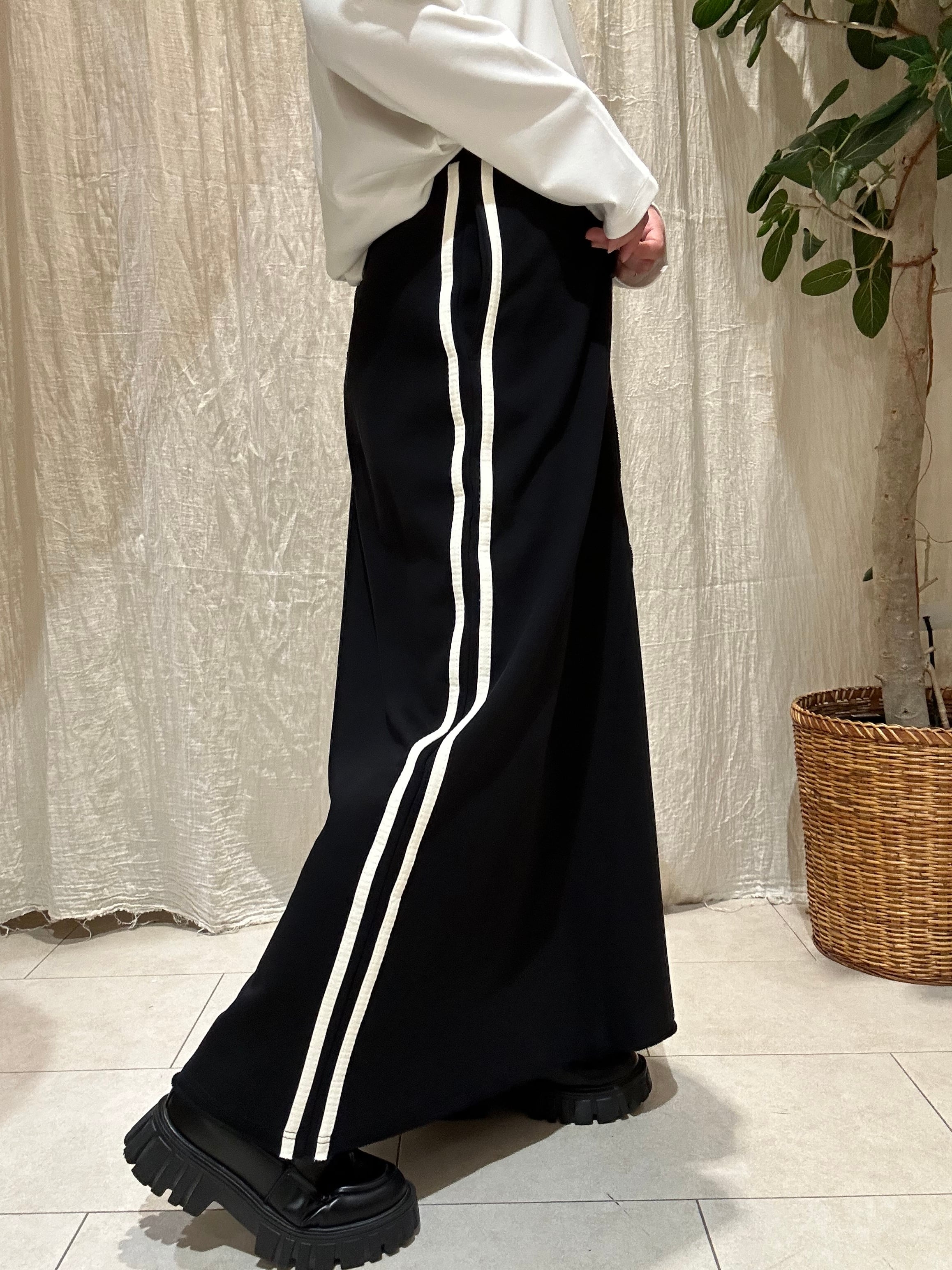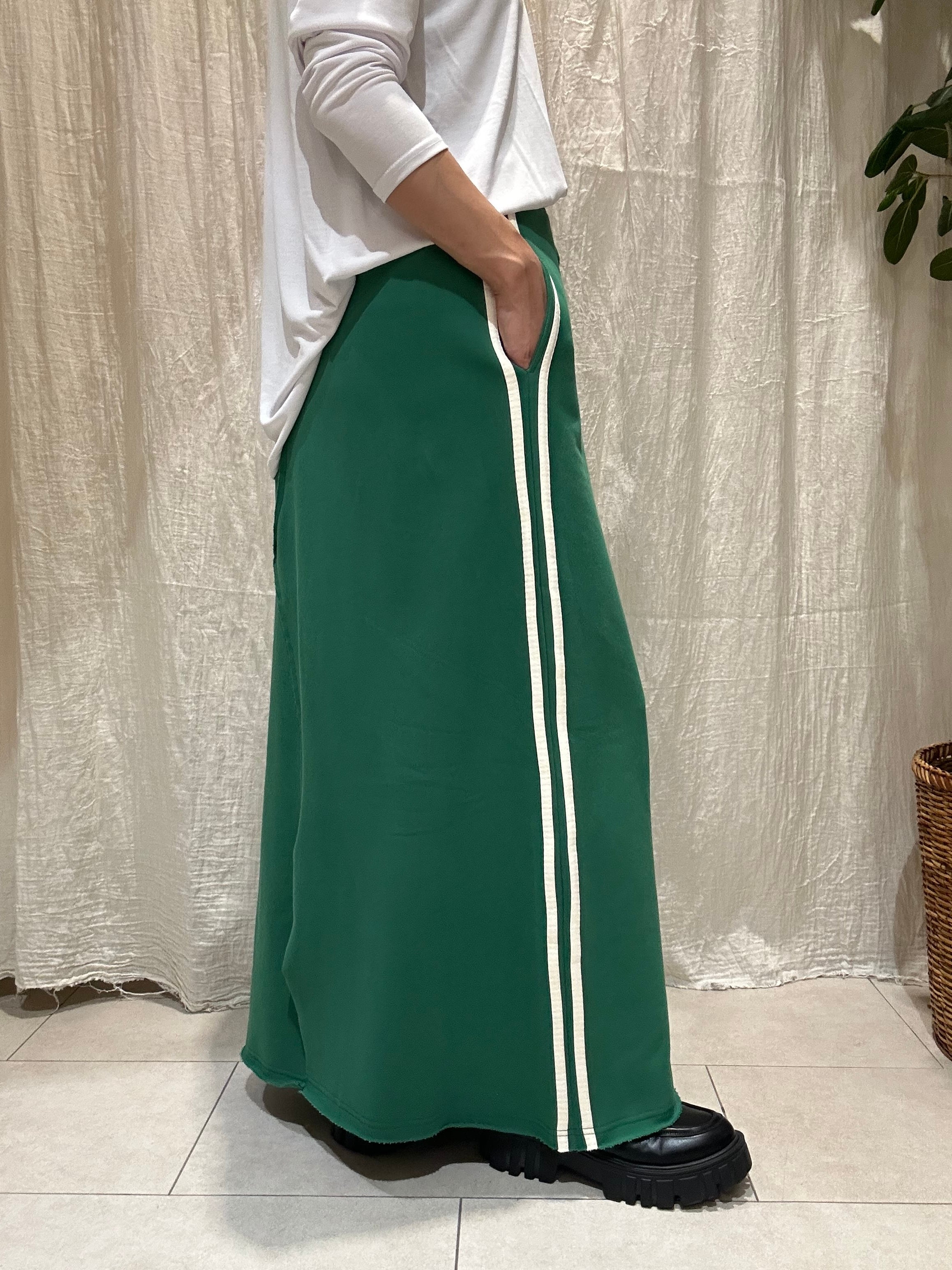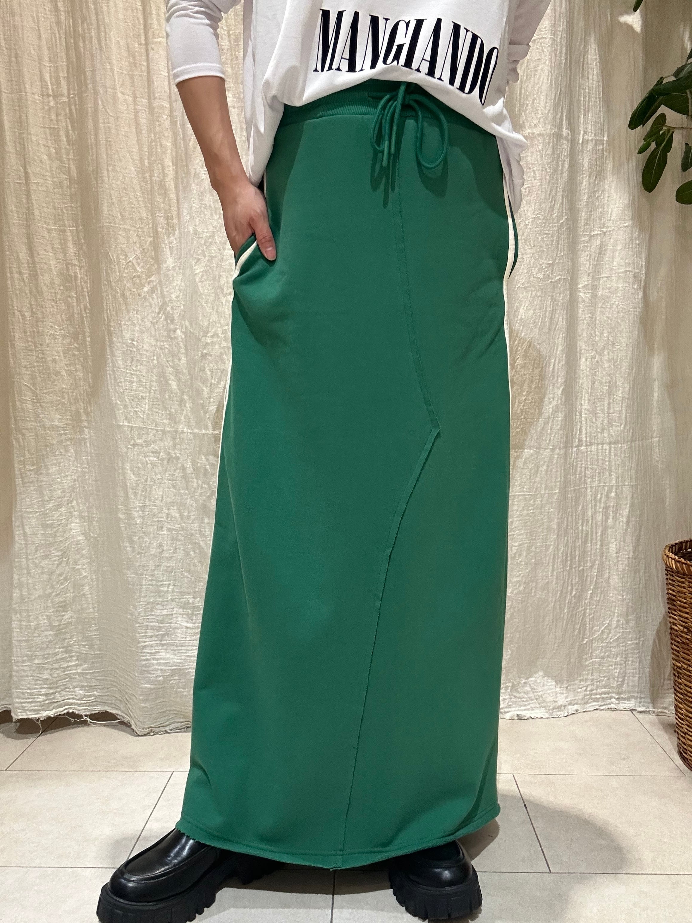 サイドの2本ラインとスウェット素材がカジュアルでおしゃれなスウェットスカート。