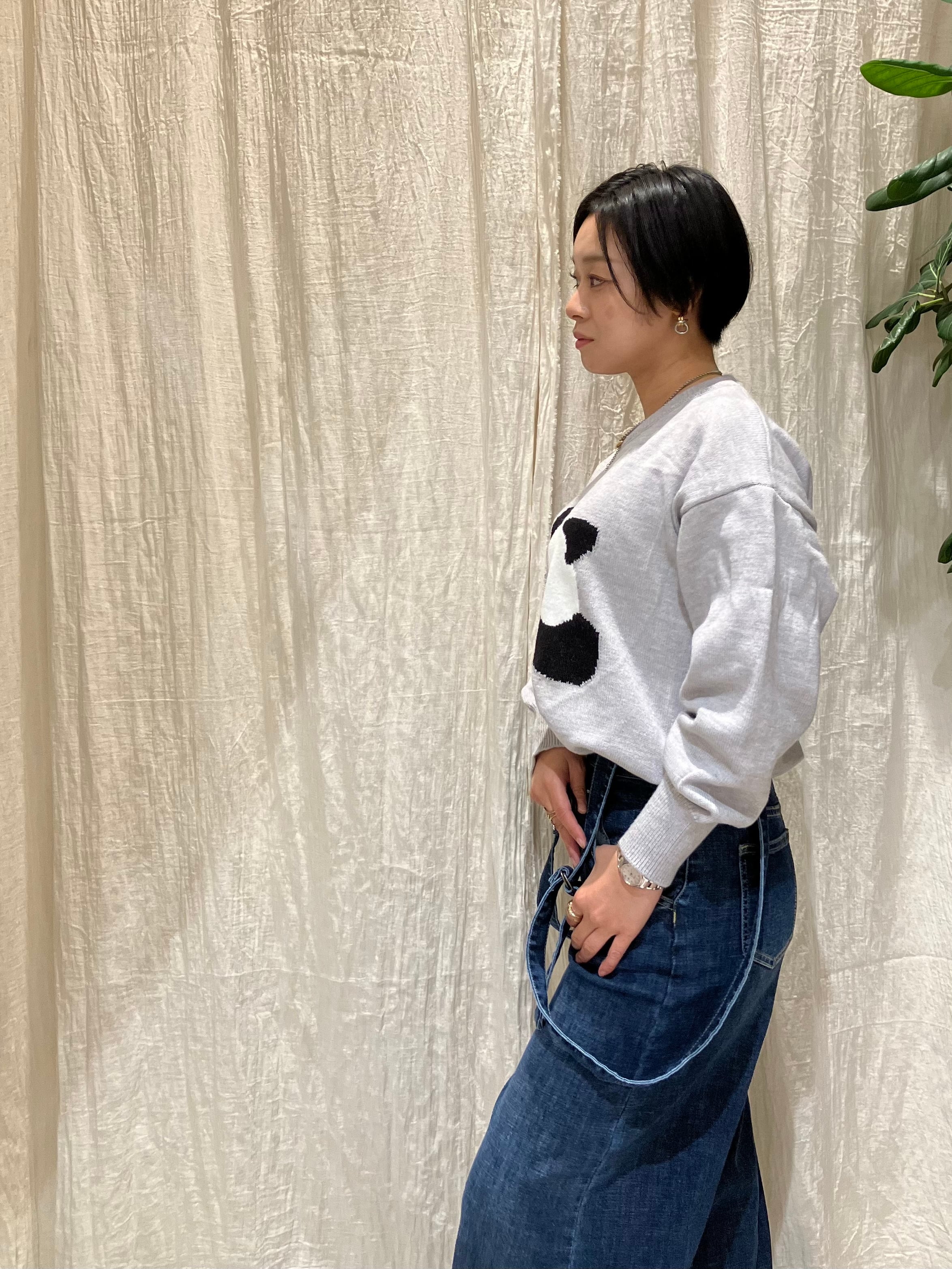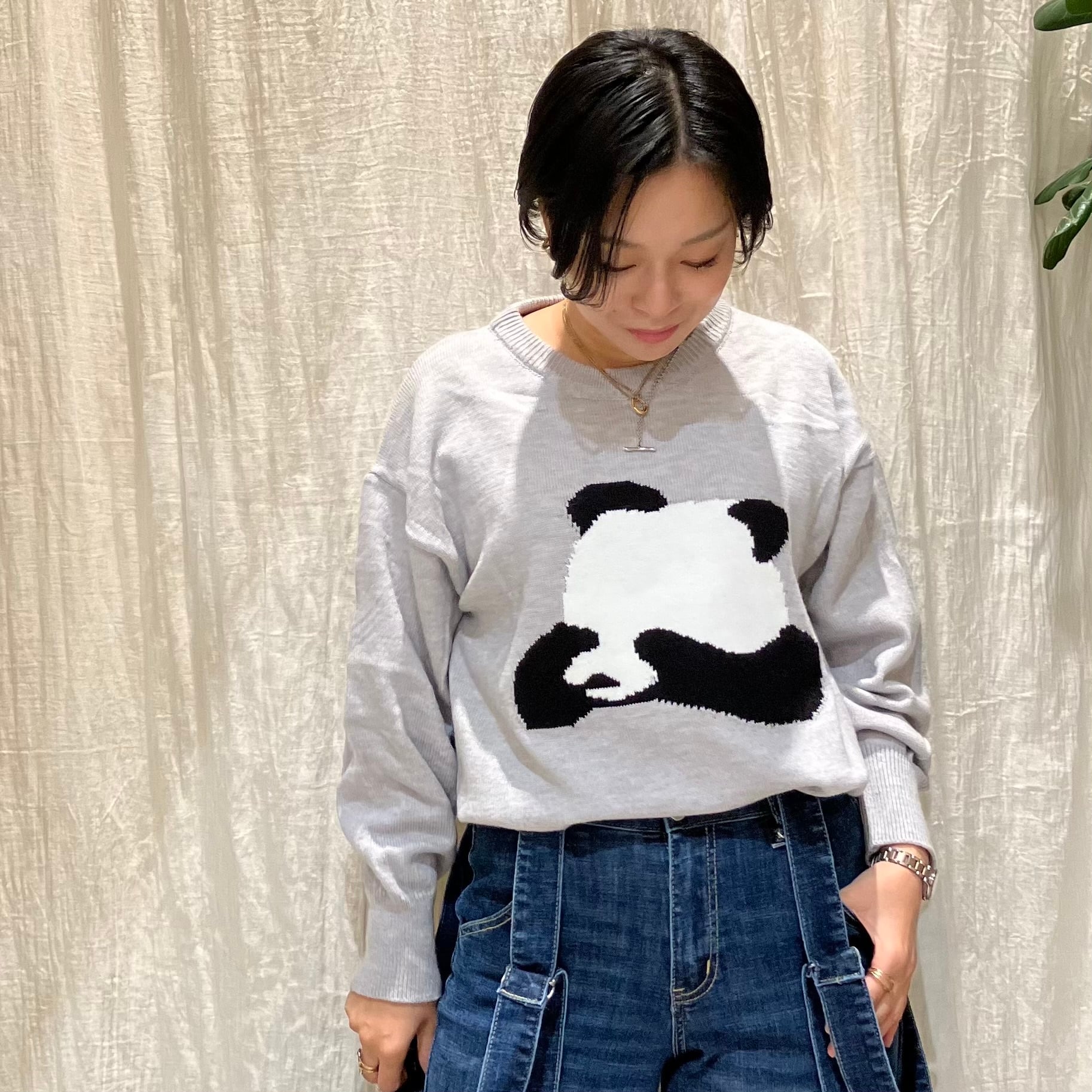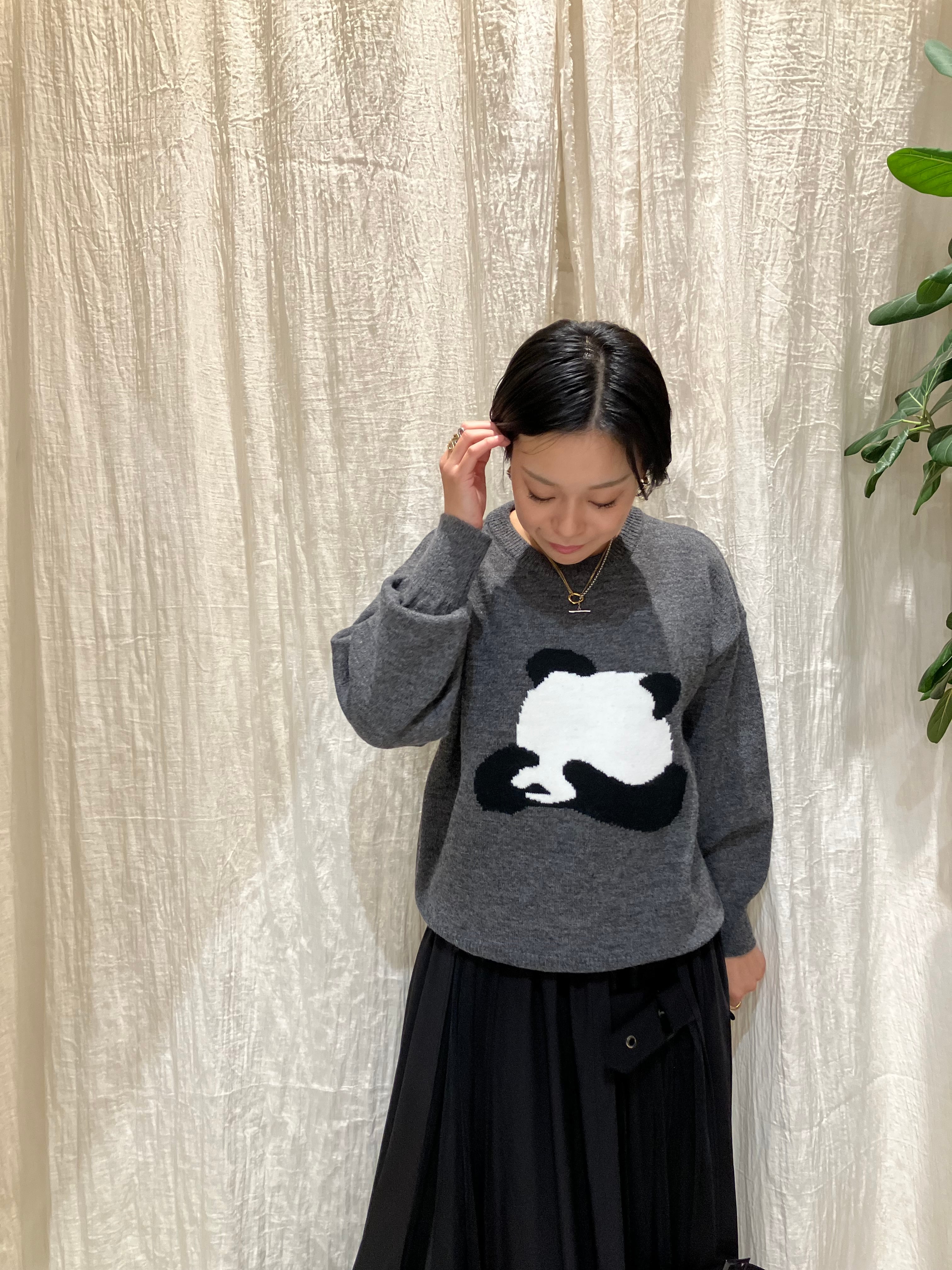 遊び心あふれるパンダモチーフが目を引くラウンドネックセーター。