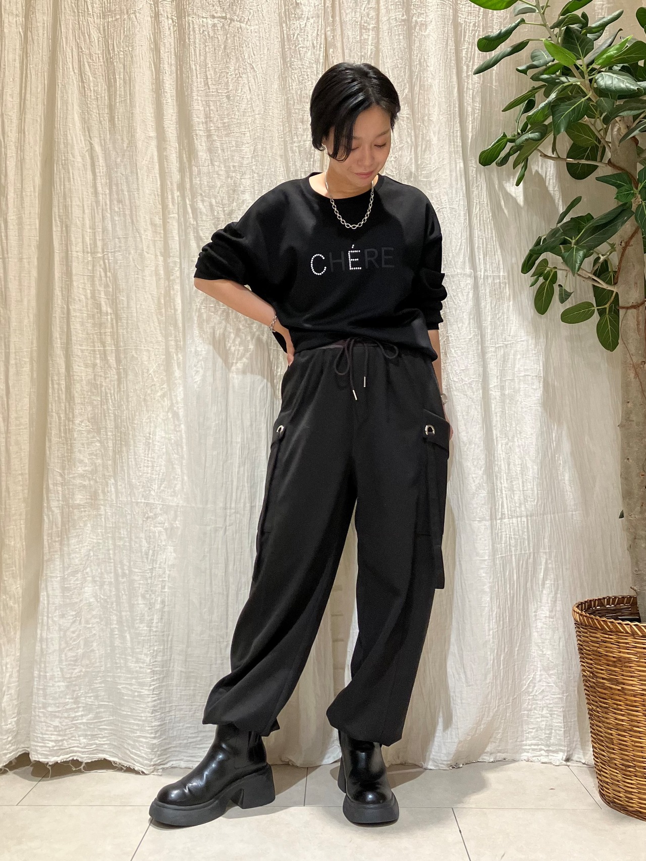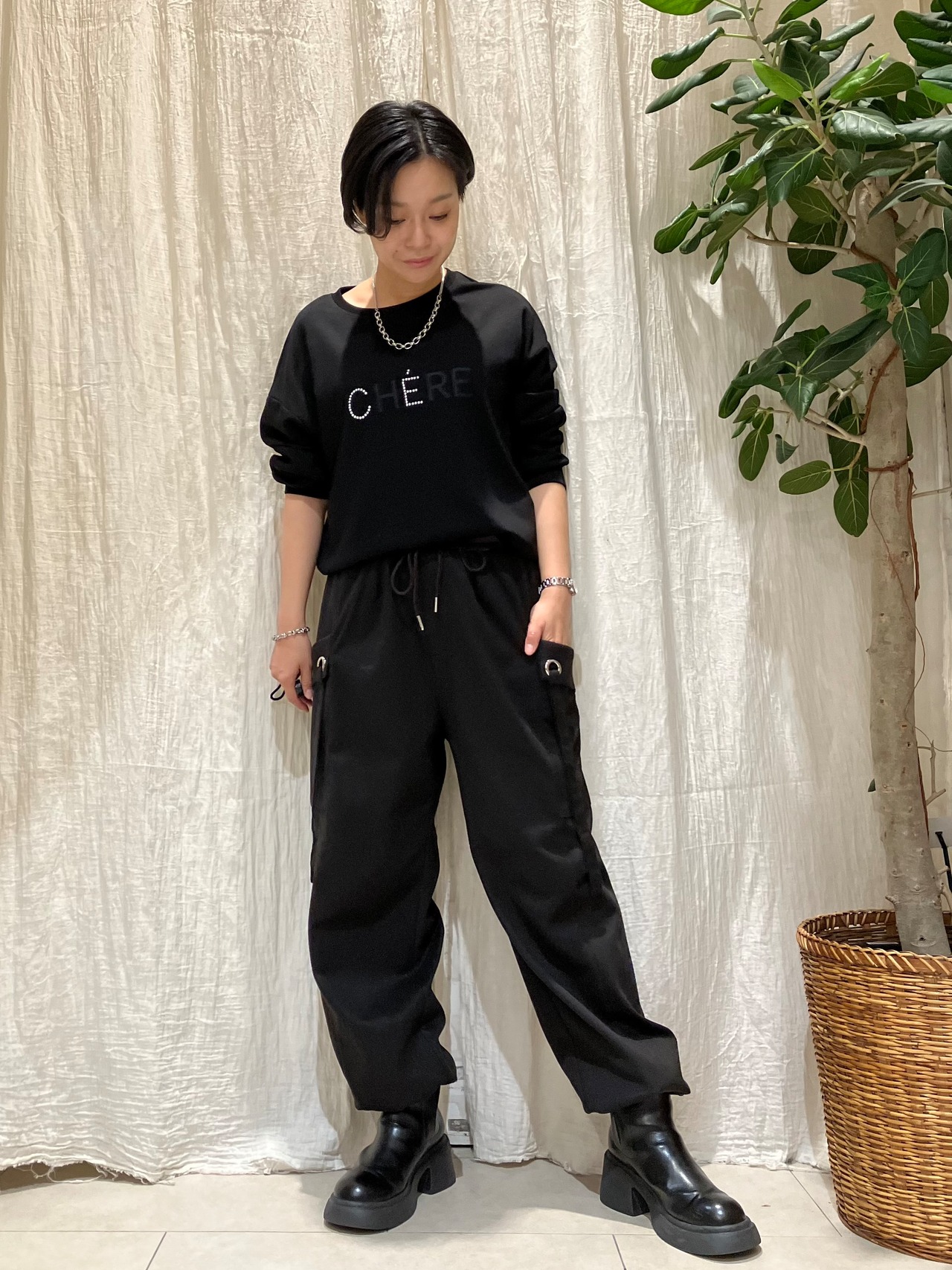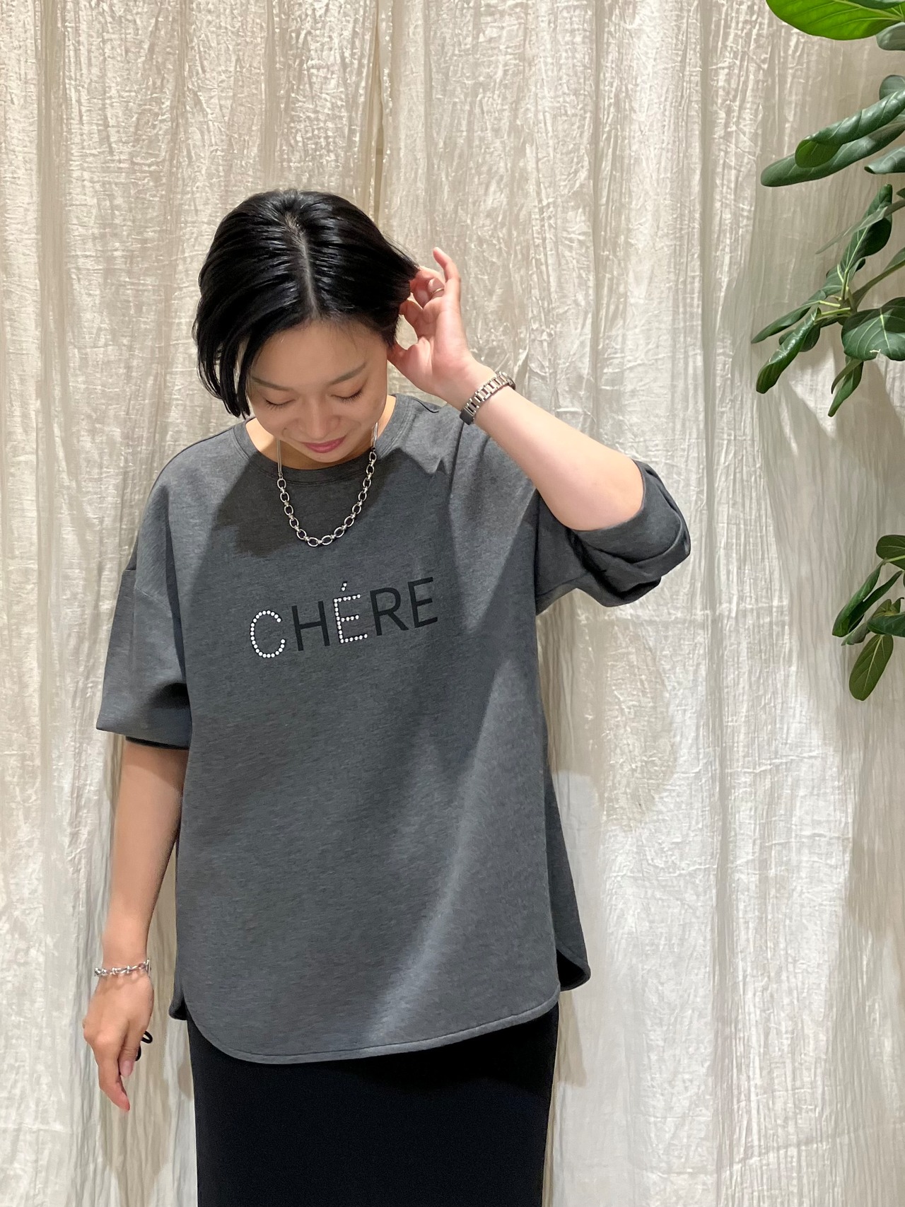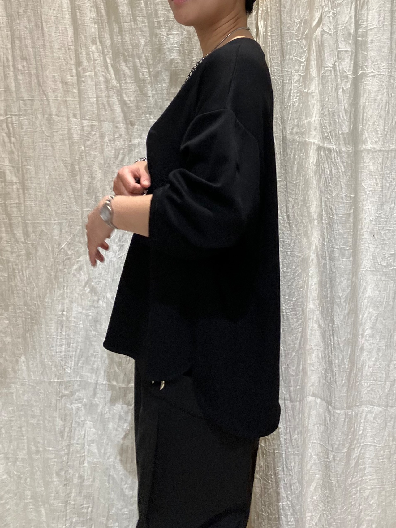 スタッズロゴがポイントのプルオーバー。程よいストレッチ性のあるポリエステル×レーヨン素材で、快適な着心地。前後差のある着丈で、抜け感のあるシルエットに仕上げています。