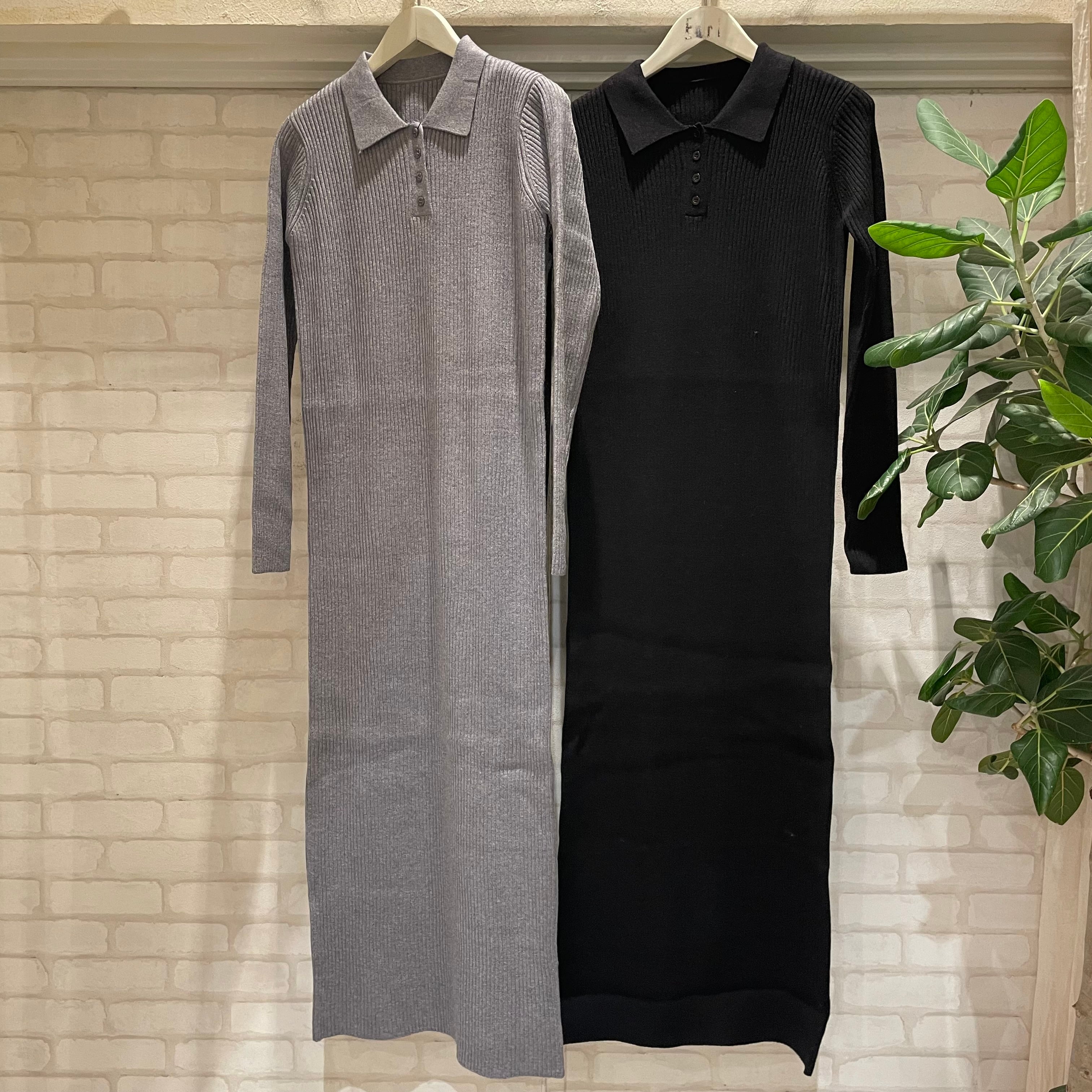 ロング丈のシルエットが上品な印象を与える、襟付きのニットワンピースです。
