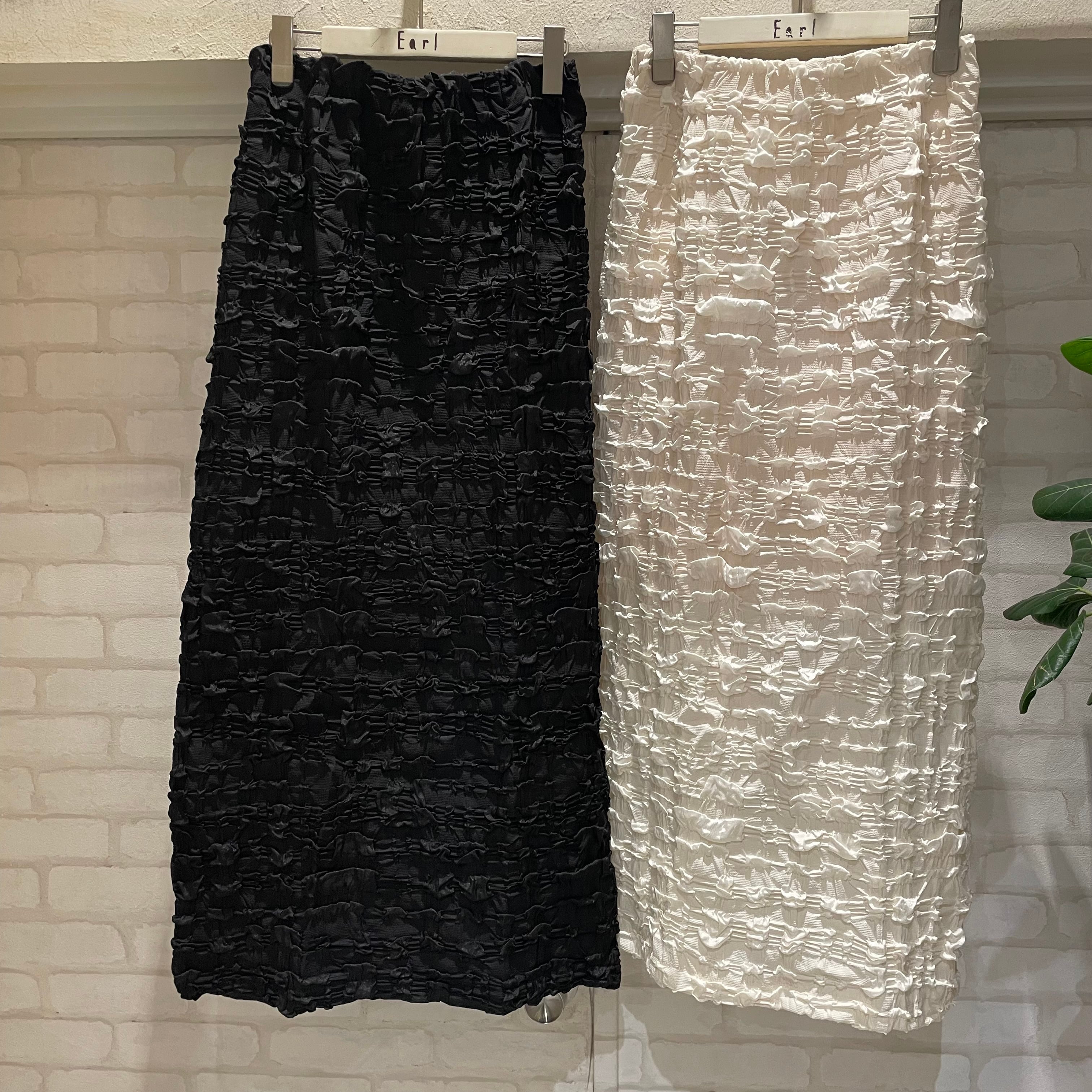 ポコポコ感を出すことでシンプルすぎず、タイトスカートにすることでガーリー過ぎずなカジュアルにもフェミニンにもなるデザインスカートです。ウエストはゴムになっているので履きやすく、着心地も抜群です。春にはシアー素材のカットソー、夏にはTシャツと、秋冬はニットなどと合わせたりできるので1年中使っていただけます。