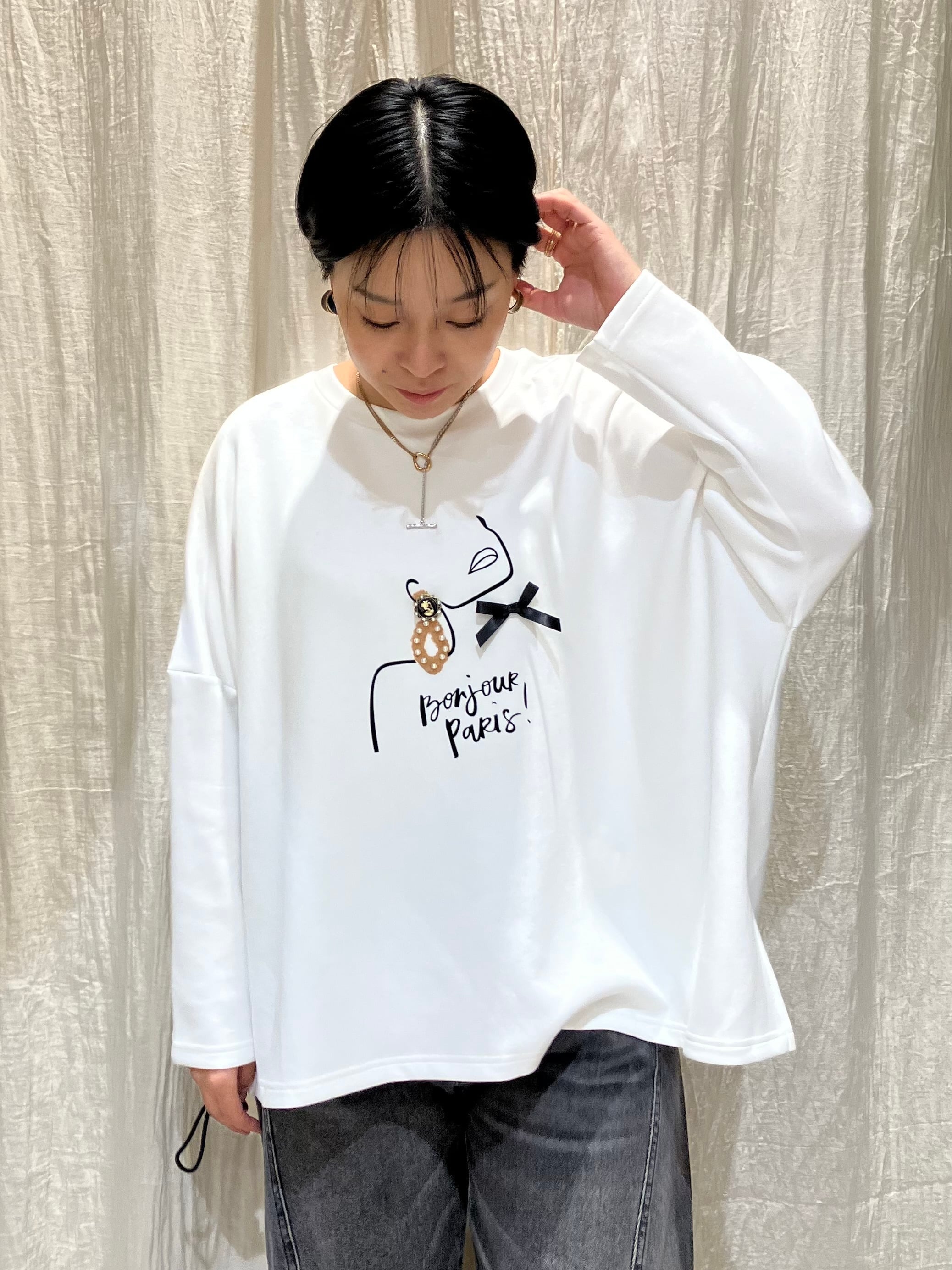 "Bonjour Paris"のテキストとアクセサリー風刺繍がアクセントになり、シンプルながらも女性らしい遊び心を感じる一枚。
