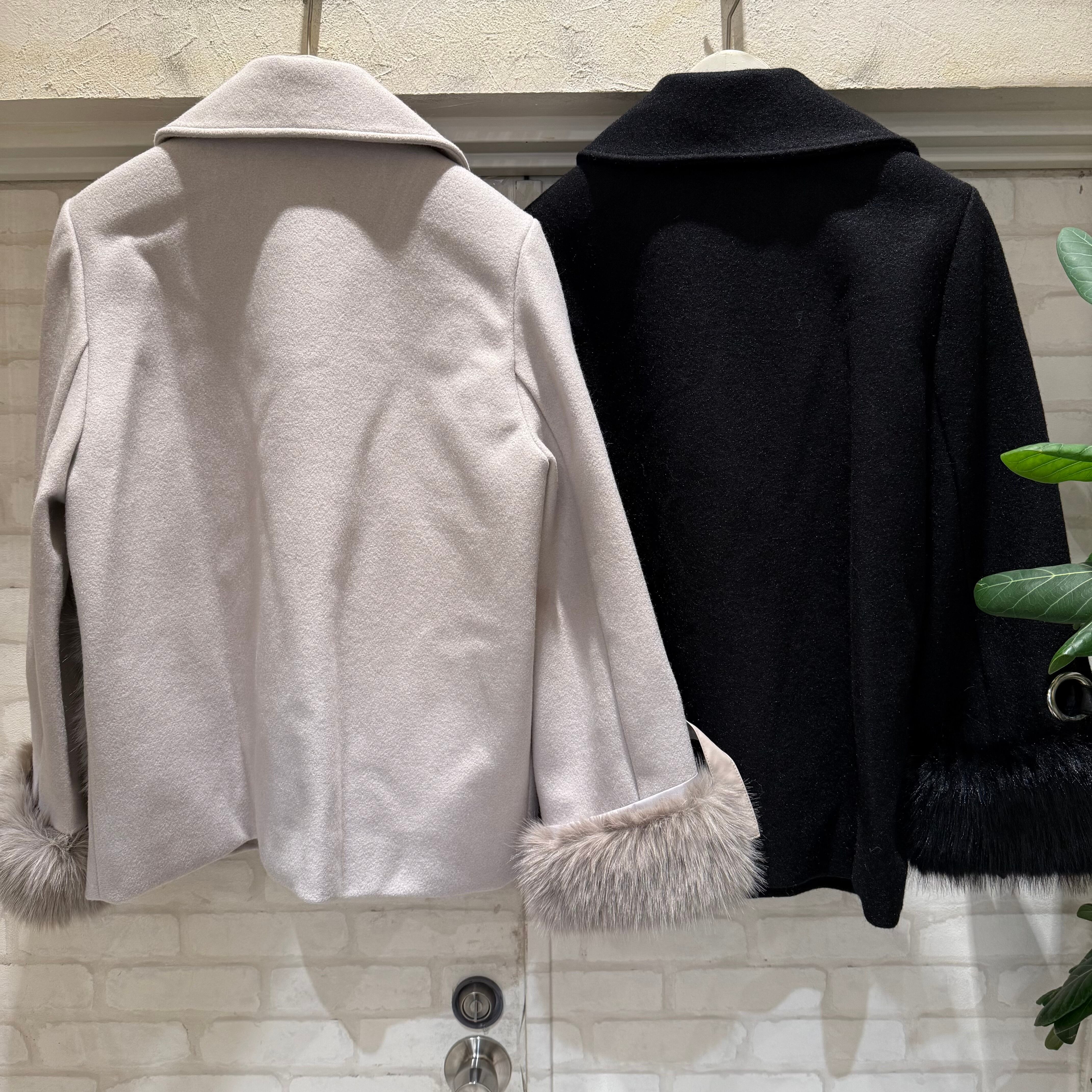 ふわふわのポケットファーと可愛らしい袖口リボンがポイントのPコートです。