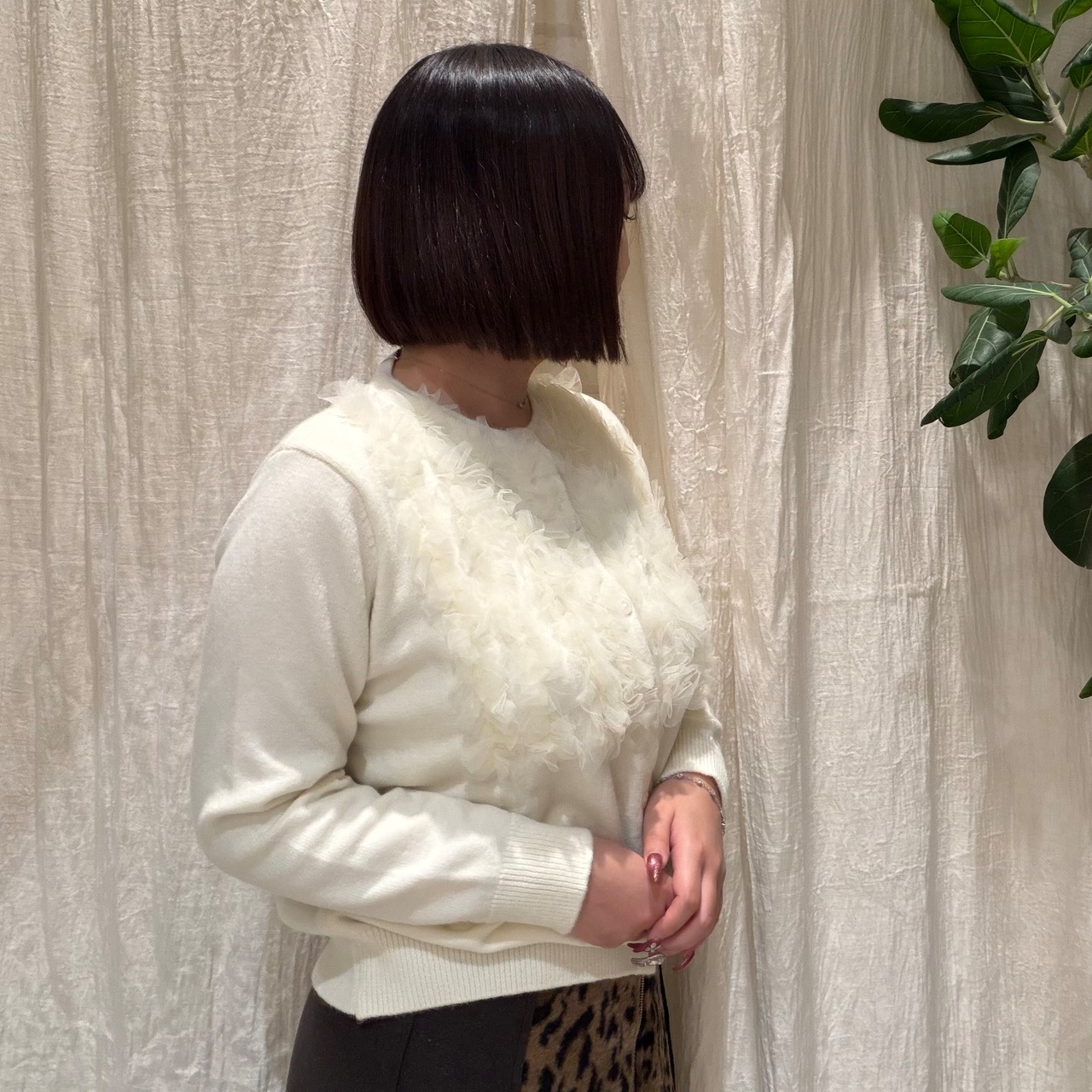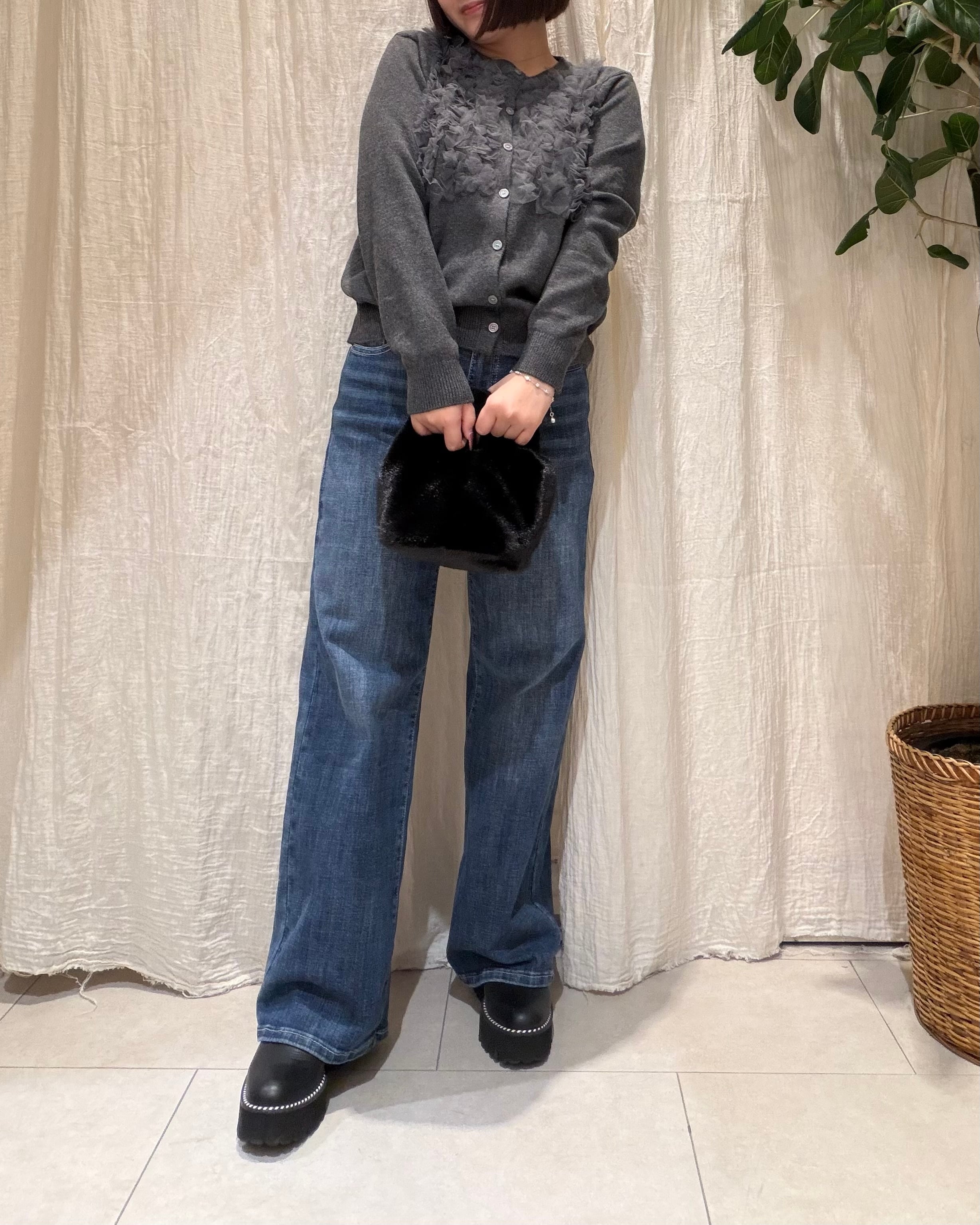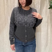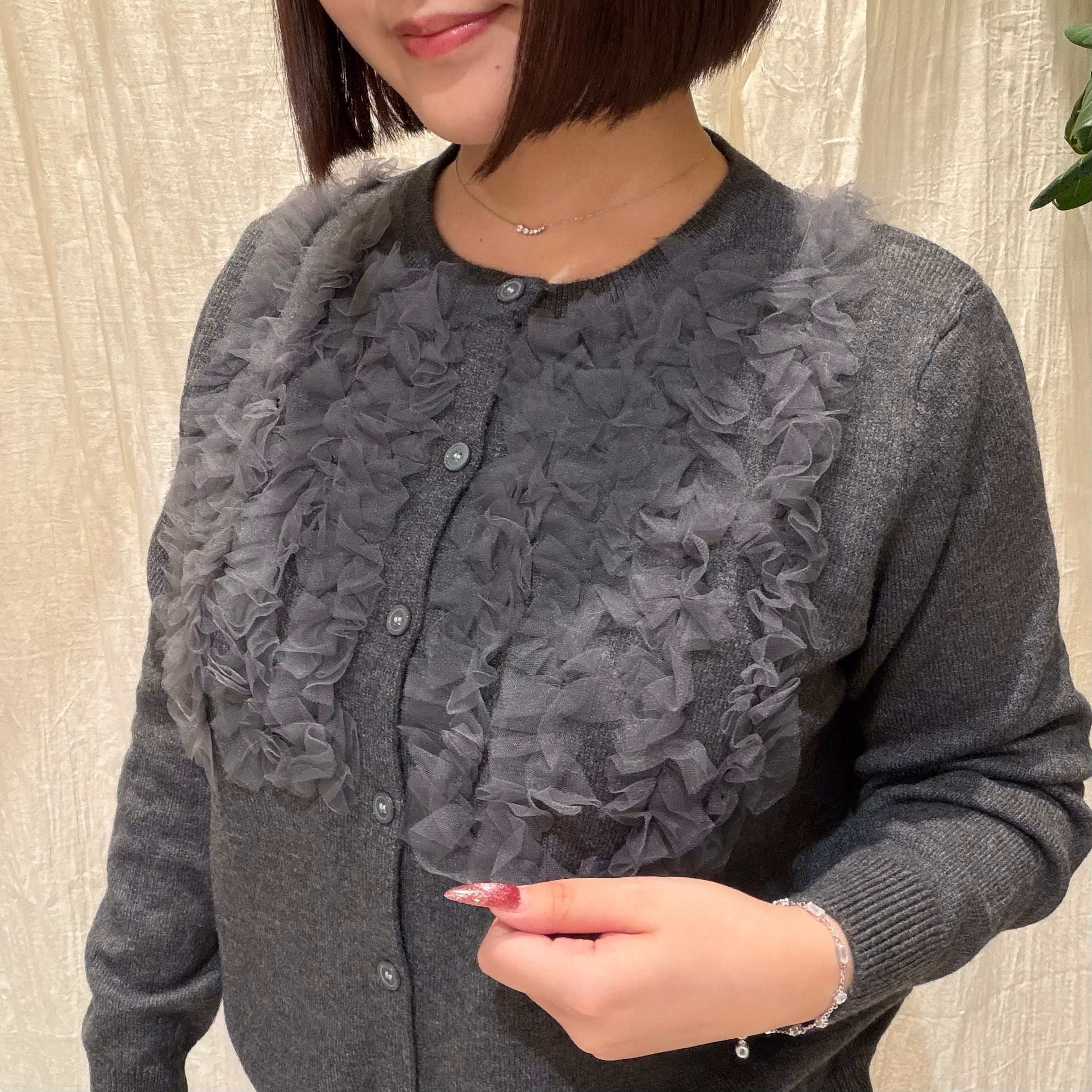 ふんわりと立体感のあるフリルをフロントにあしらった、華やかなデザインカーディガンです。