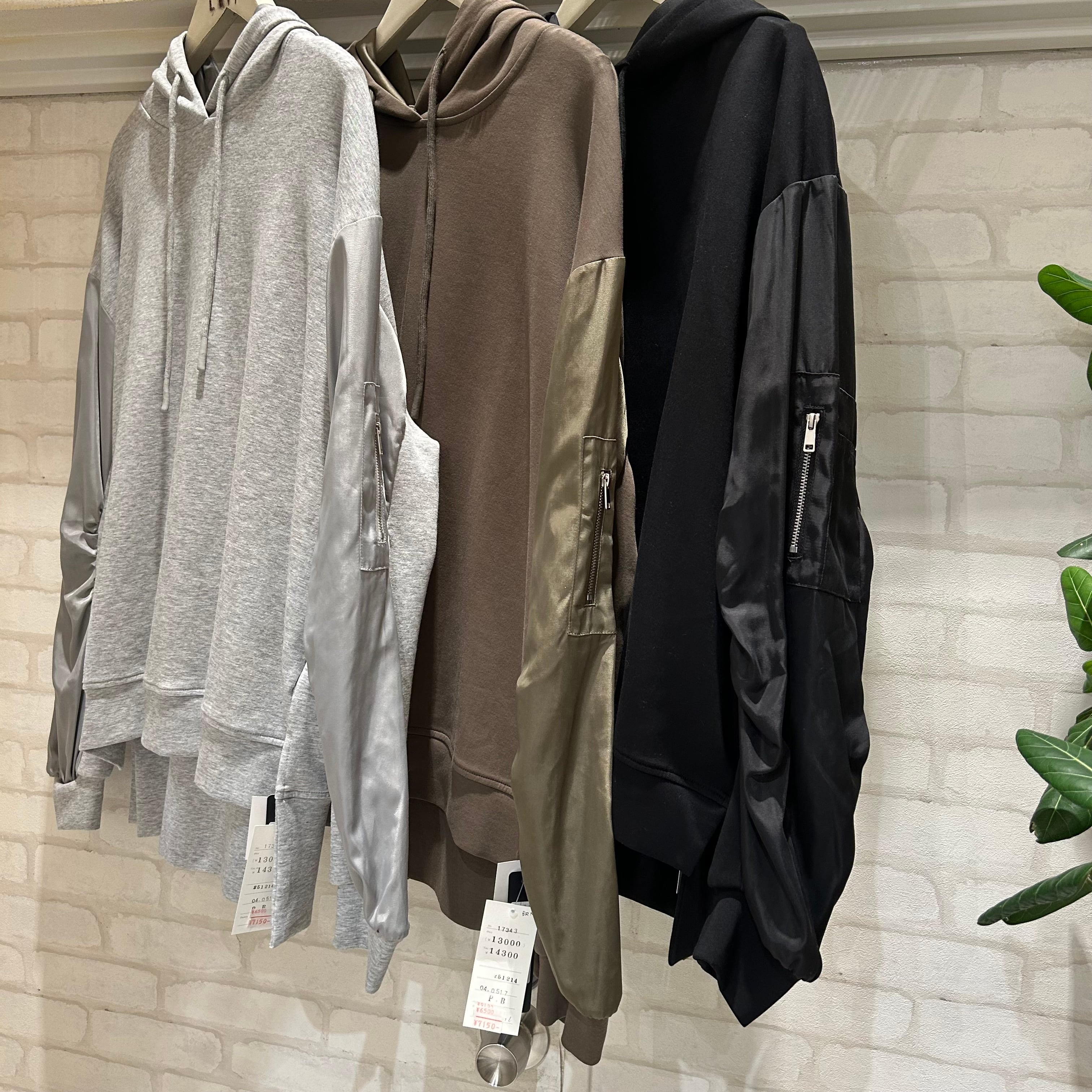 袖部分のMA-1ライクなナイロン素材が程よいモード感をプラスしてくれます。ゆるっとシルエットでカジュアルながらも抜け感のあるスタイリングが仕上がります。