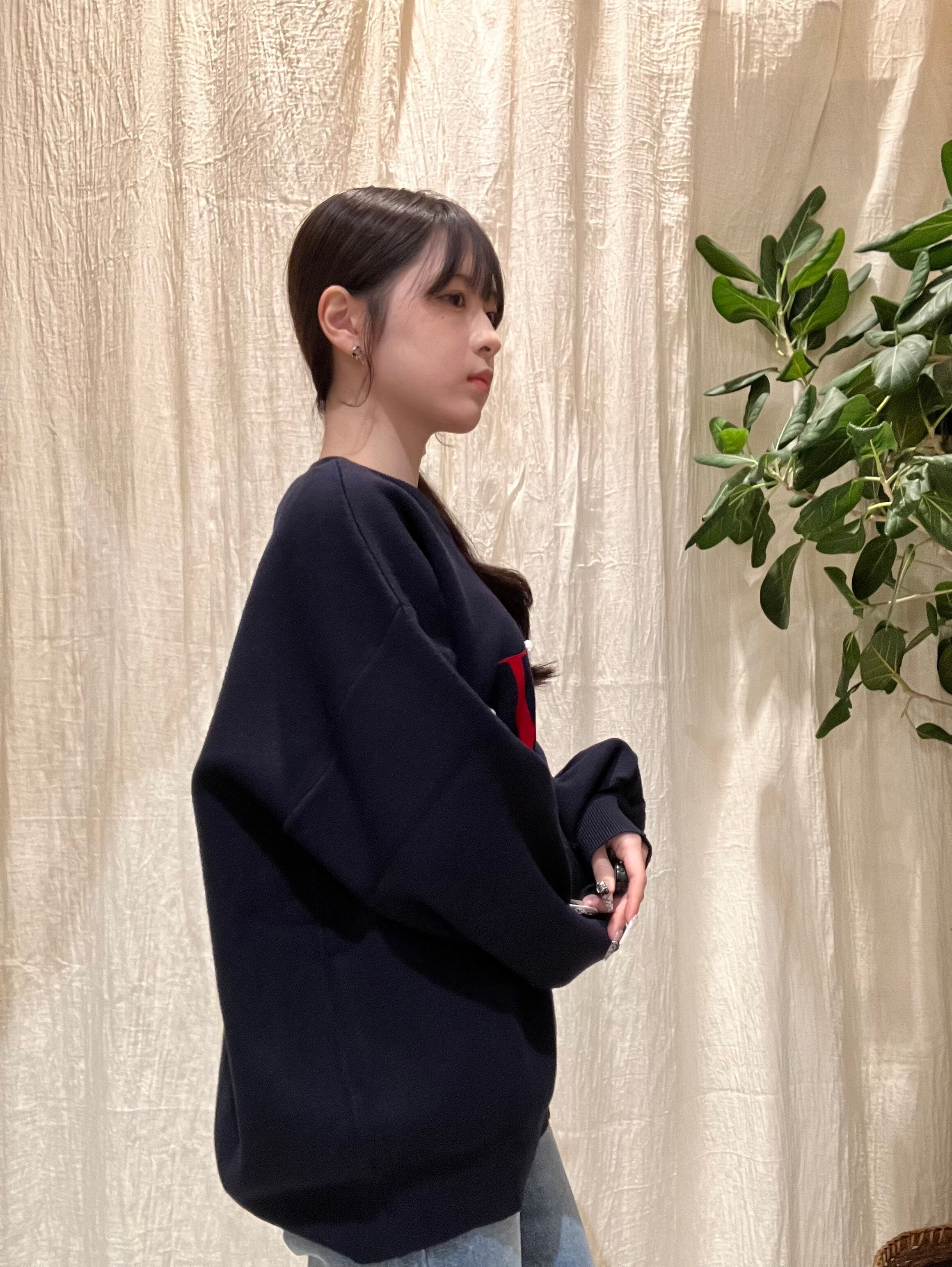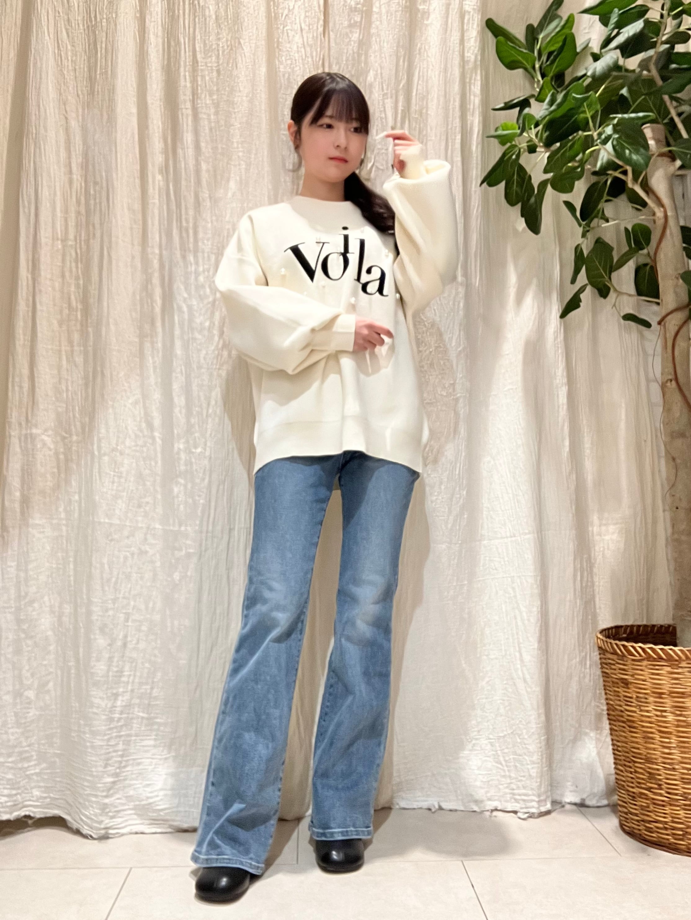 パールとフロッキーロゴのフェミニンカジュアルなニットトップス。