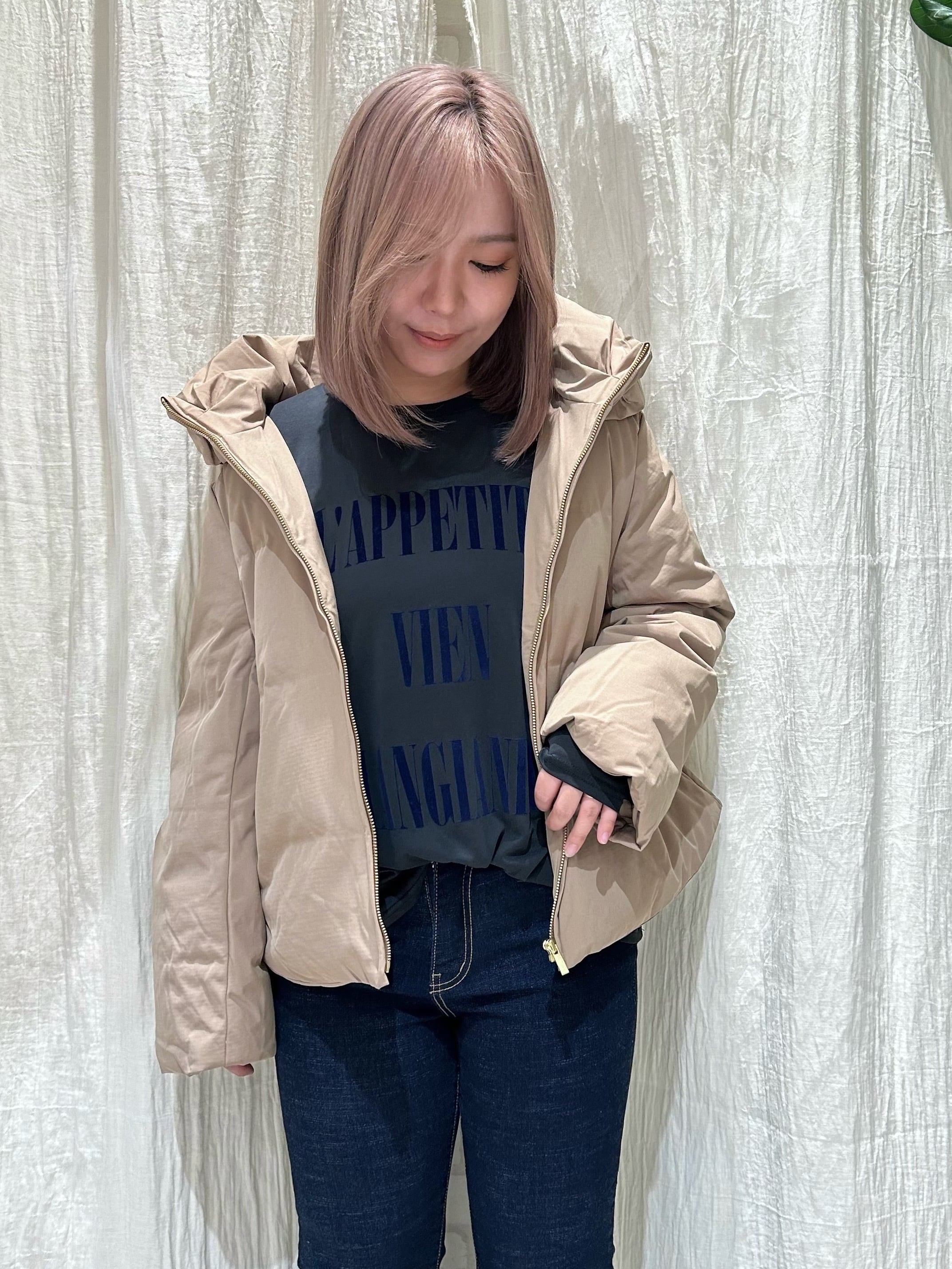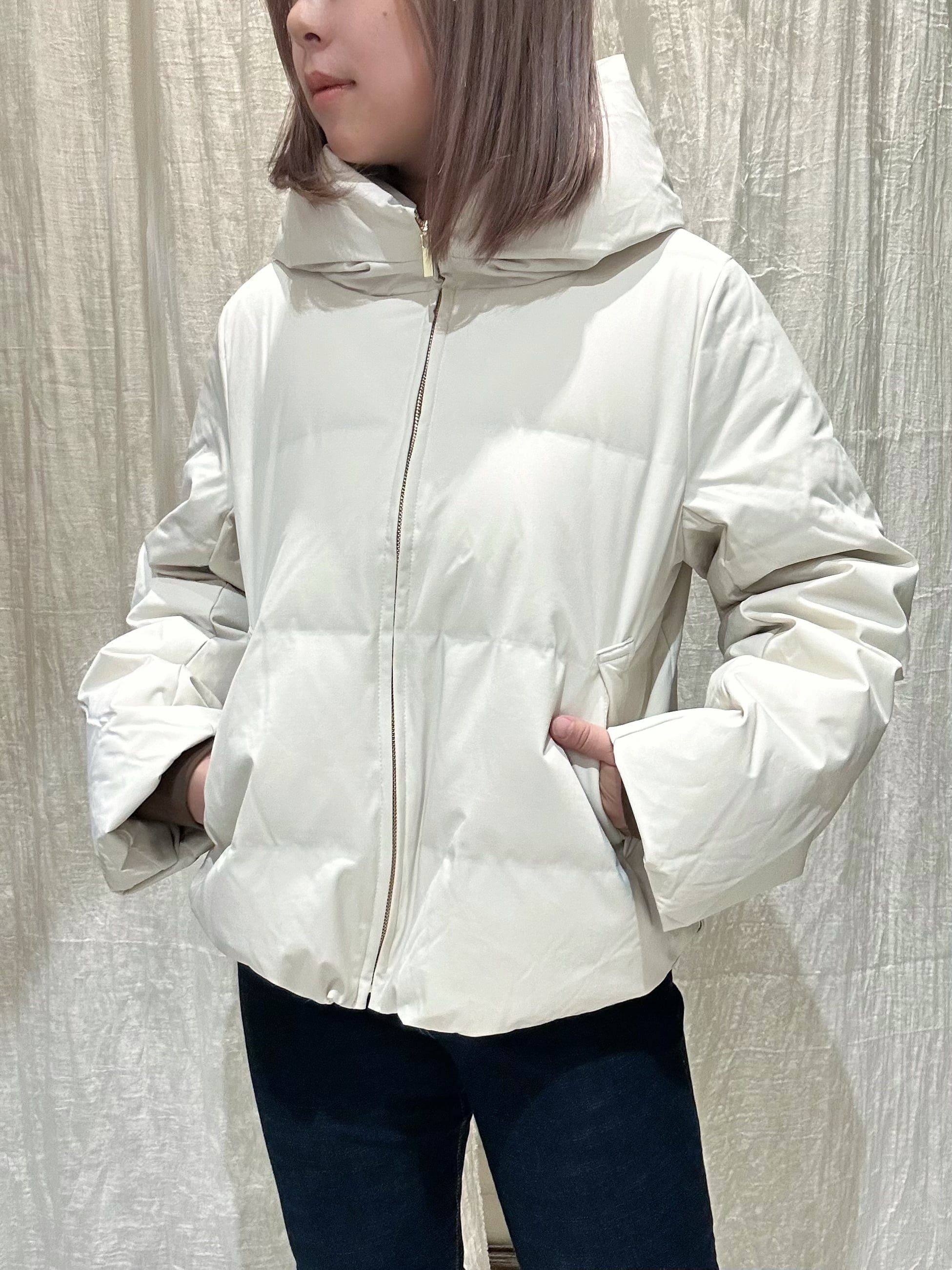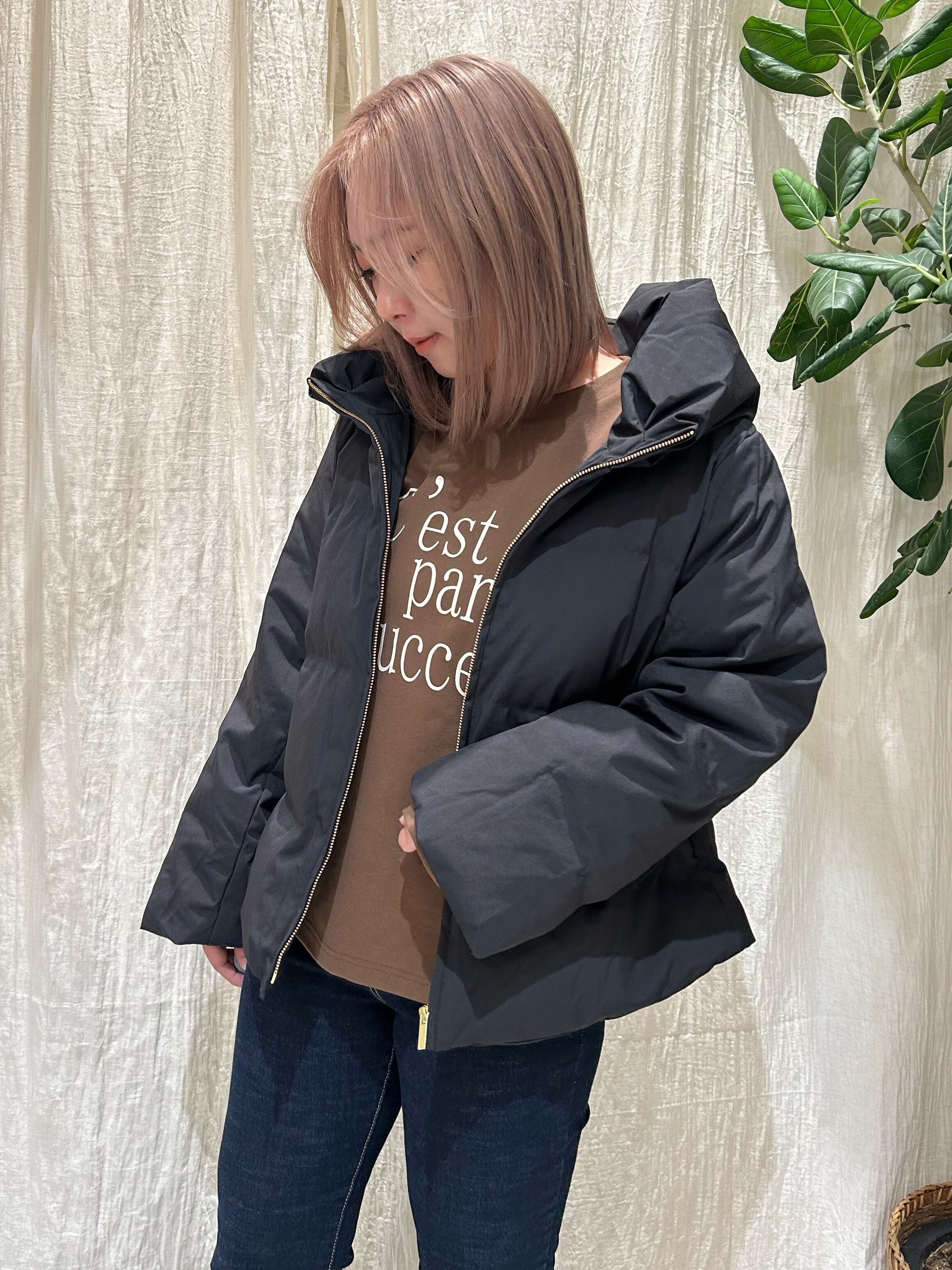 短丈で、シンプルなデザインなので、どんなインナーにも合うダウンです。