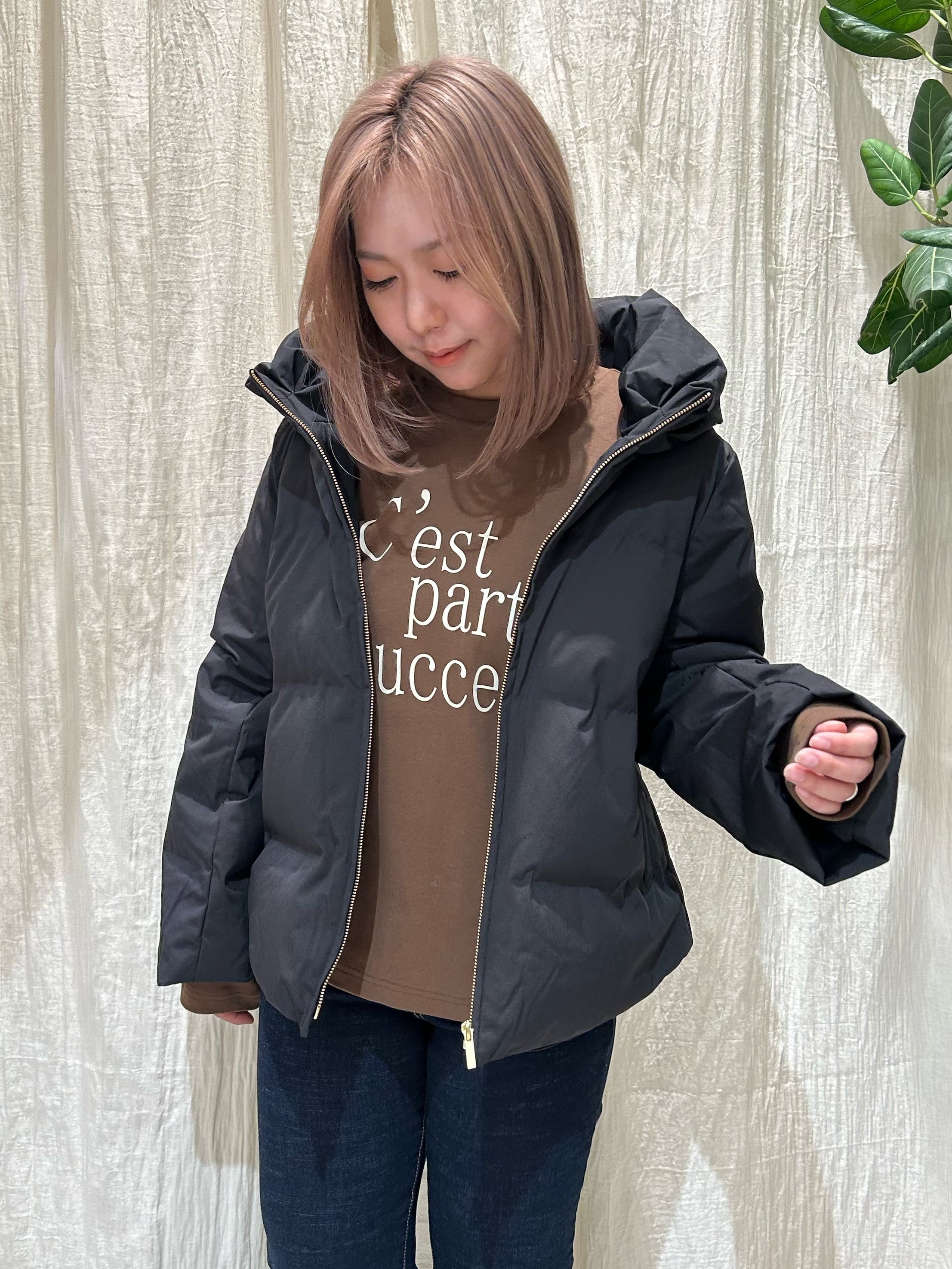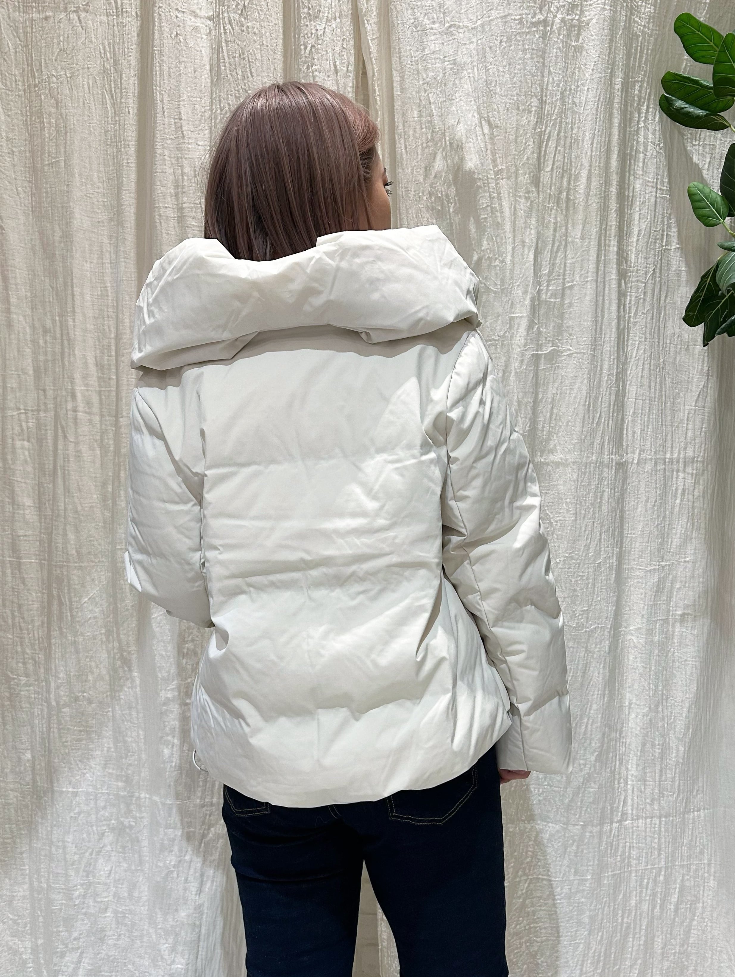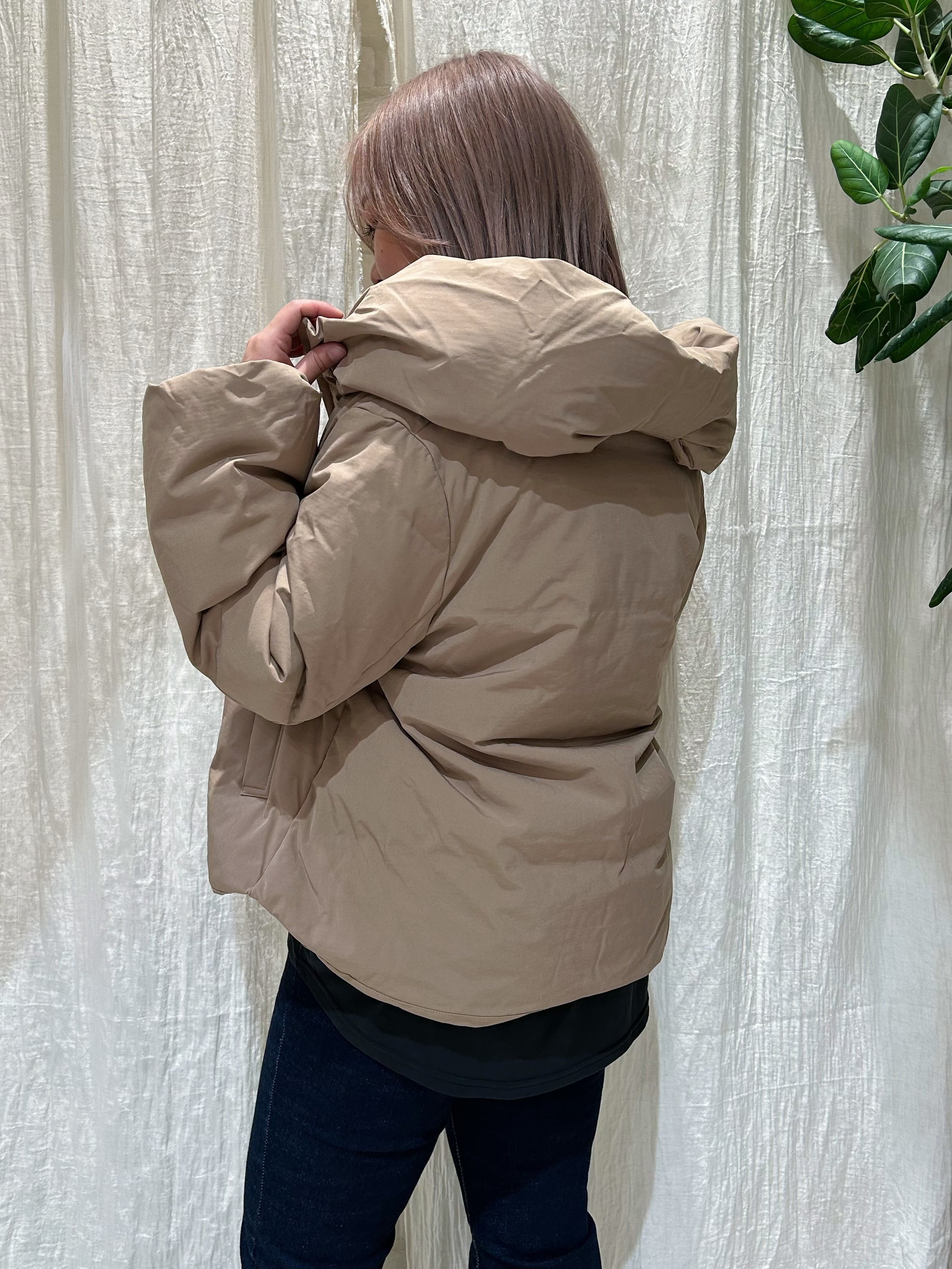 短丈で、シンプルなデザインなので、どんなインナーにも合うダウンです。