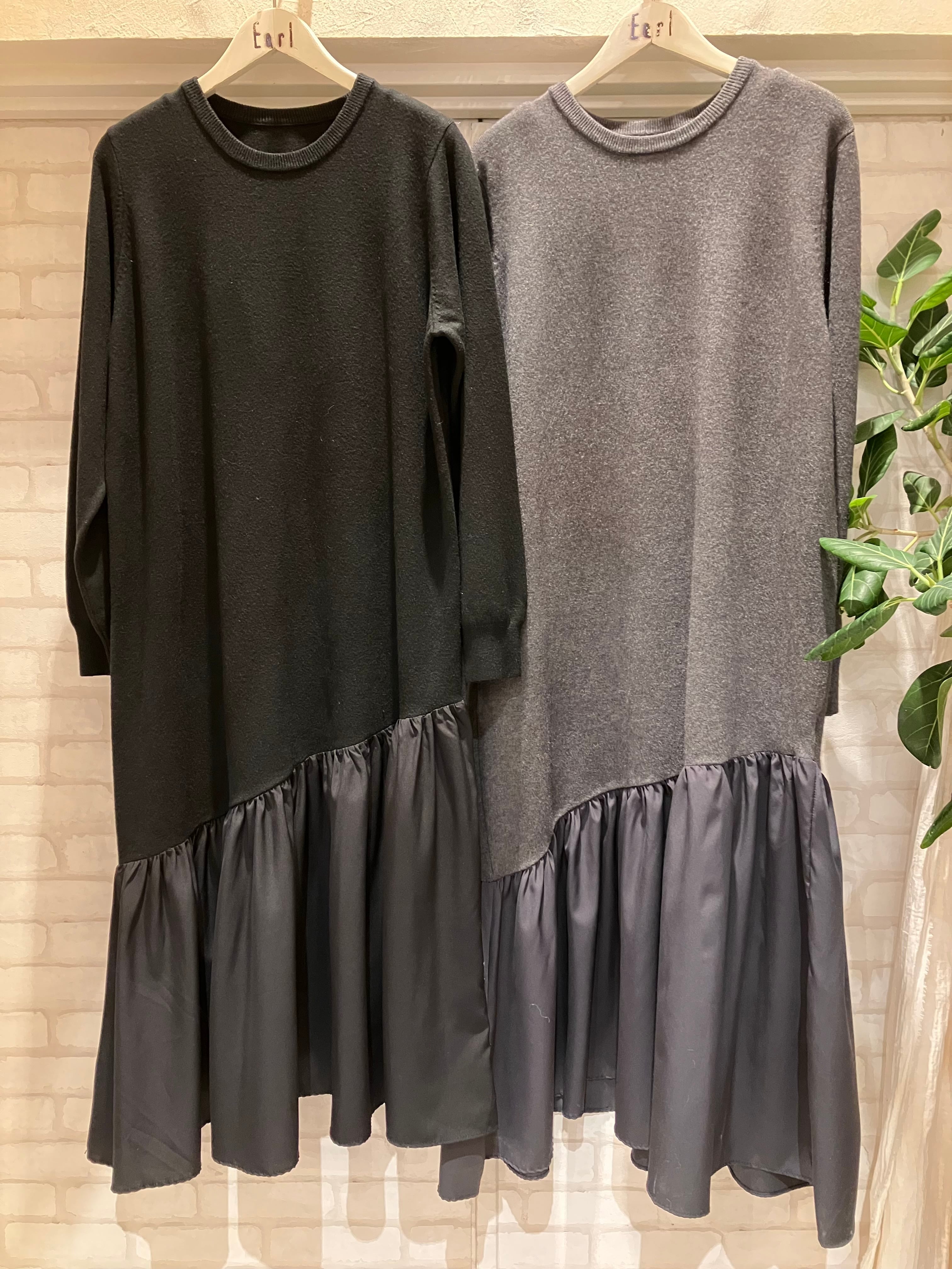 ニット素材のトップスと、軽やかな布帛スカートを組み合わせたドッキングワンピースです。