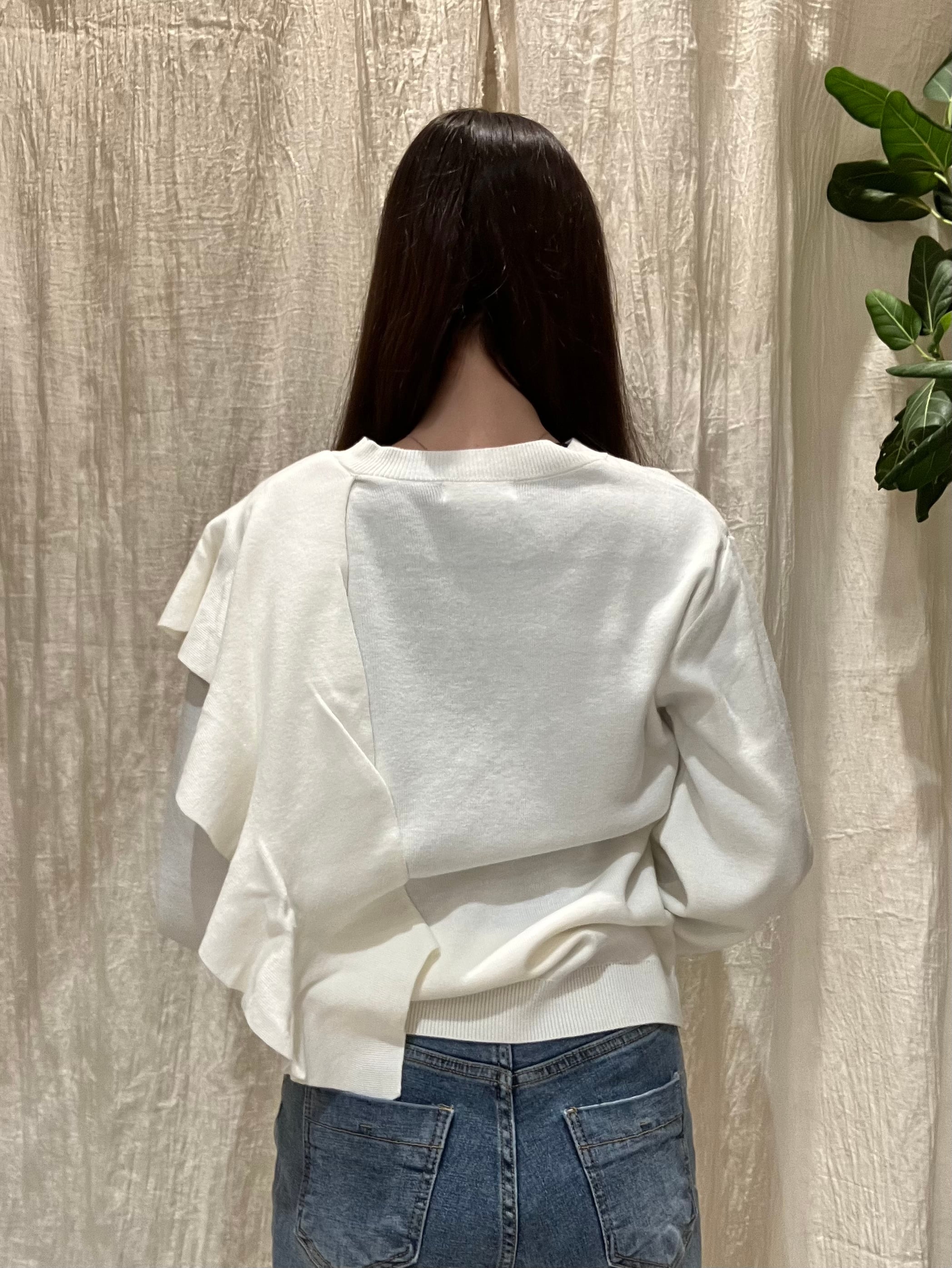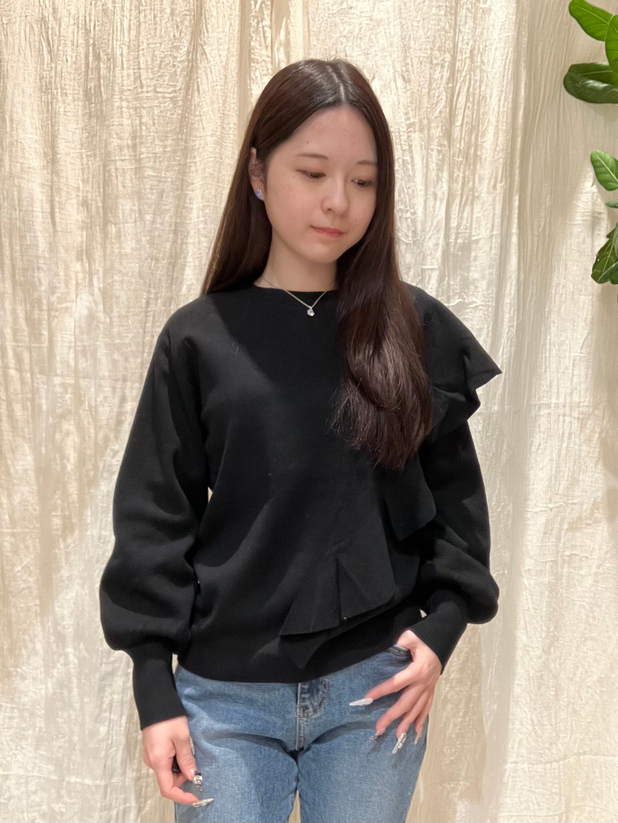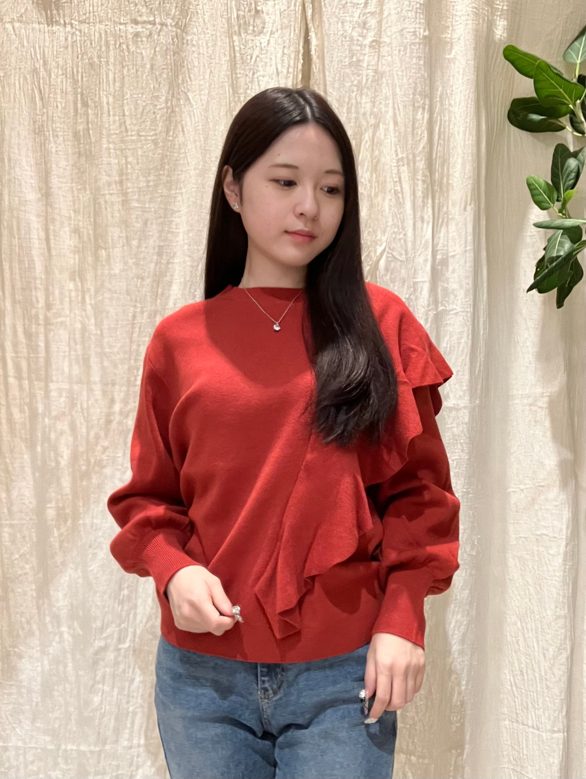 片側にフリルを施した、目を惹くアシンメトリーデザインニット。