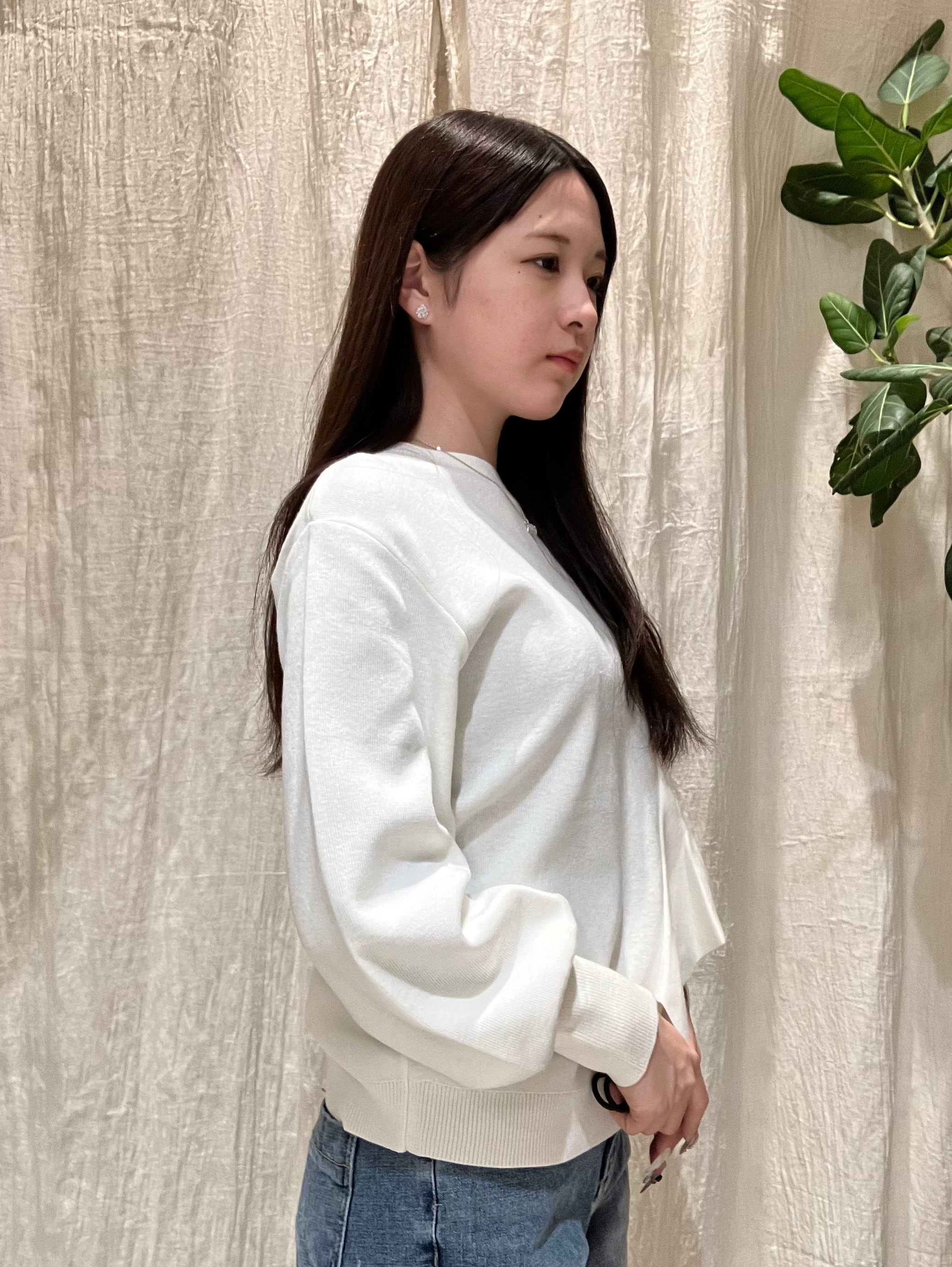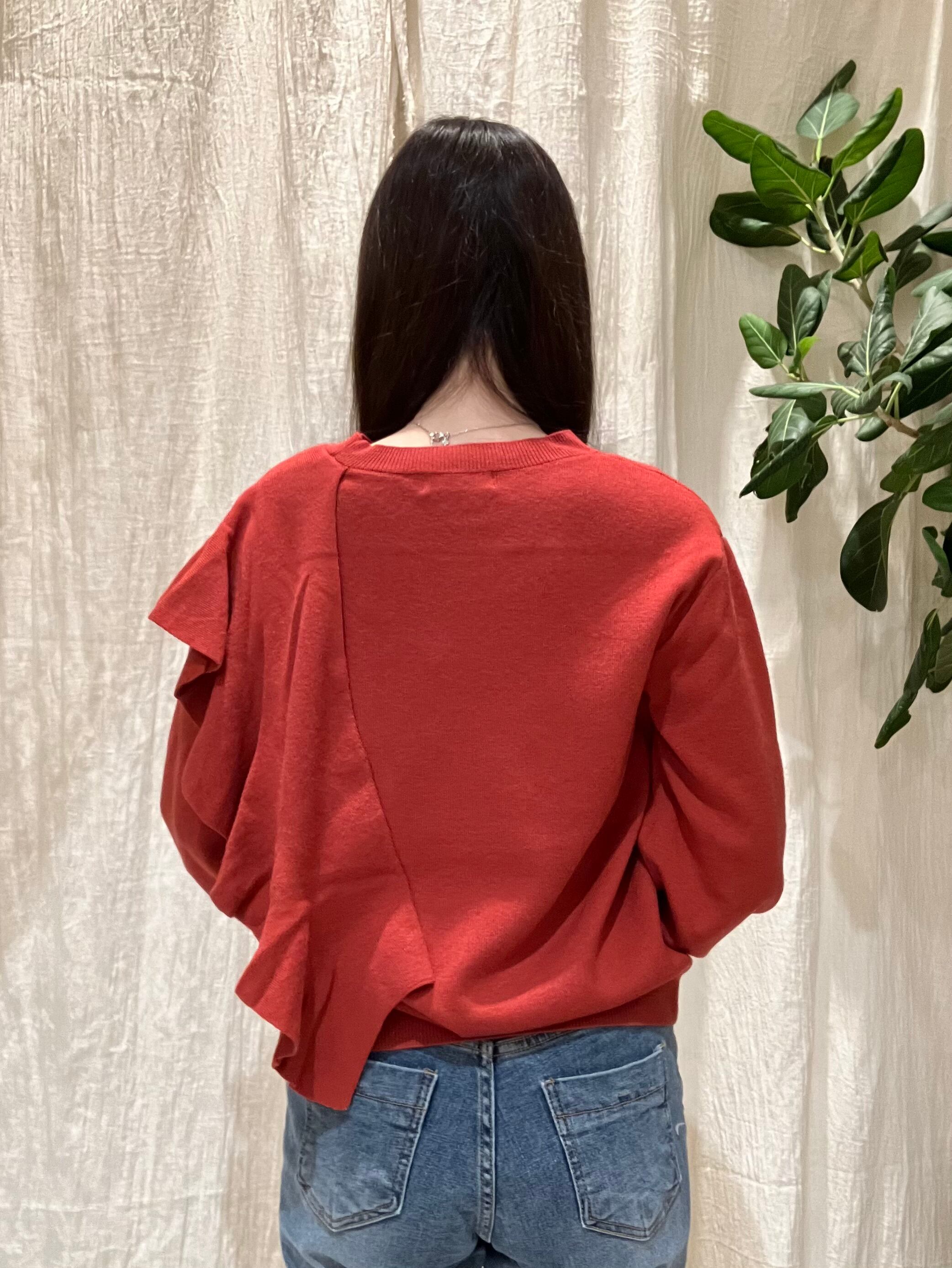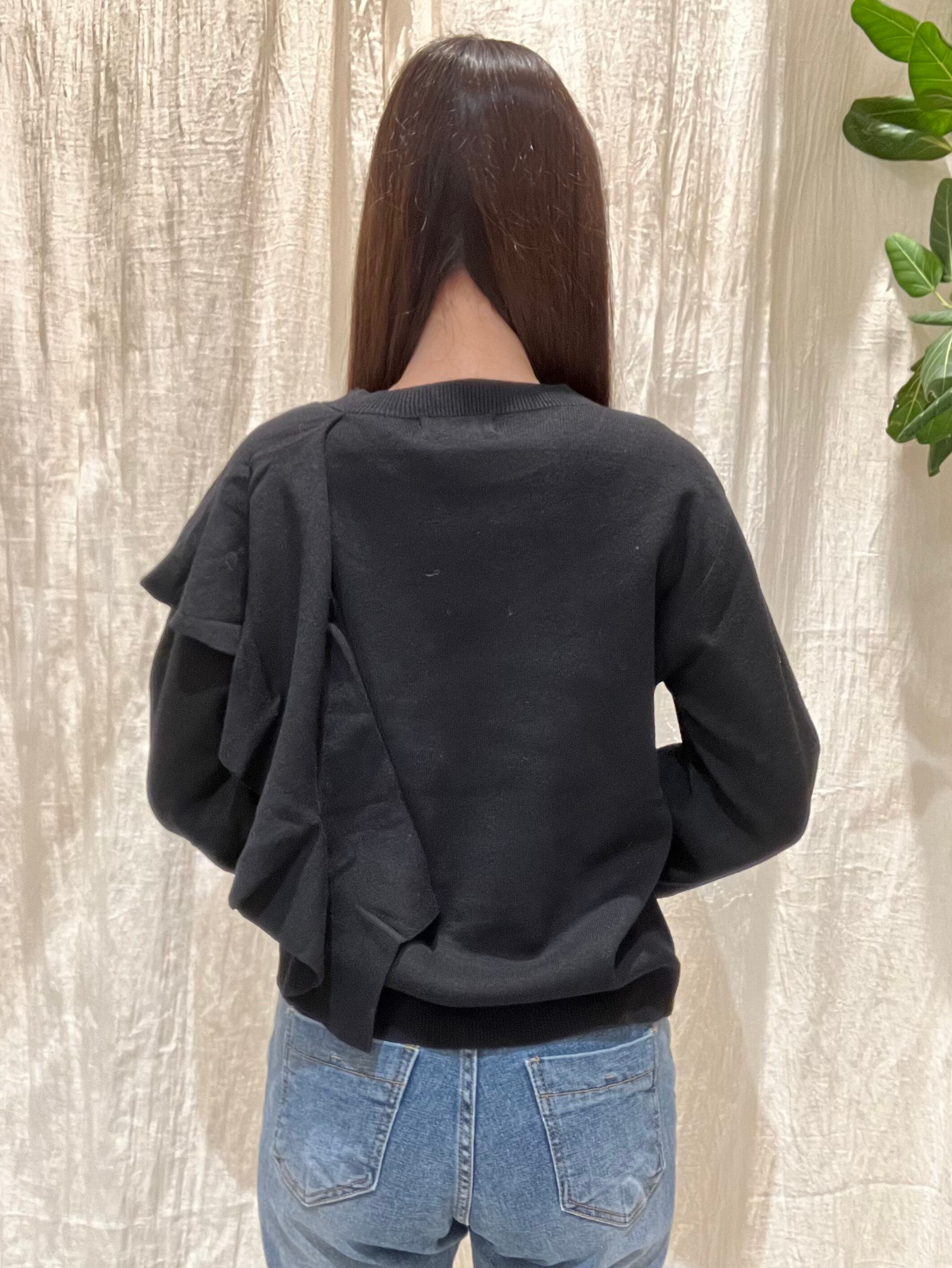 片側にフリルを施した、目を惹くアシンメトリーデザインニット。