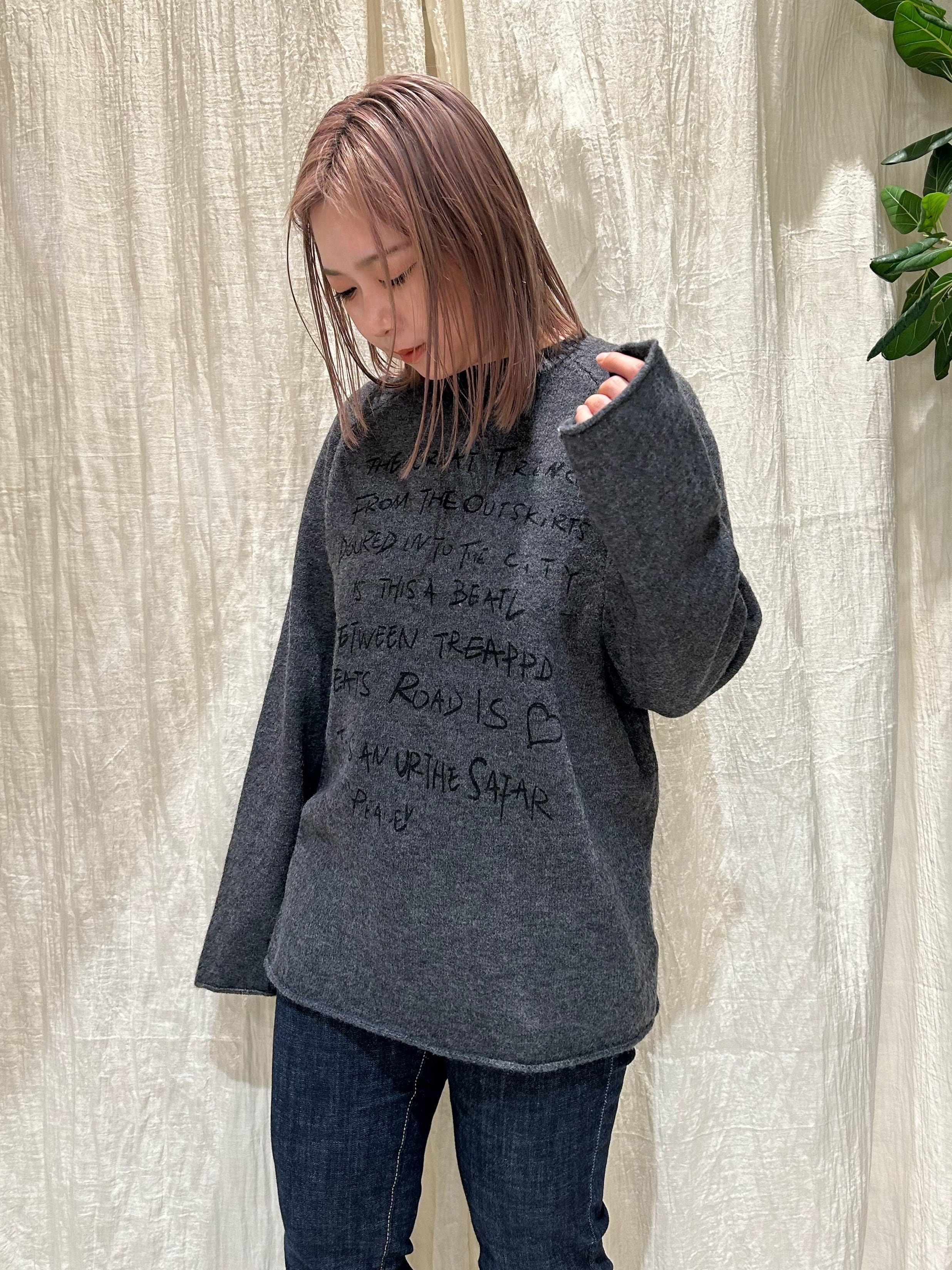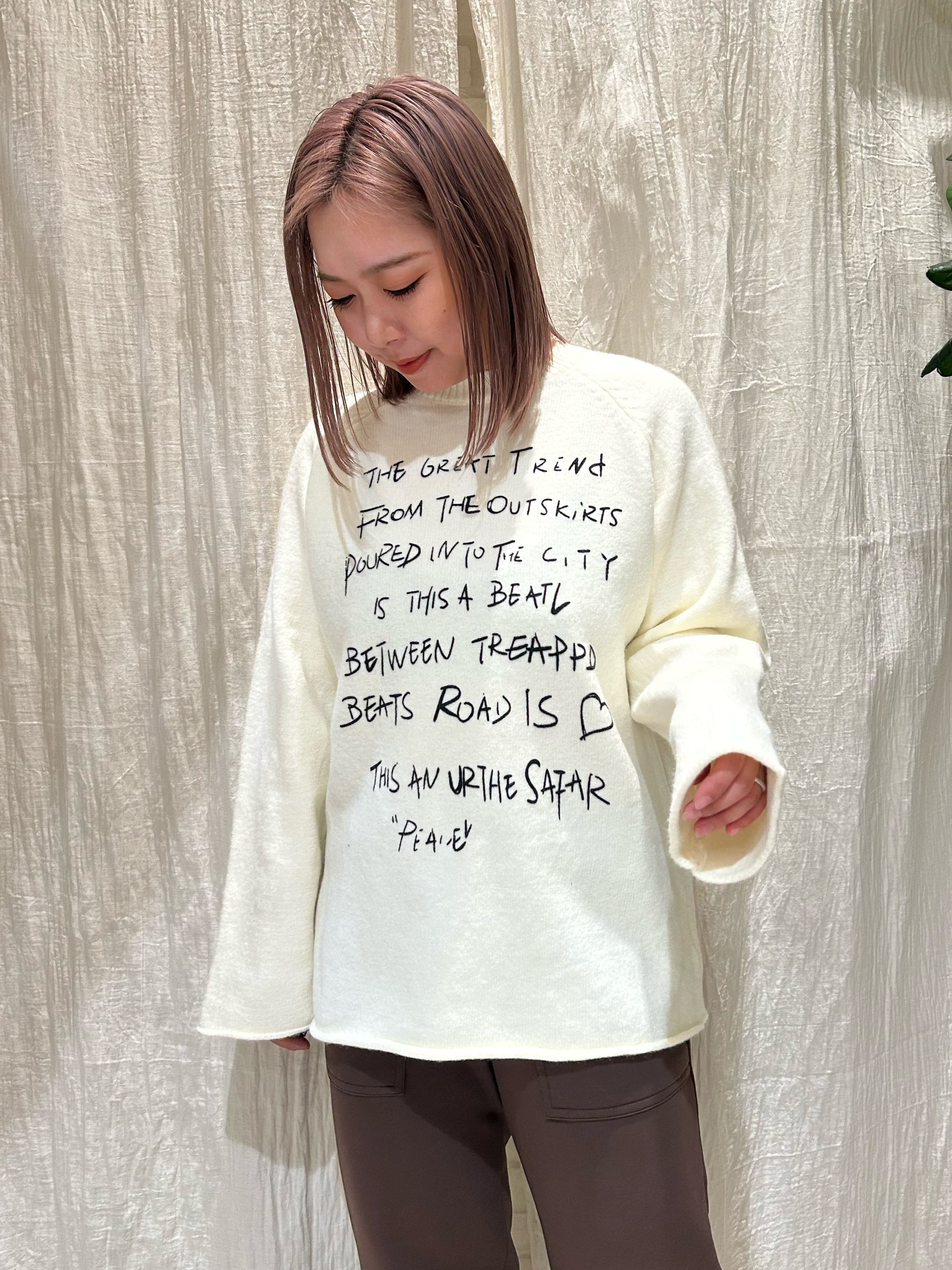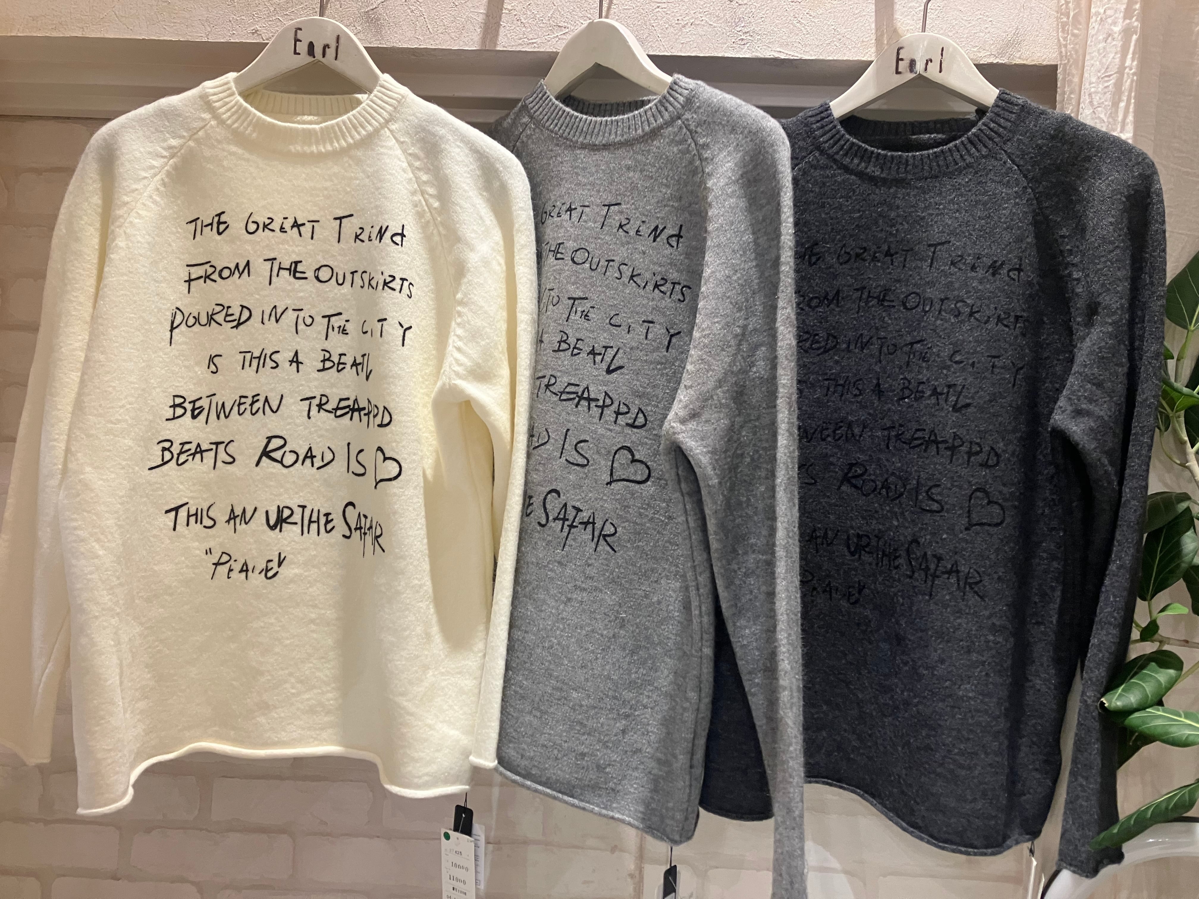 刺繍風の手書きレターロゴが目を引く、存在感のあるニットトップス。