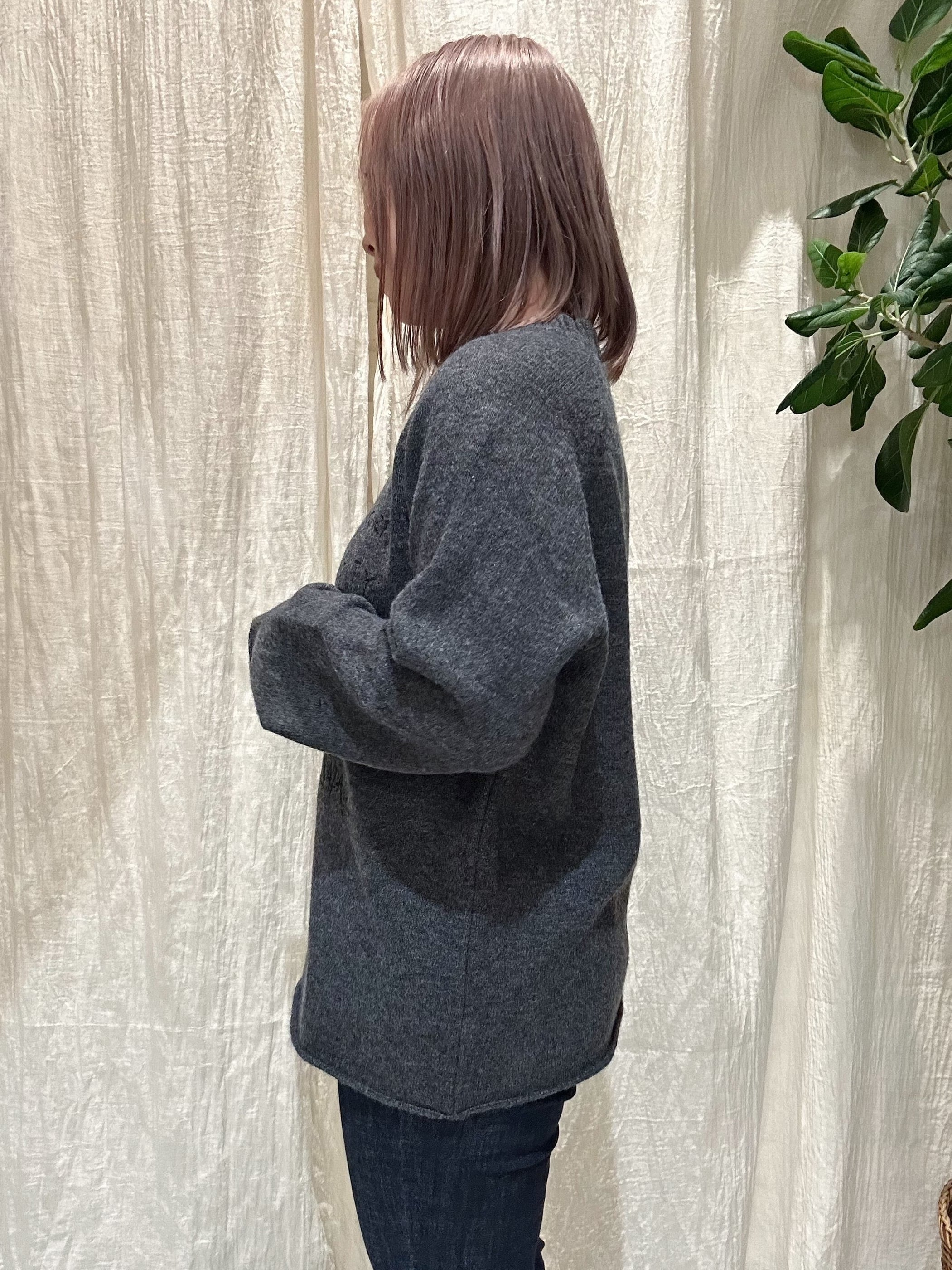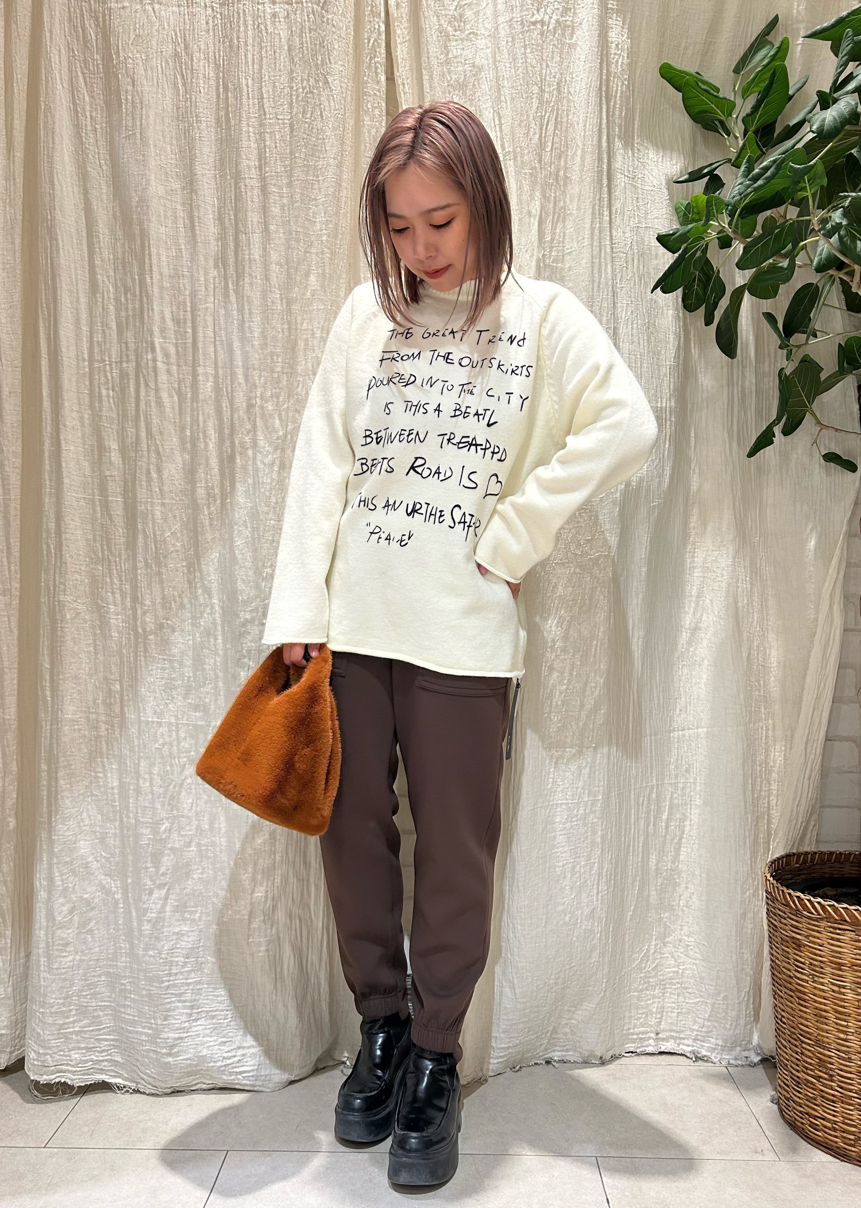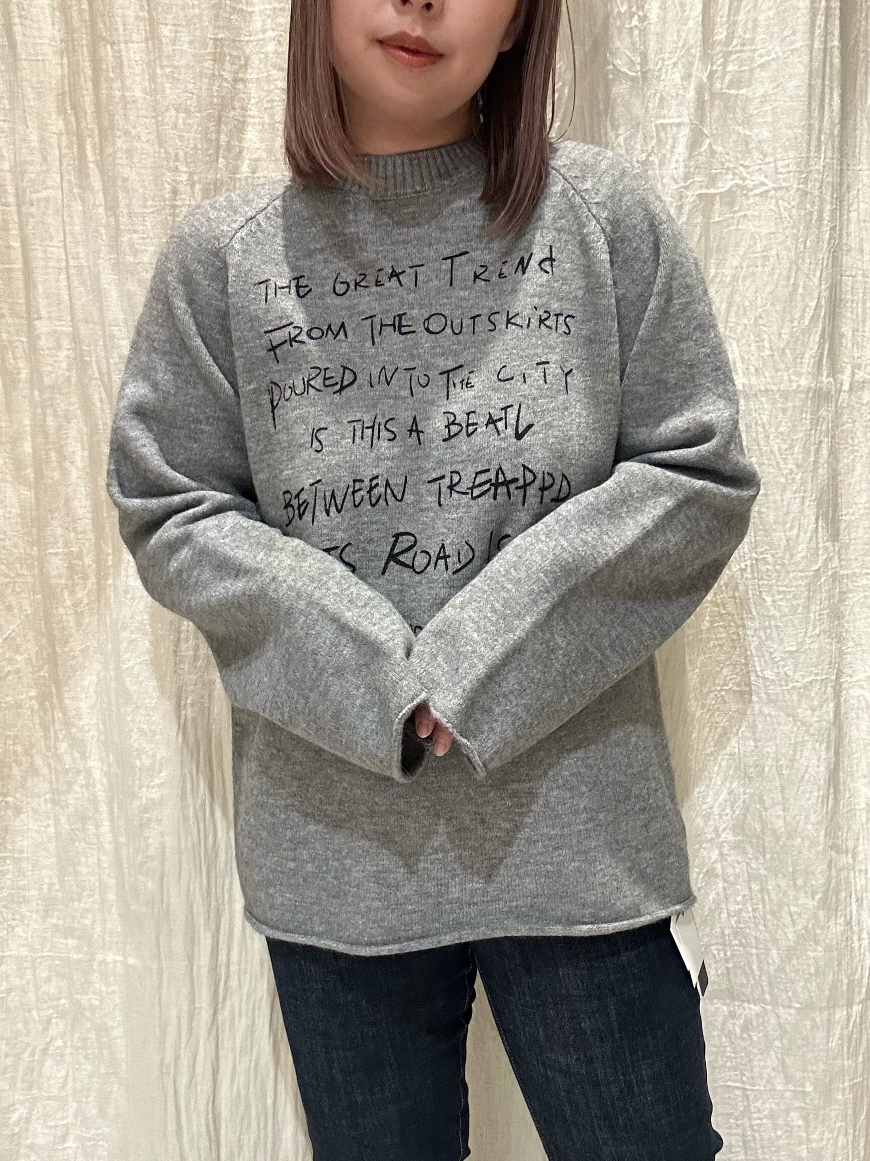 刺繍風の手書きレターロゴが目を引く、存在感のあるニットトップス。