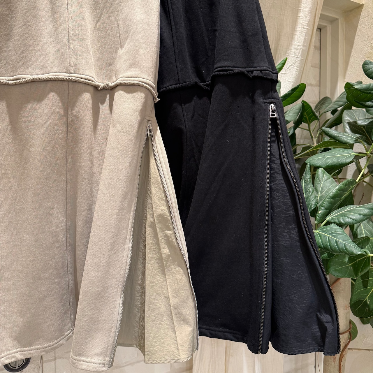 サイドにジップのついたリメイク風ペンシルスカート。ジップを開けたいただくとマーメイドスカートっぽく着用いただけます。